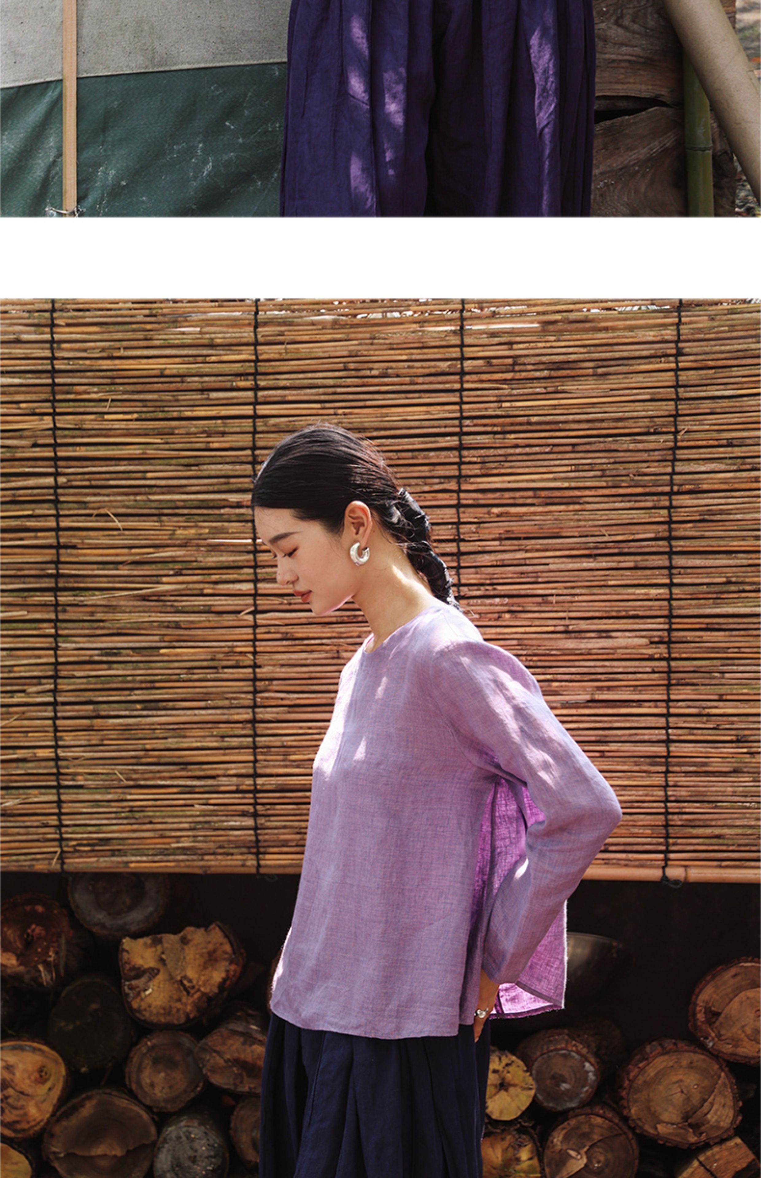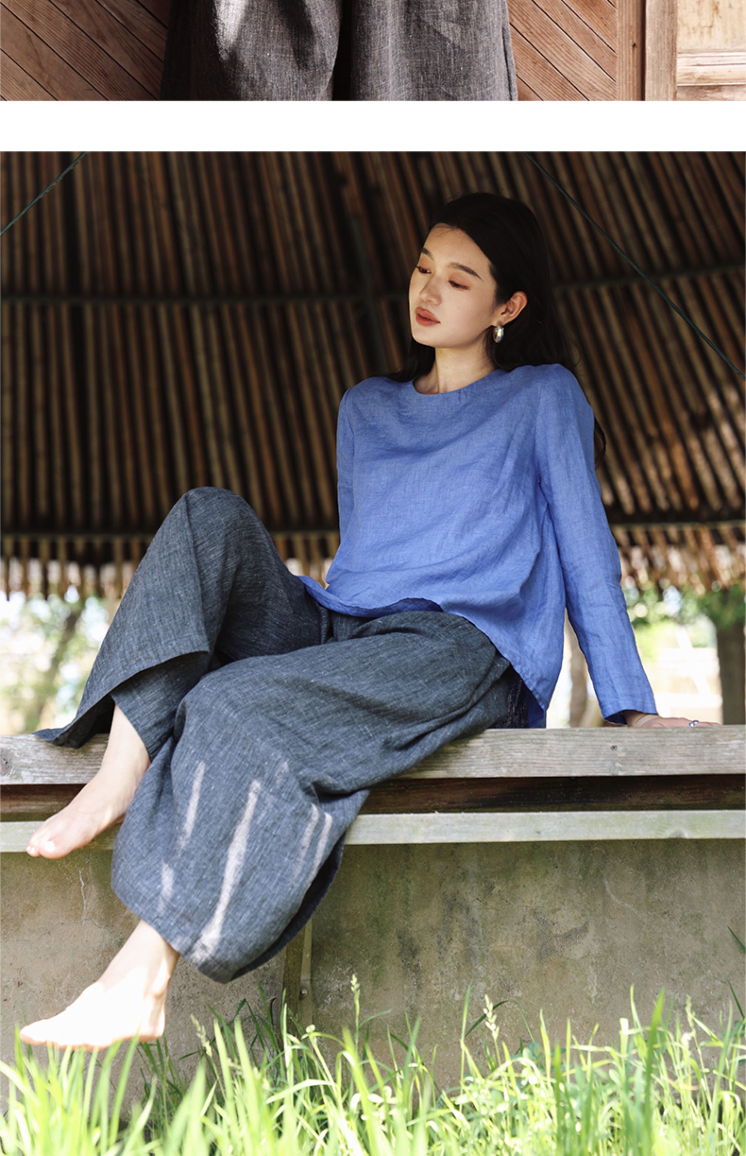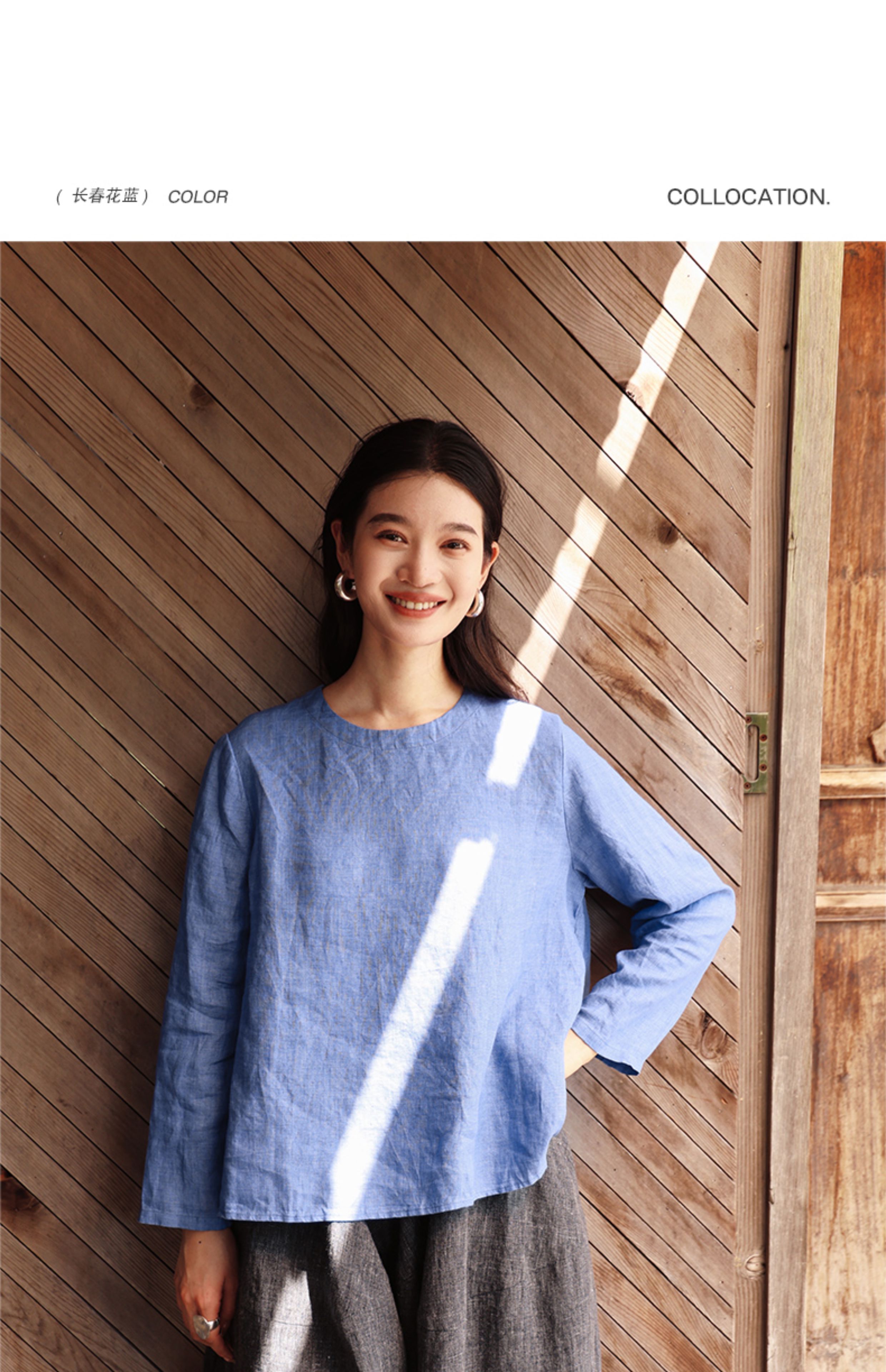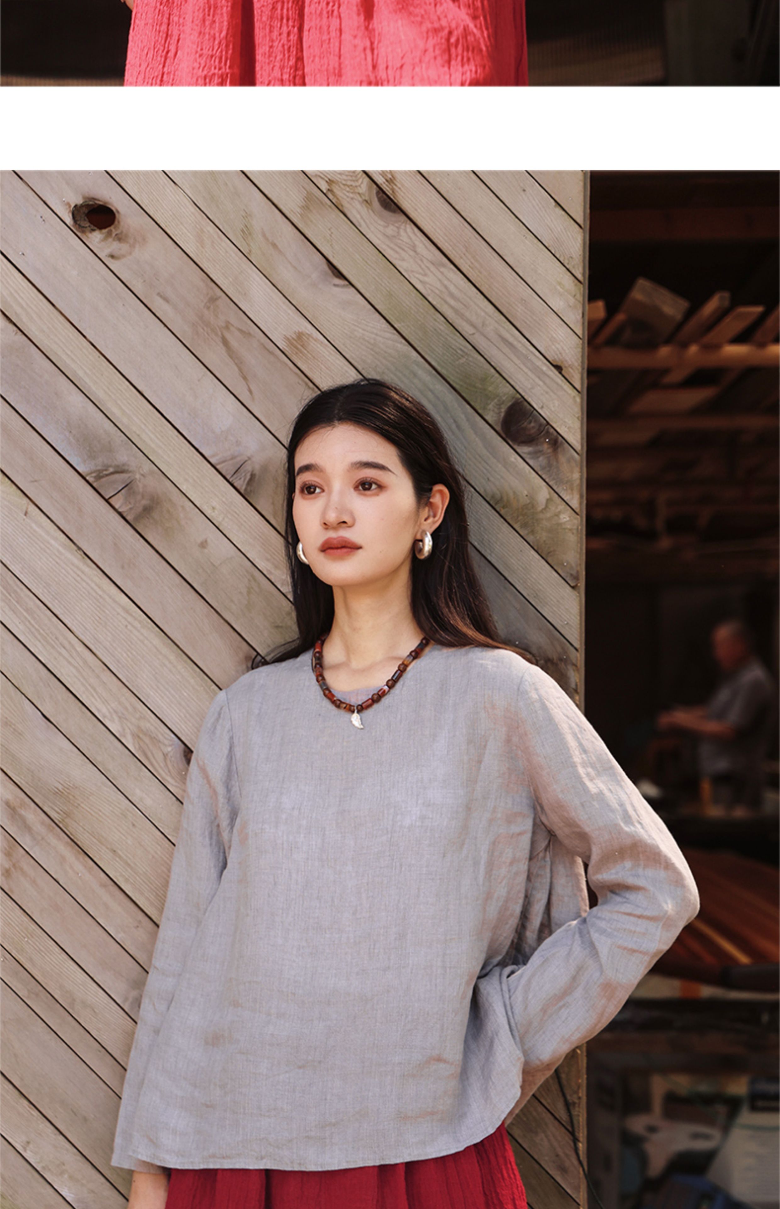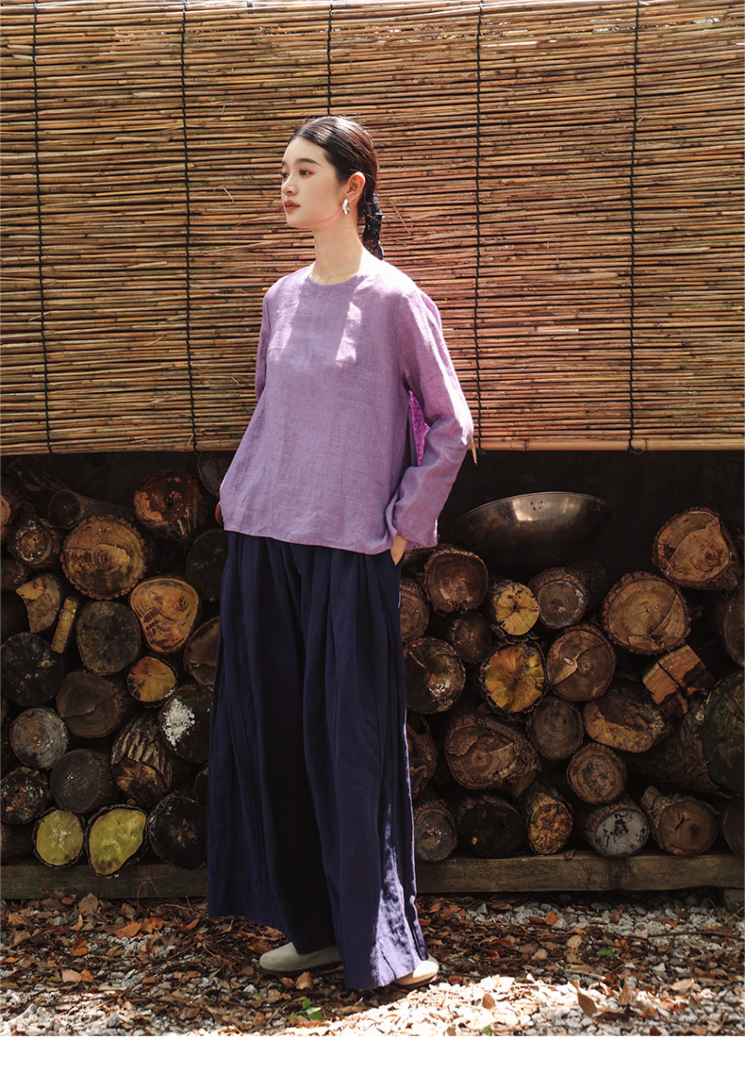 绽放女装491朵/【大山的褶皱】士林色织亚麻A褶长袖梭织T恤打底衫