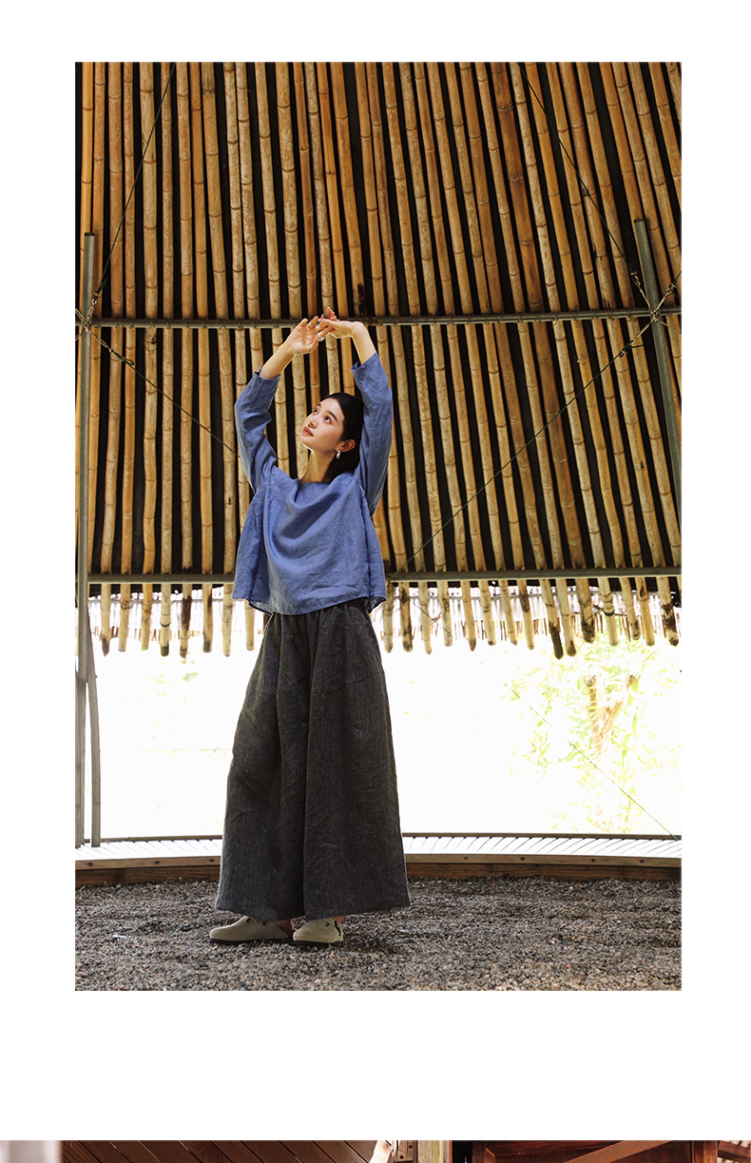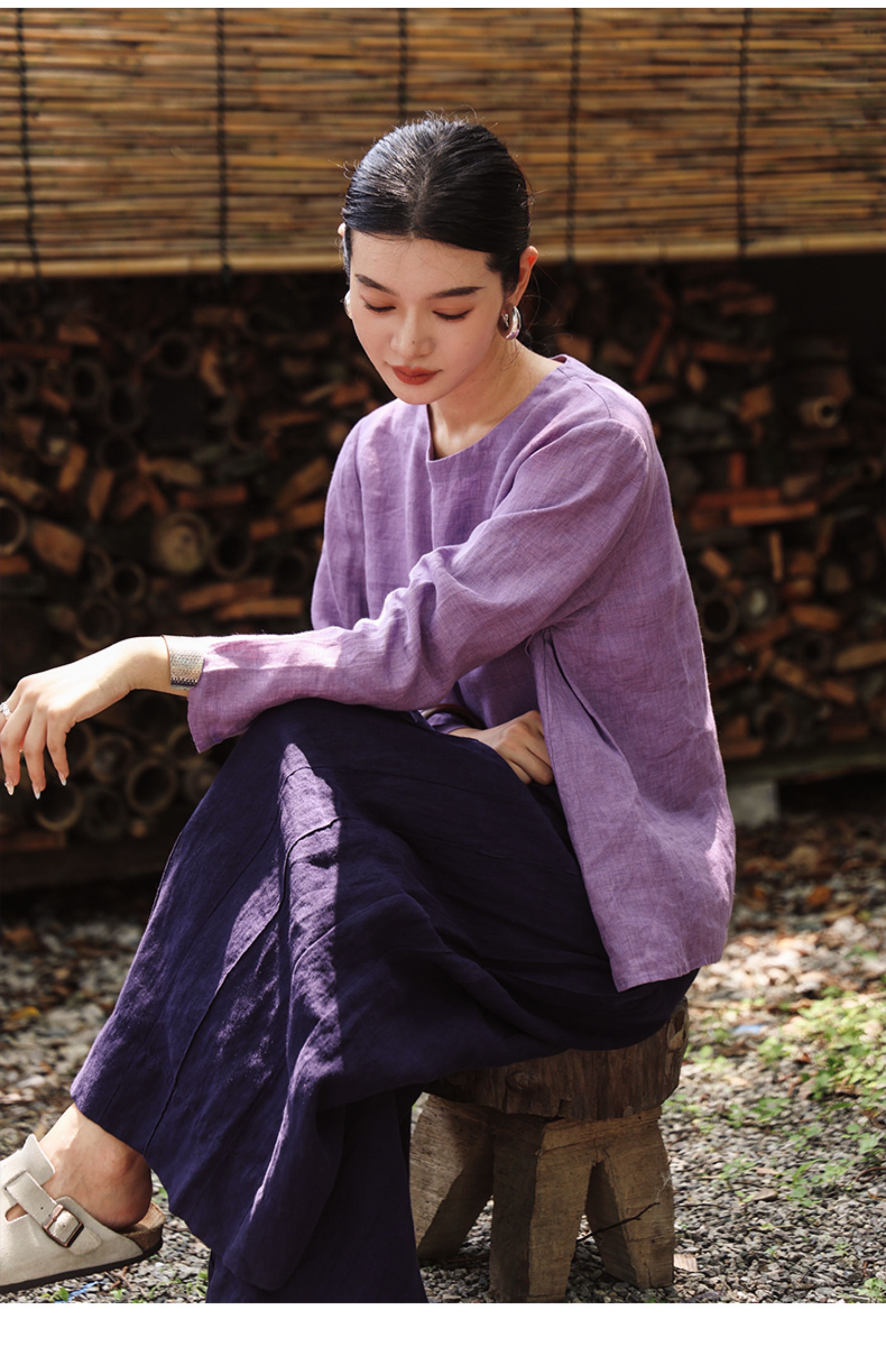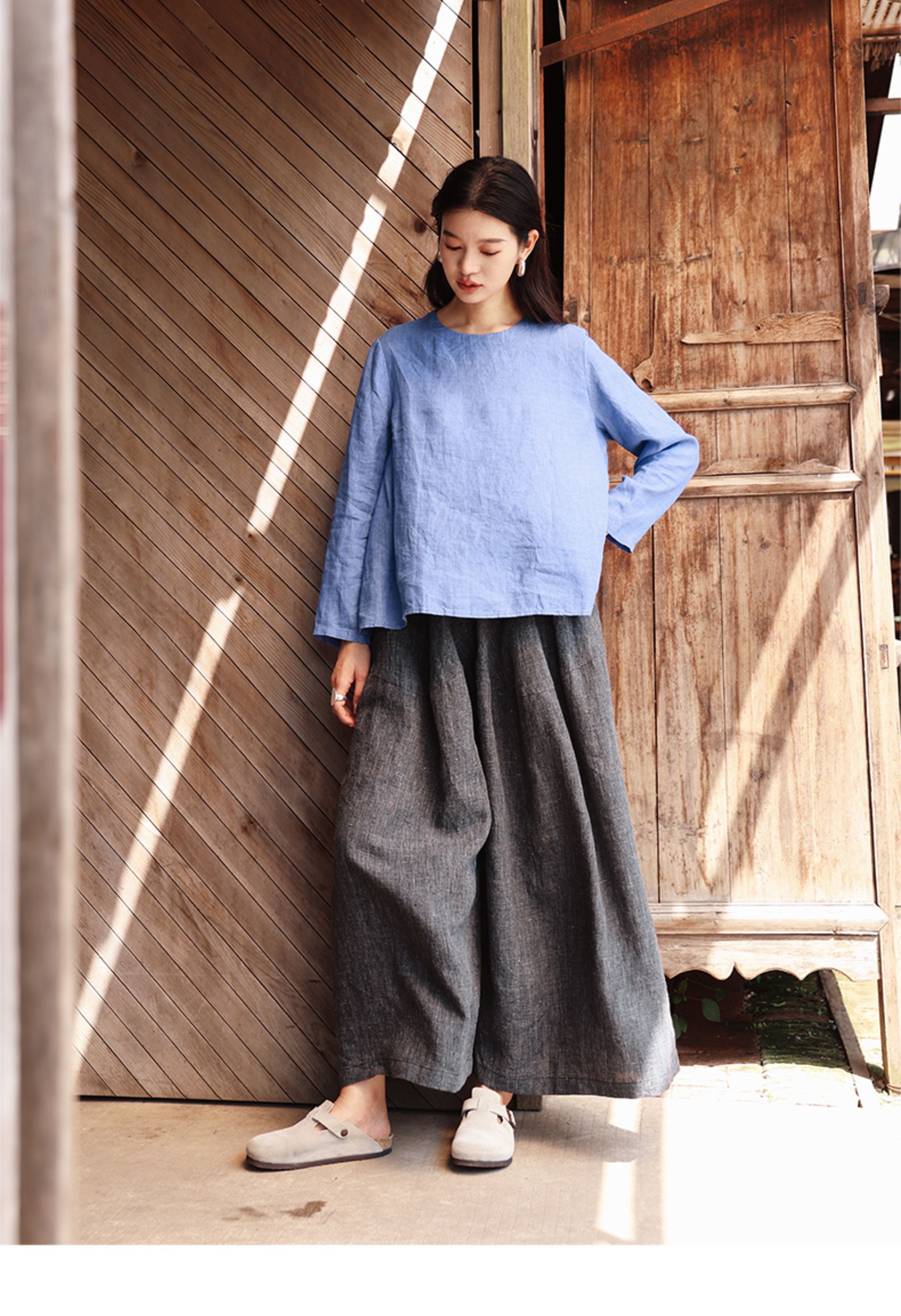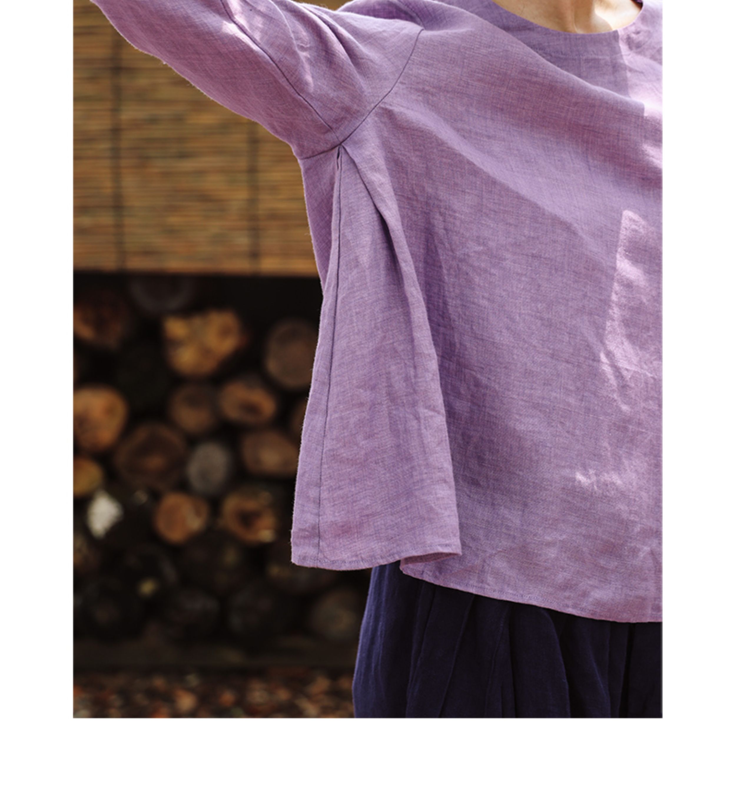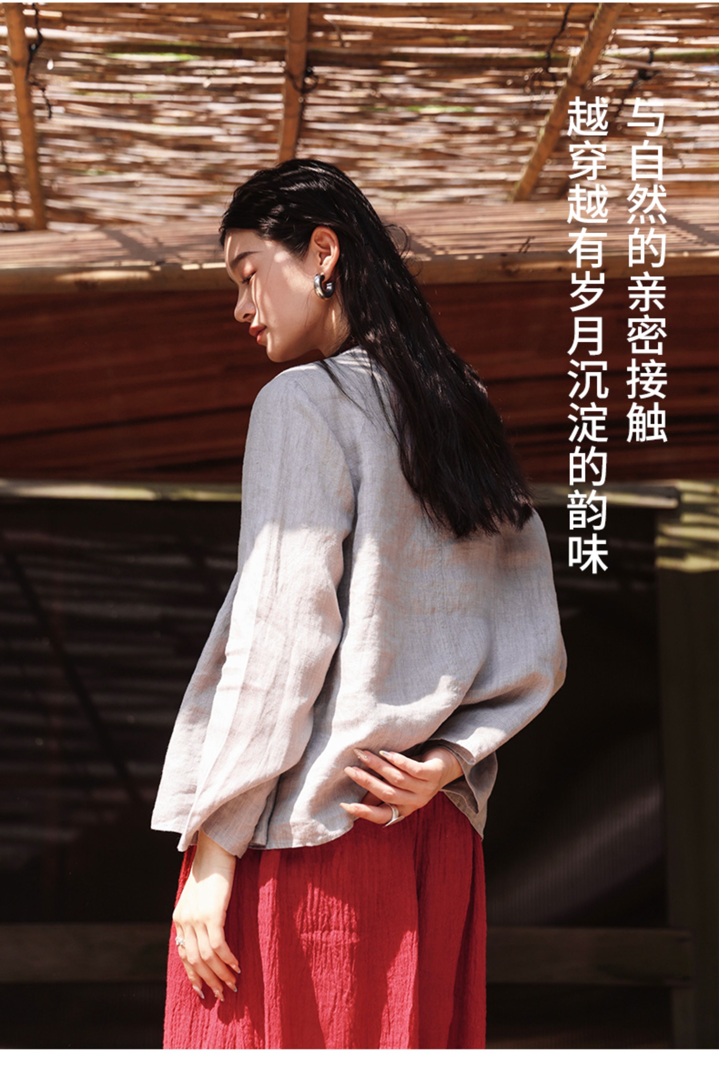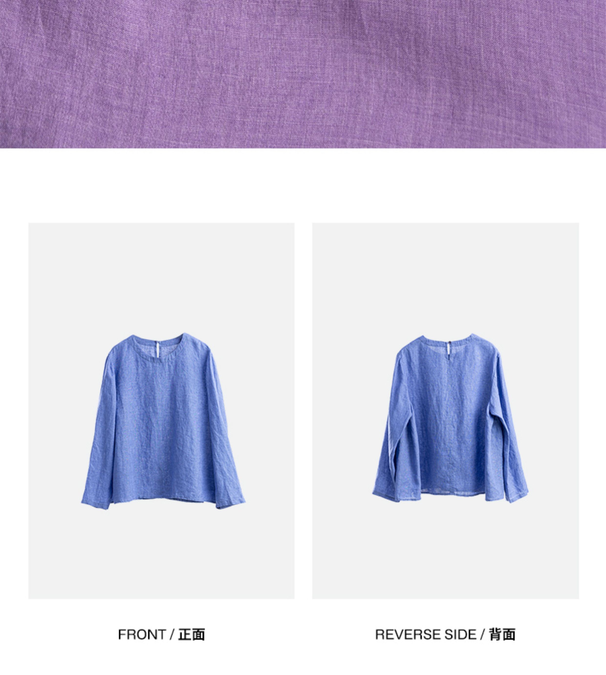 绽放女装491朵/【大山的褶皱】士林色织亚麻A褶长袖梭织T恤打底衫