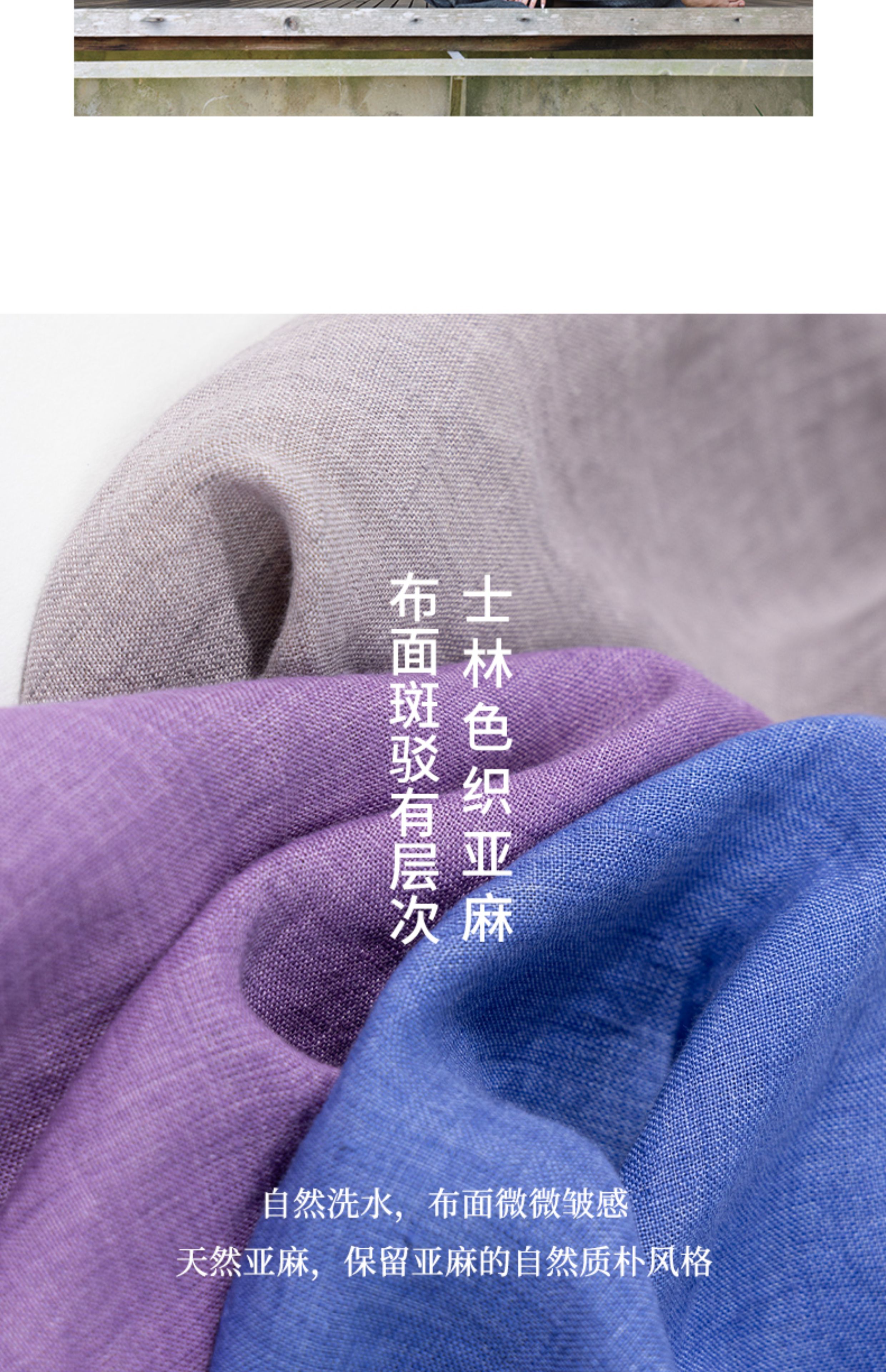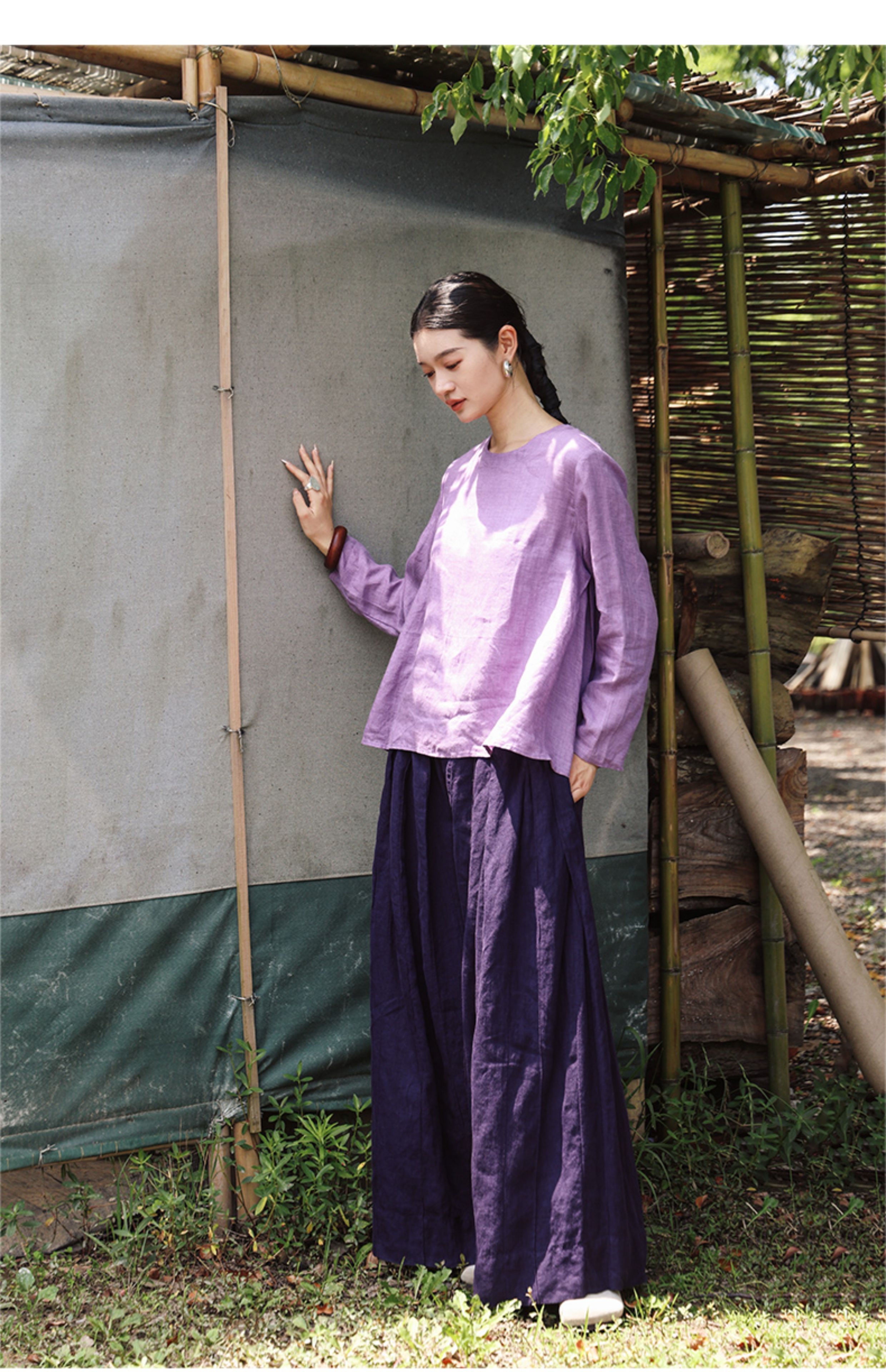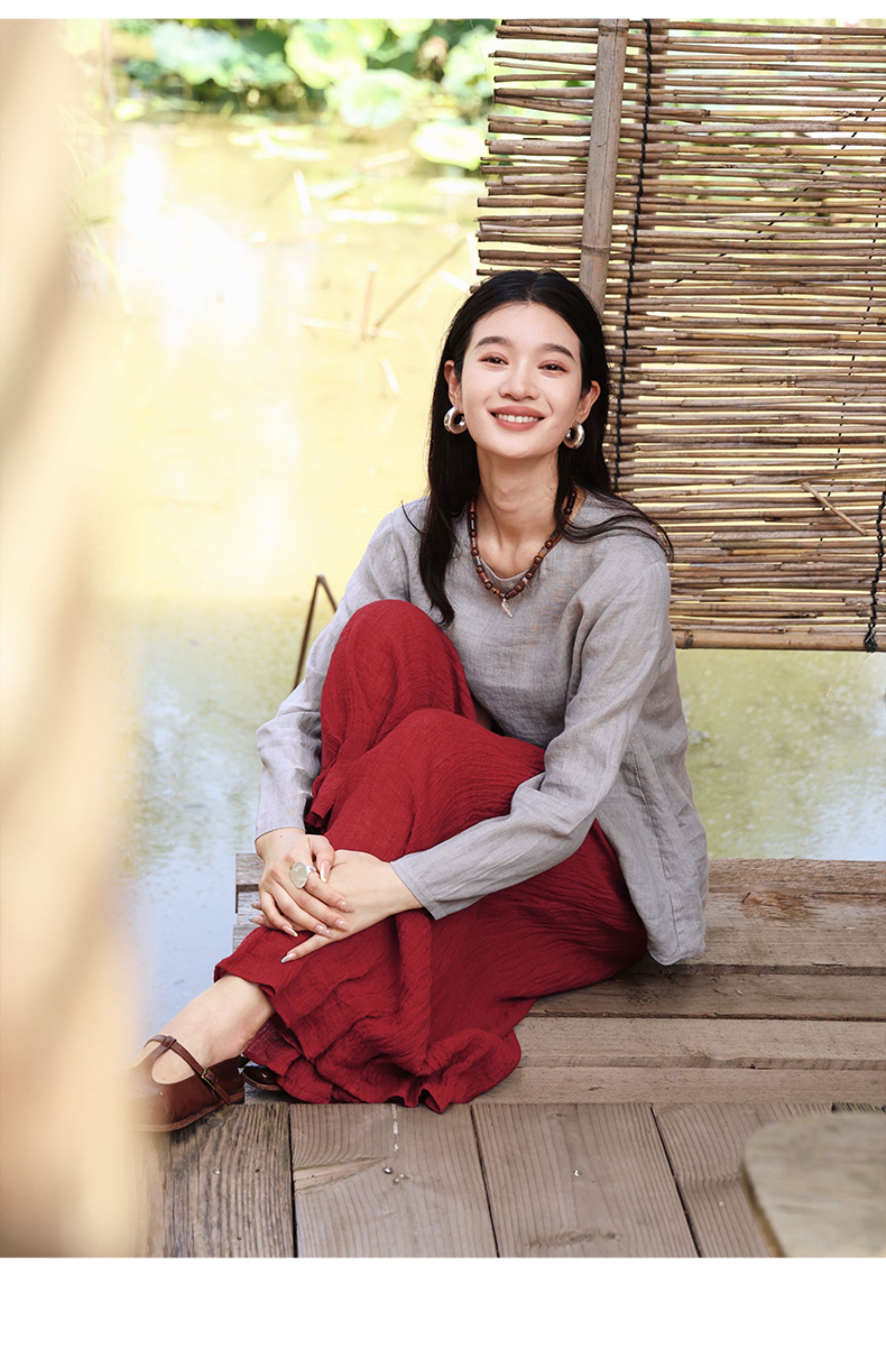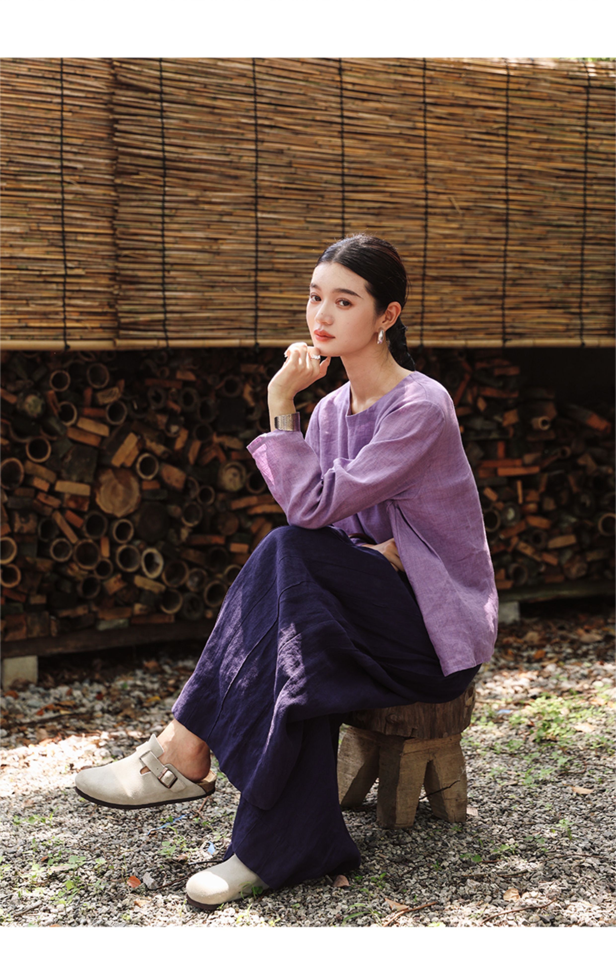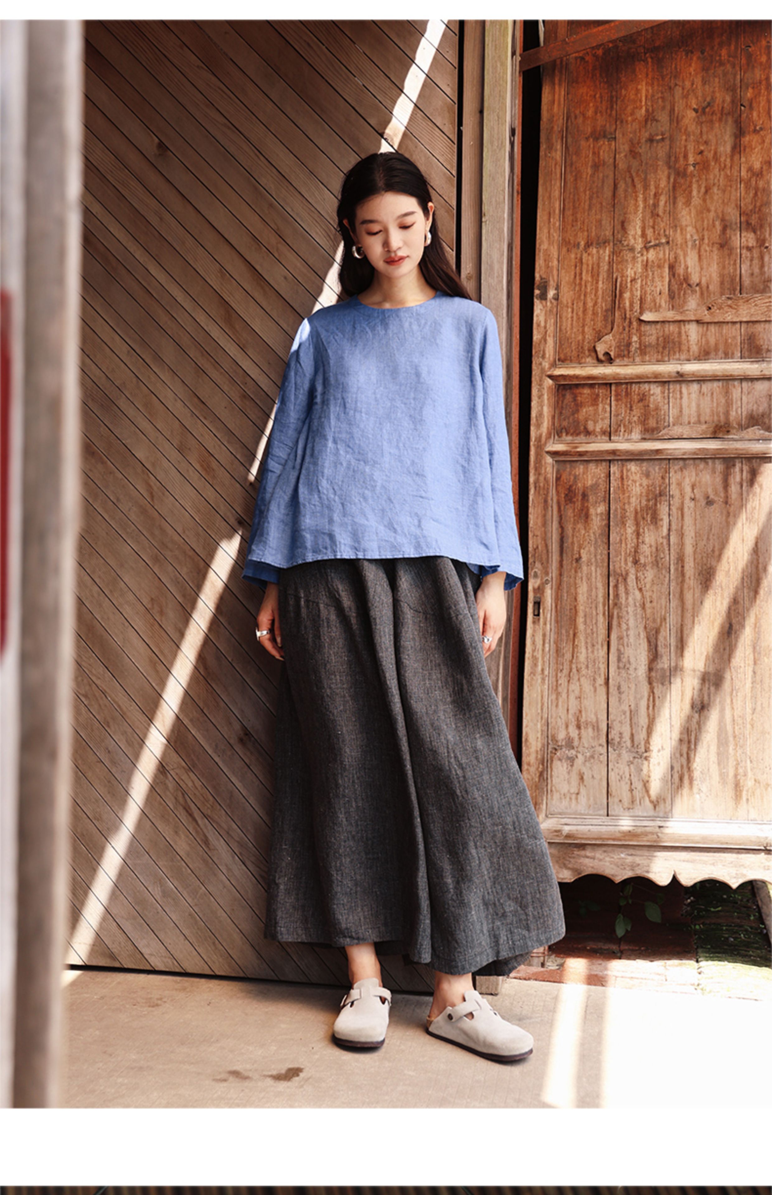 绽放女装491朵/【大山的褶皱】士林色织亚麻A褶长袖梭织T恤打底衫