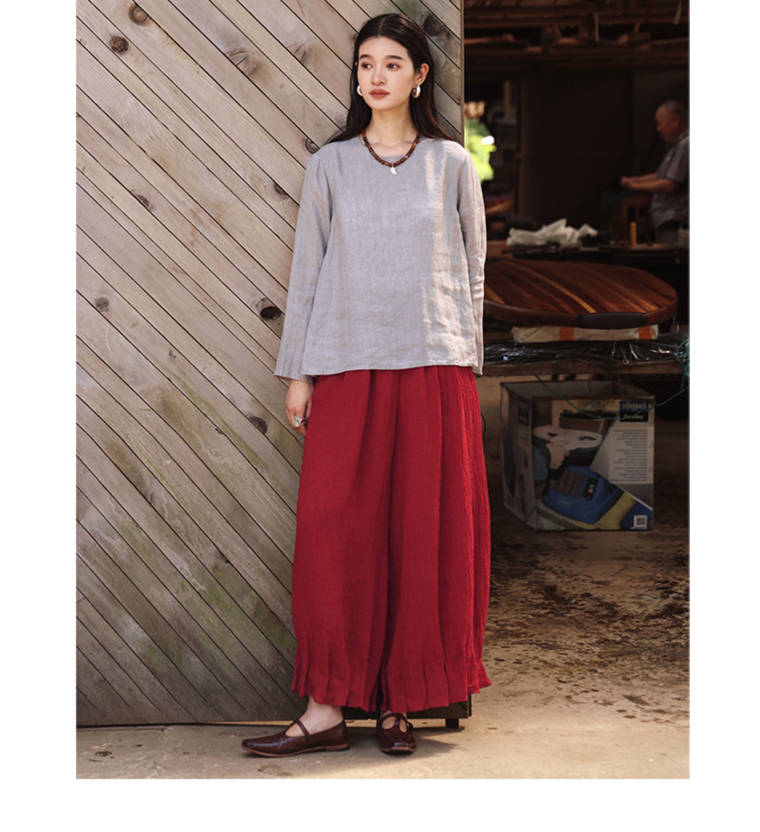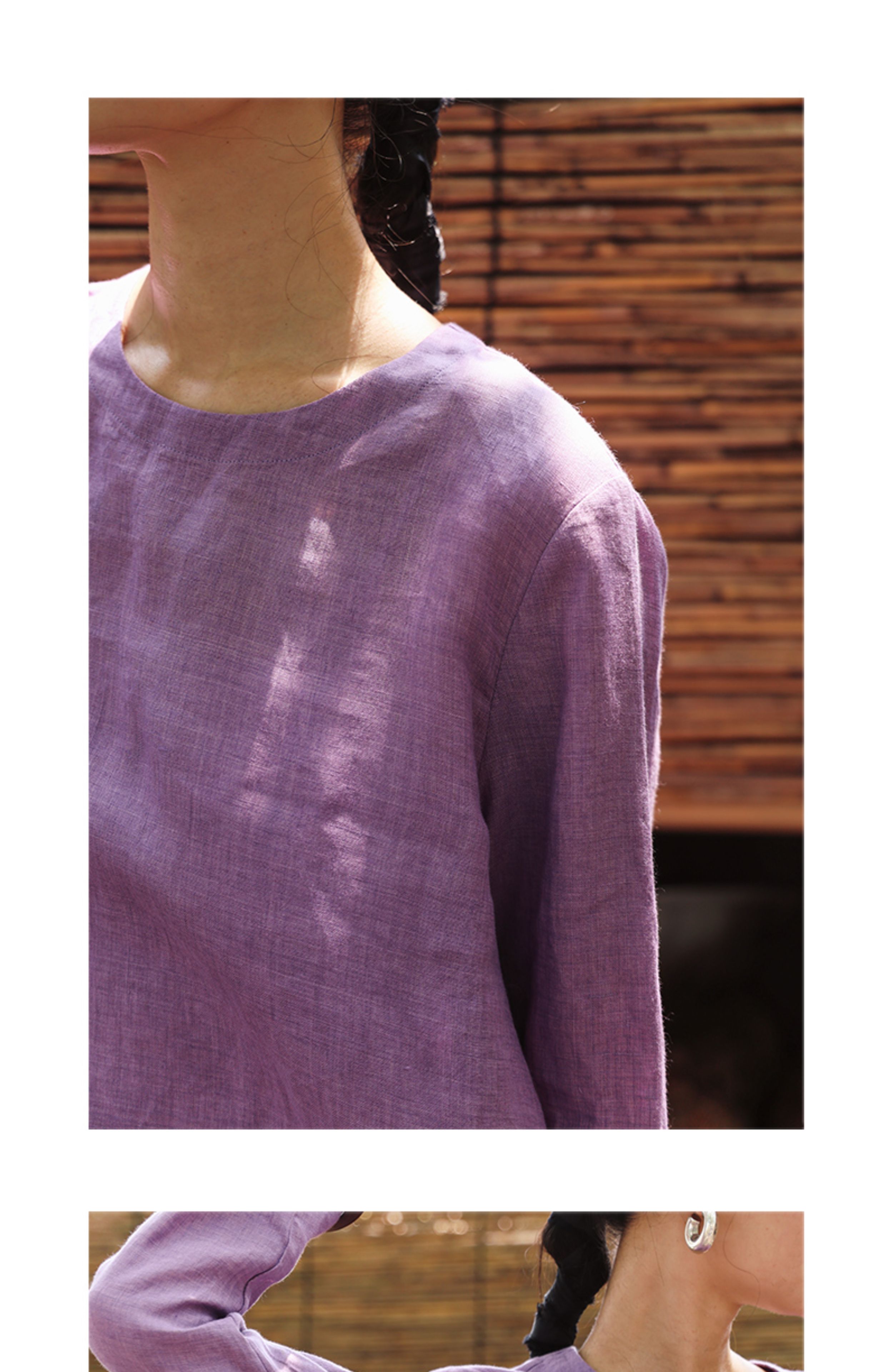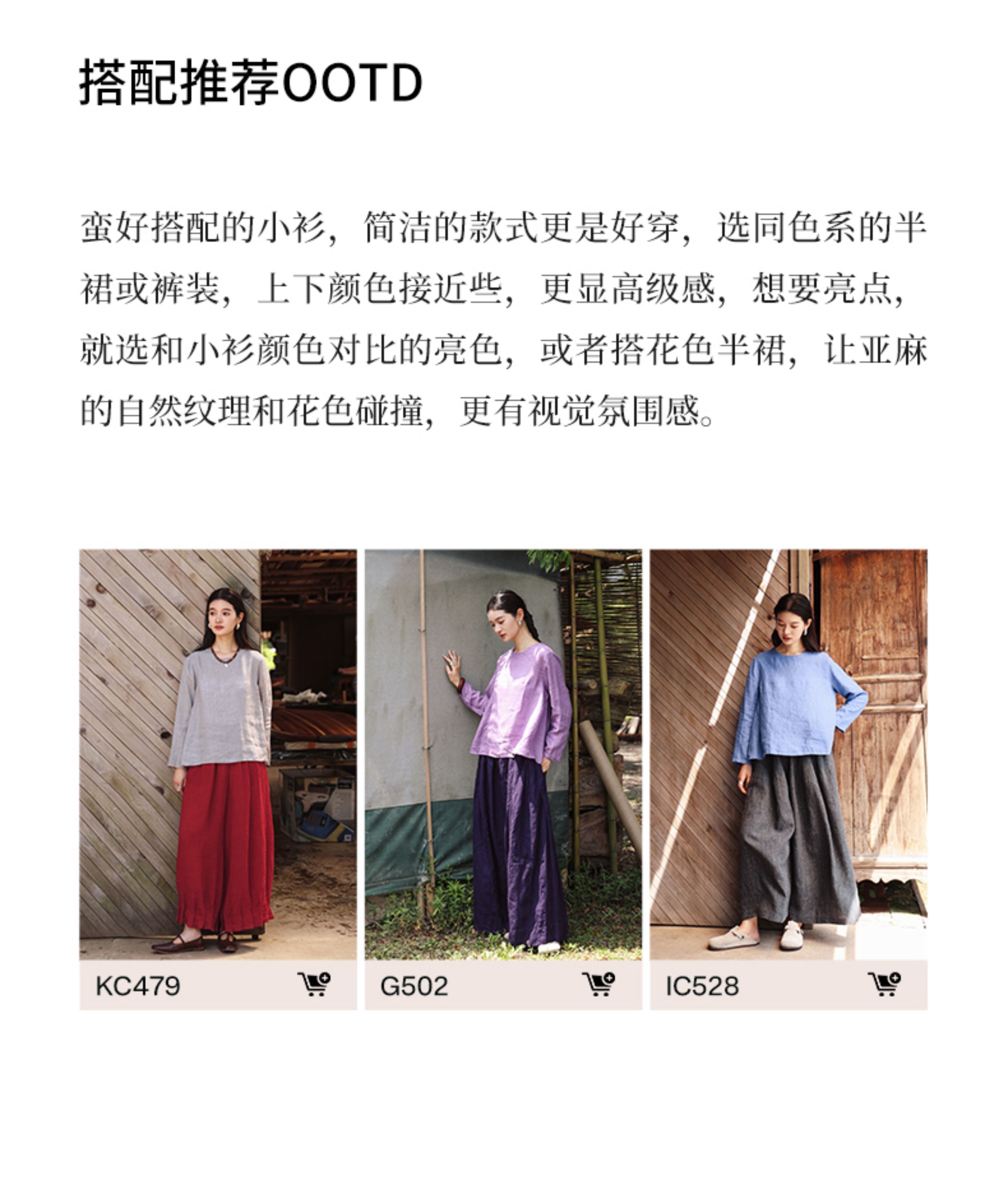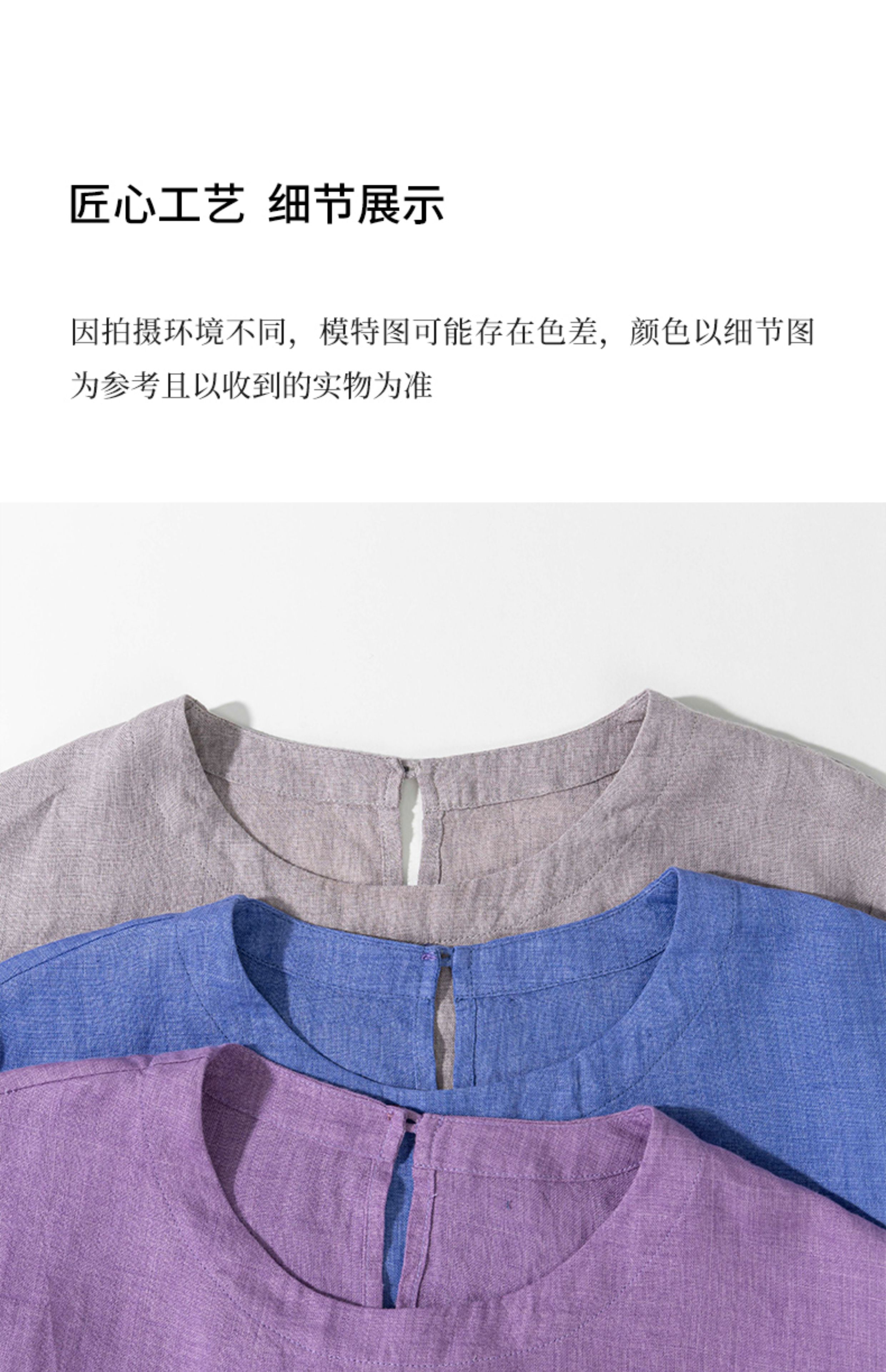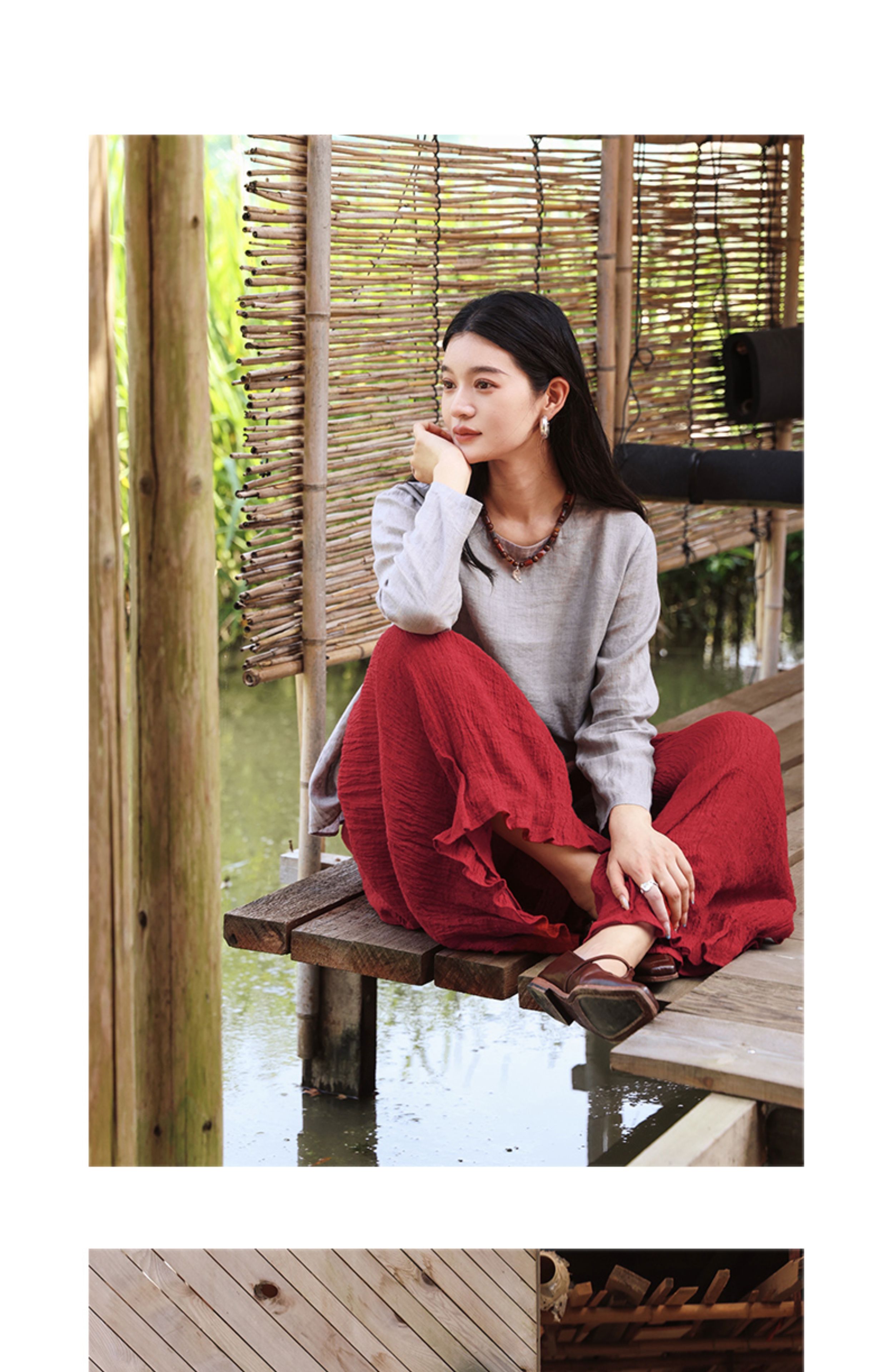 绽放女装491朵/【大山的褶皱】士林色织亚麻A褶长袖梭织T恤打底衫