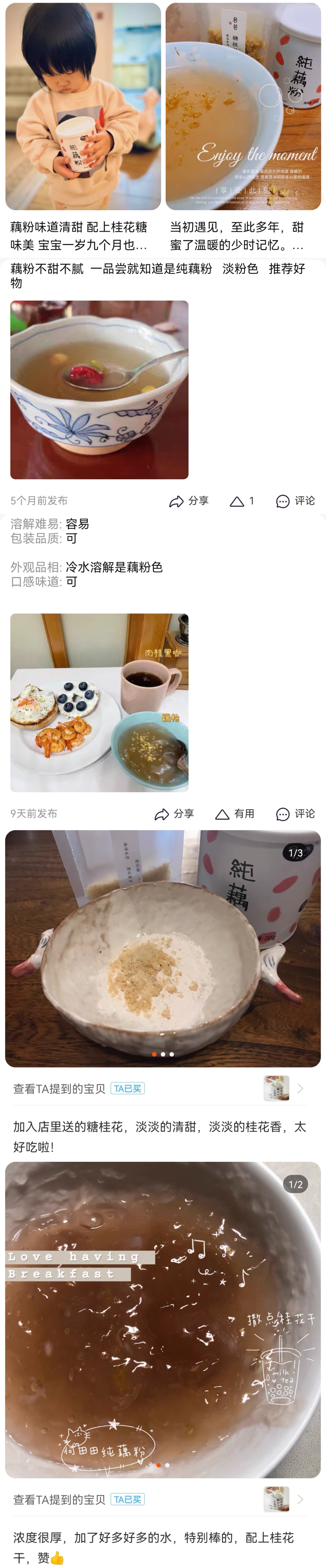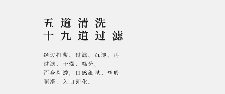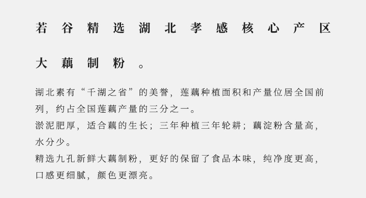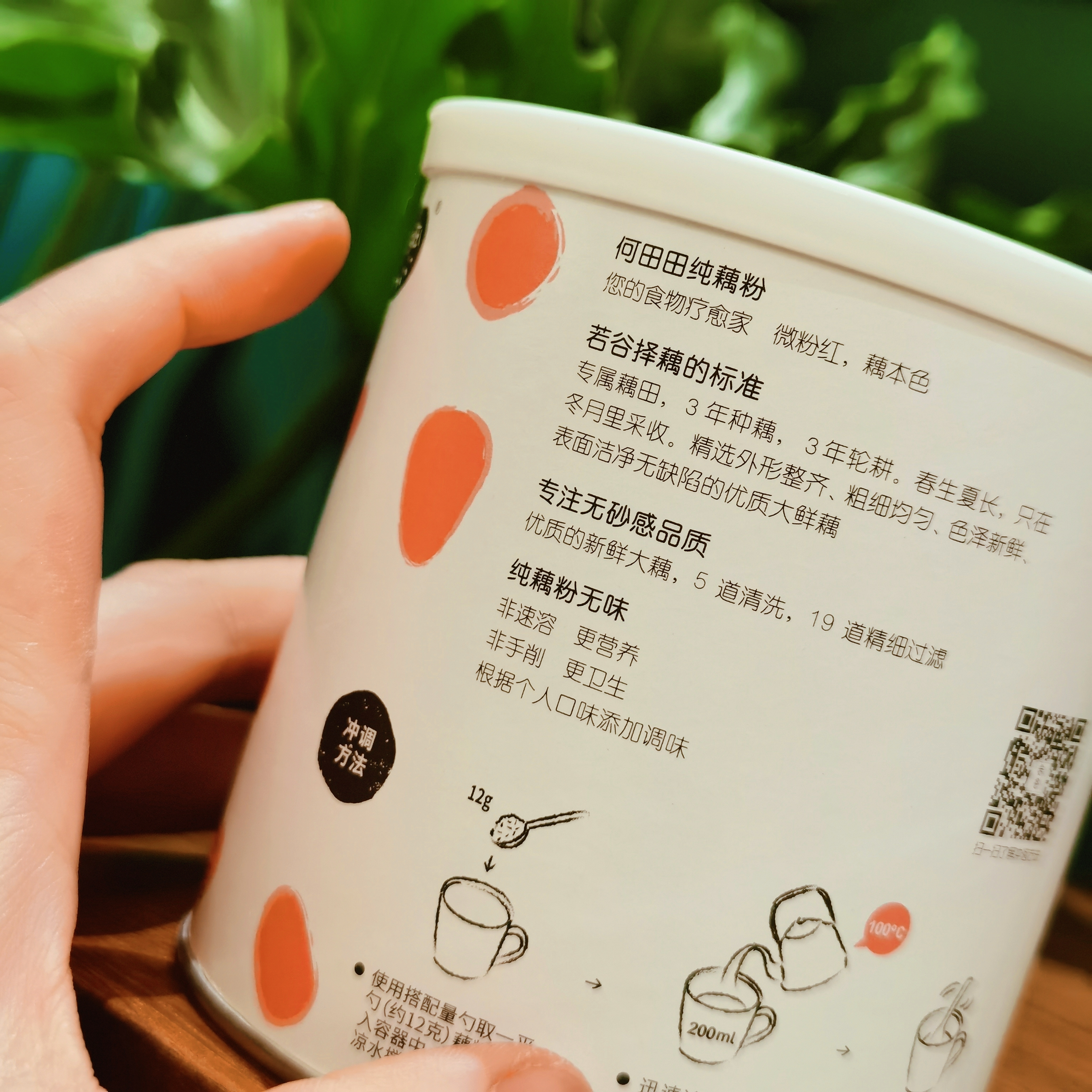 生在包邮区,我对藕粉肯定是很熟悉了,西湖藕粉也是全国闻名,从小吃到大!杭州的传统藕粉一直都是追寻原味,再撒点干桂花,吃起来粉滑,口感很细腻。若谷追求自然江南味道,所以采用古法制作,不额外添加木薯粉、葛根粉或别的淀粉,连糖都没有加哦,吃起来就是纯纯的藕香。用的是湖北孝感核心产区的九孔新鲜大藕,精工研磨,经过打浆、过滤、沉淀、再过滤、干燥、筛分共五道清洗+十九道过滤,层层筛选,粉质非常细腻,冲泡之后吃起来很顺滑,不会有不均匀的粗颗粒,很好地保留了藕的本味,颜色也更漂亮,是有点粉粉的!