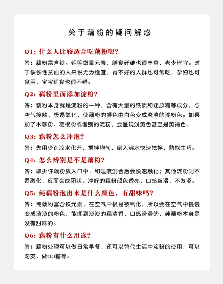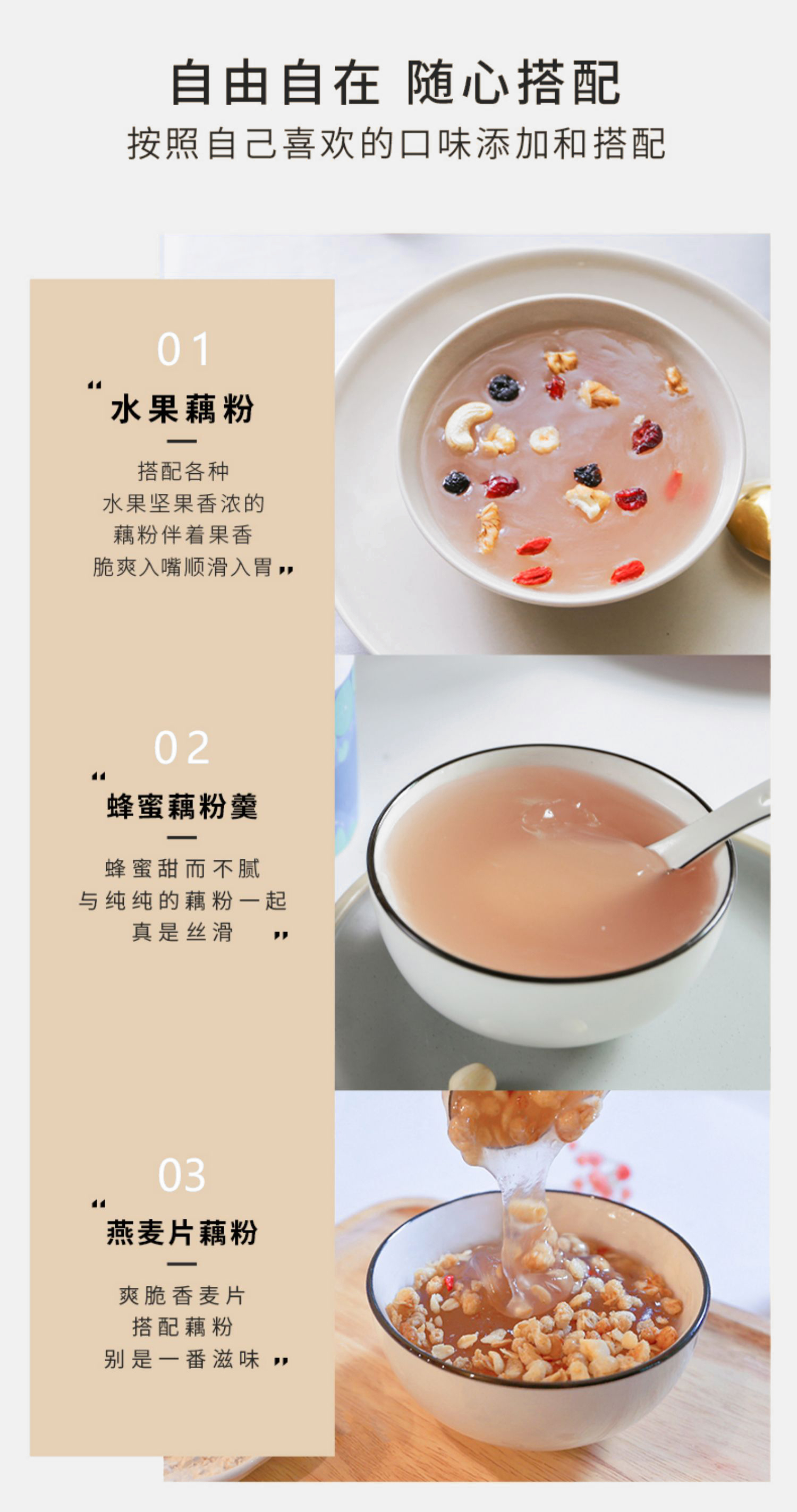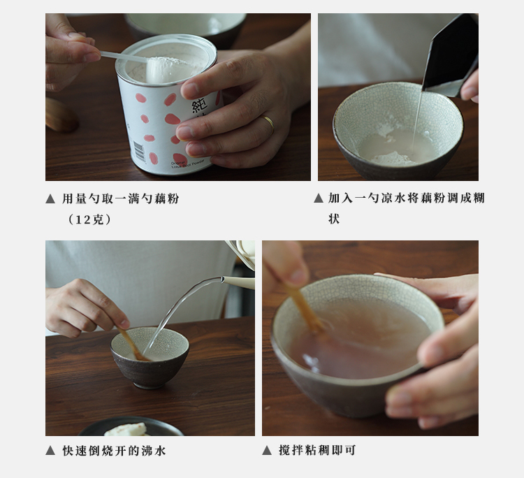 食用方法:用量勺取一勺藕粉,加入少许凉水将藕粉调成糊状,再快速倒入烧开的沸水,搅拌至粘稠即可