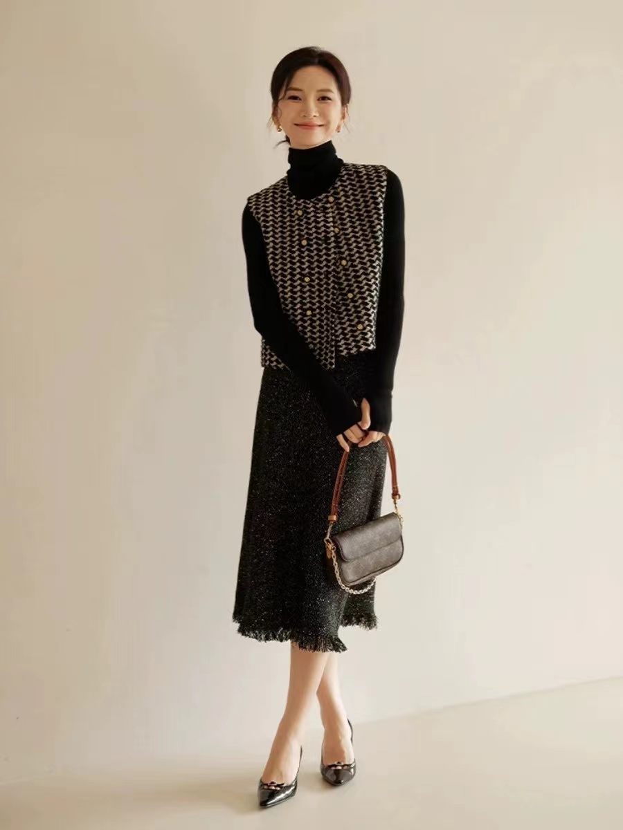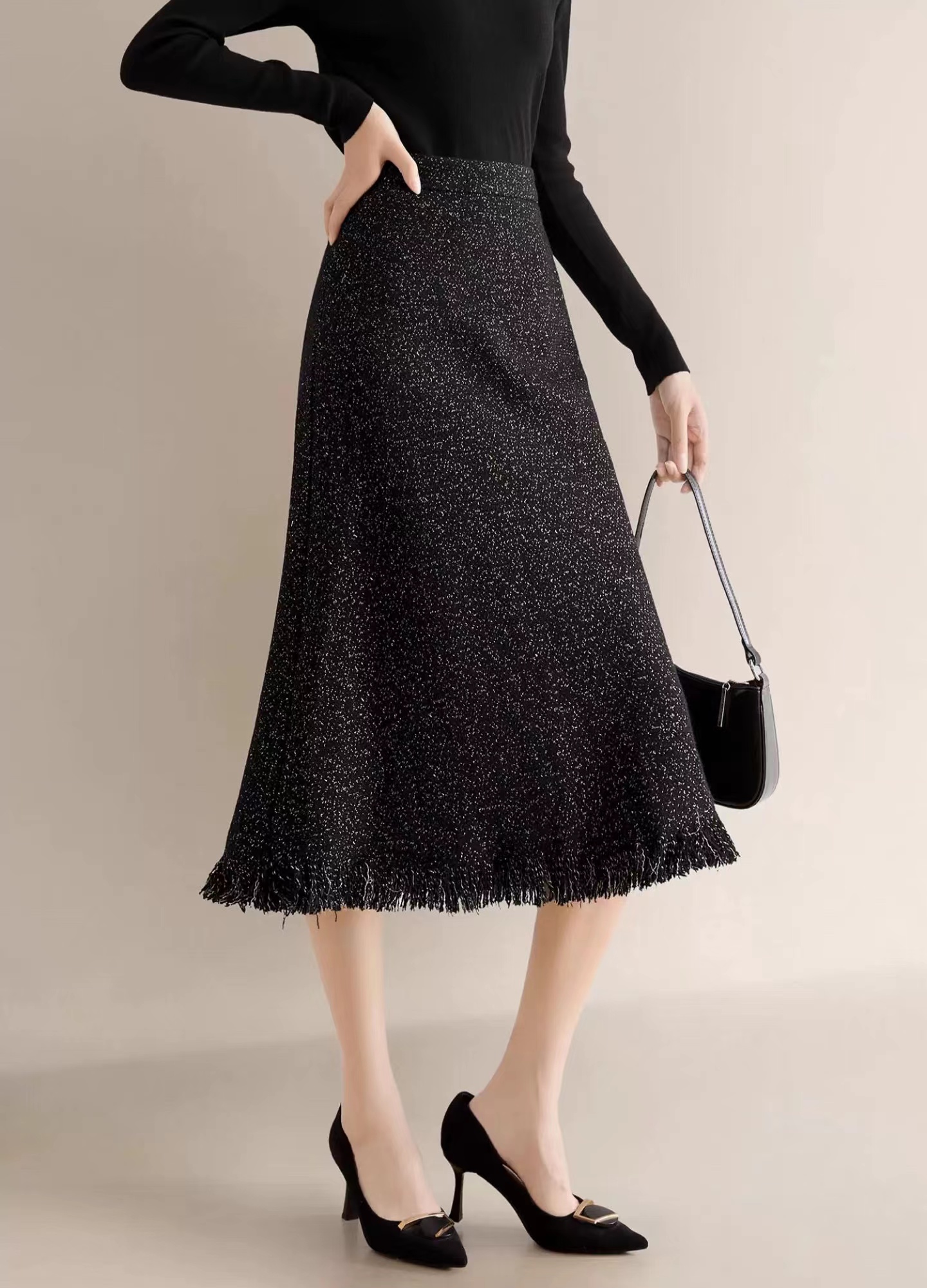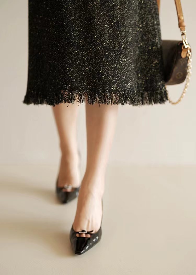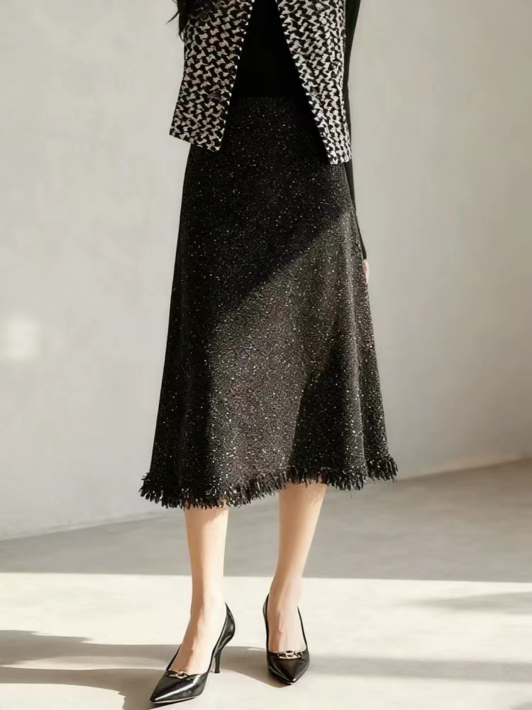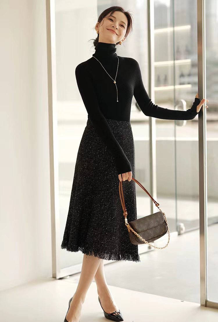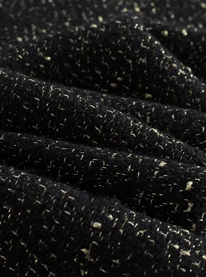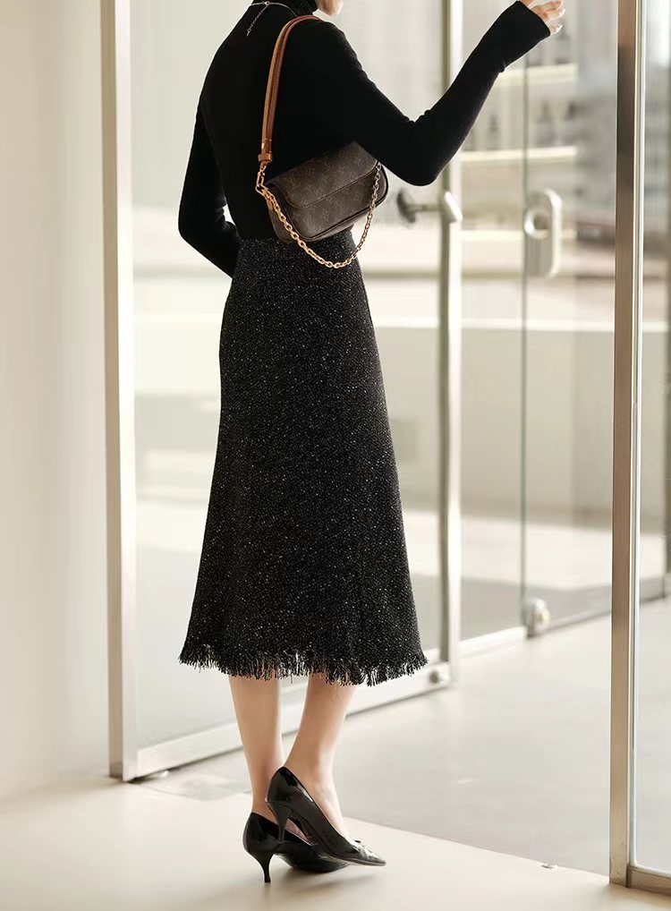 小香风肌理金葱暗闪斜裁显瘦小鱼尾流苏半身裙 小香风显瘦流苏A字半身裙!自带显著显瘦效果,流苏鱼尾的剪裁不仅增添了一丝俏皮感,更在行走间展现出无与 伦比的动感美!以黑色粗纺斜纹编织纱线做底,形成立体斜纹肌理,而且是粗中有细的,加入金丝,细闪细闪的!!!如绽放在夜空中的烟花般绚烂!定制面料带来蓬松丰厚的手感,绵软有韧性,有一定厚度,抗皱但不软塌光泽感强,非常漂亮!还可以抵御深秋的冷风寒意~A字裙型显高显瘦,裙长至小腿拉长腿部线条,显得高挑迷人;侧边采用隐形拉链开合,拉链顺滑不卡顿,穿着方便舒适;高腰后侧半松紧设计,不挑腰围,包容性更高。后面有做了小开叉设计,内里配有柔软的内村,亲肤透气内衬,不磨皮肤;下摆做了流苏工艺设计,有做织带固定,不易脱线,大约3.5公分长度的流苏,形成特别美的鱼尾下摆,形成不经意间的精 致,整条裙子满满的细节感!