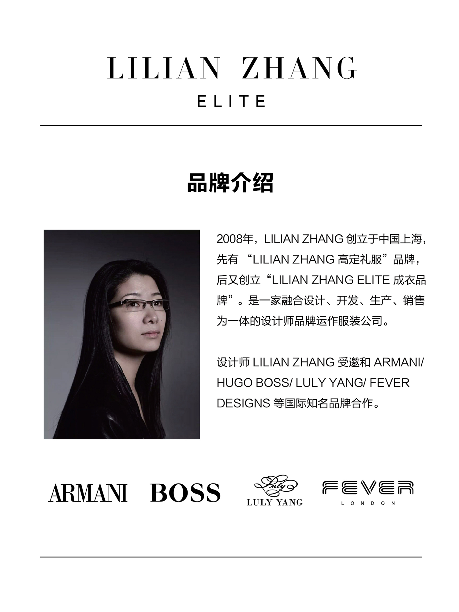 - LILIAN ZHANG ,创立于2008年,为 ARMANI 等国际品牌设计创作时装。 LILIAN ZHANG 坚持原创设计、坚持立体剪裁、坚持颠覆奢侈品价格、坚持简约经典 ,深受时尚女性喜爱。