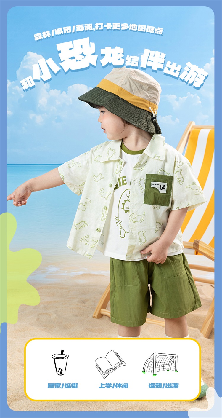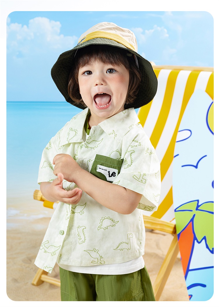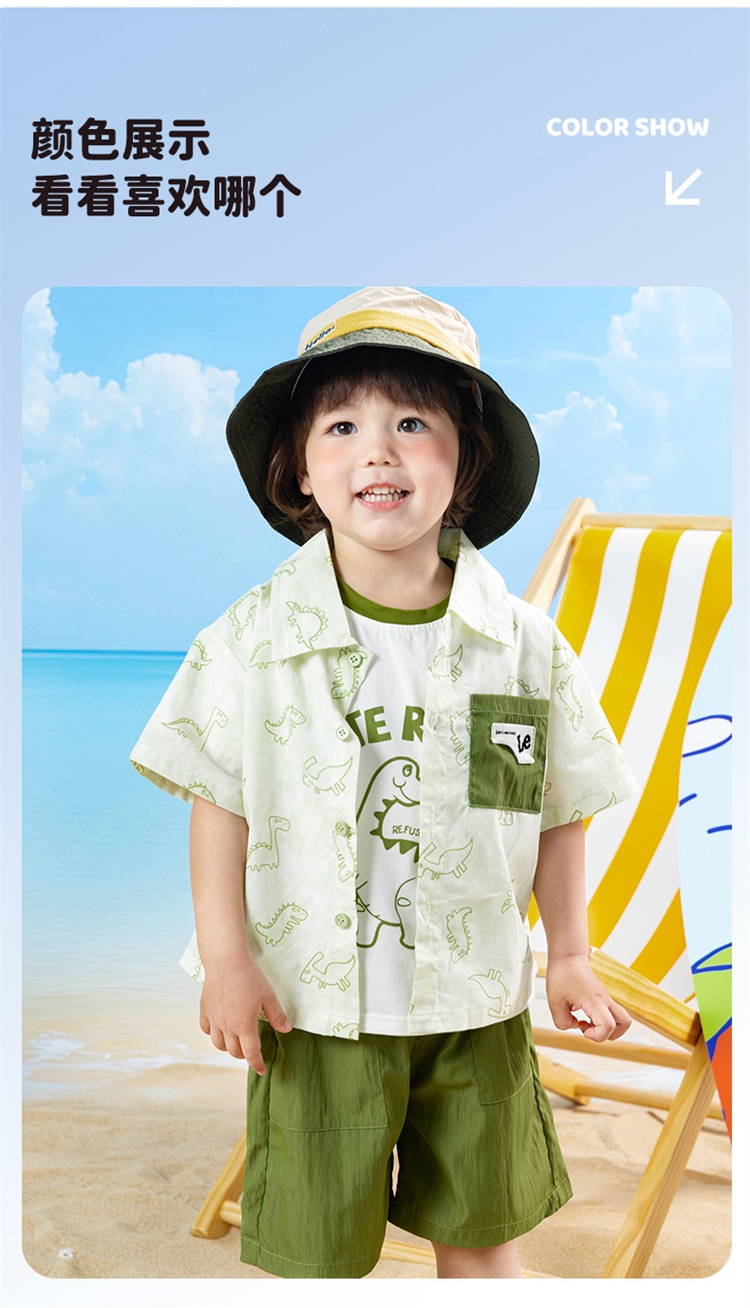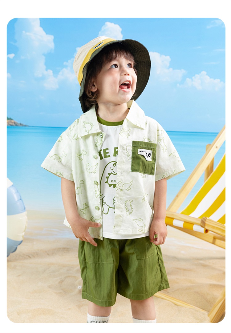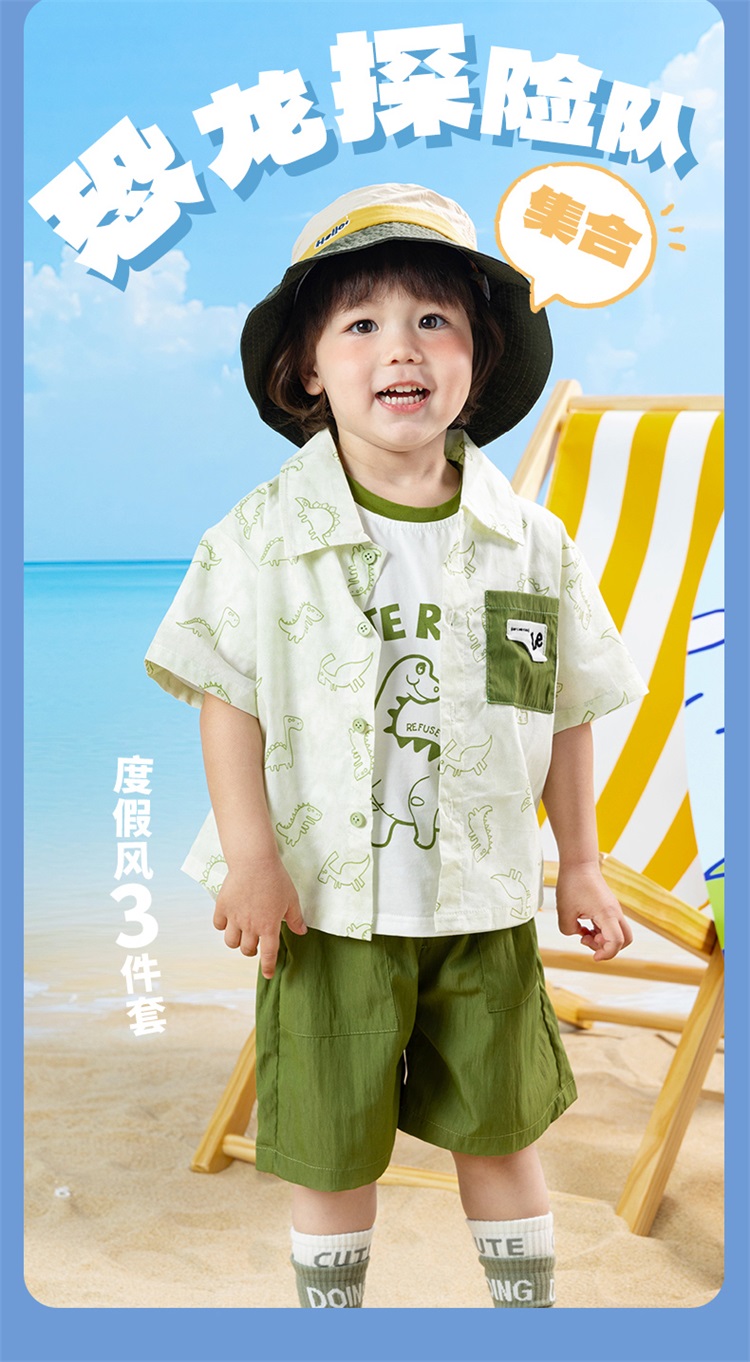 贝贝怡【满印恐龙三件套】2025夏季新款男童清凉透气衬衫T恤短裤三件套ZB2ET054