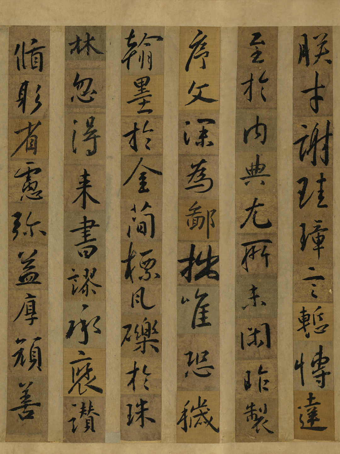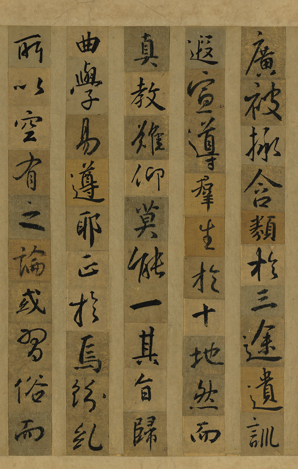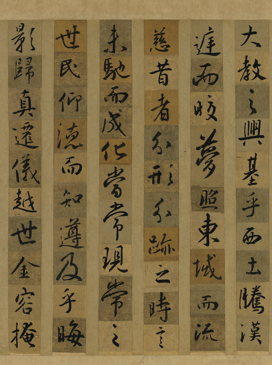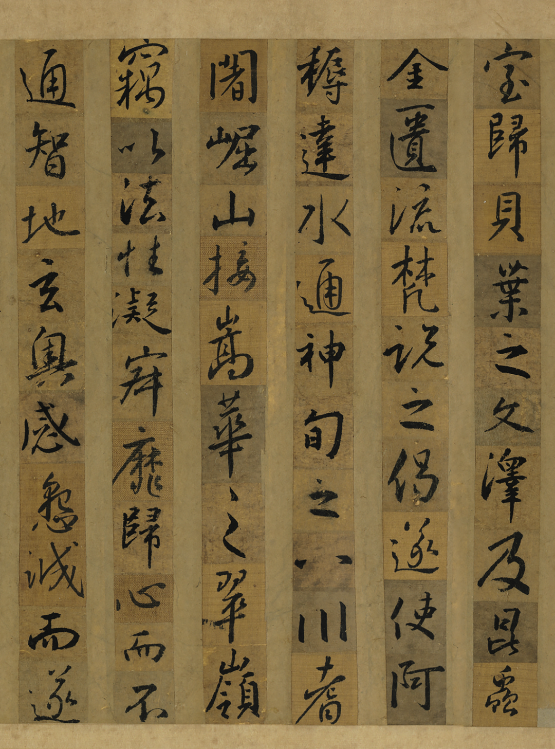 我们还真在台北故宫找到了一件墨迹本的《怀仁集王羲之圣教序》,上面文字的墨色浓淡、枯润变化,细节处用笔的牵连映带都清晰可见,胜过传世拓本100倍不止。这样说会不会夸张?