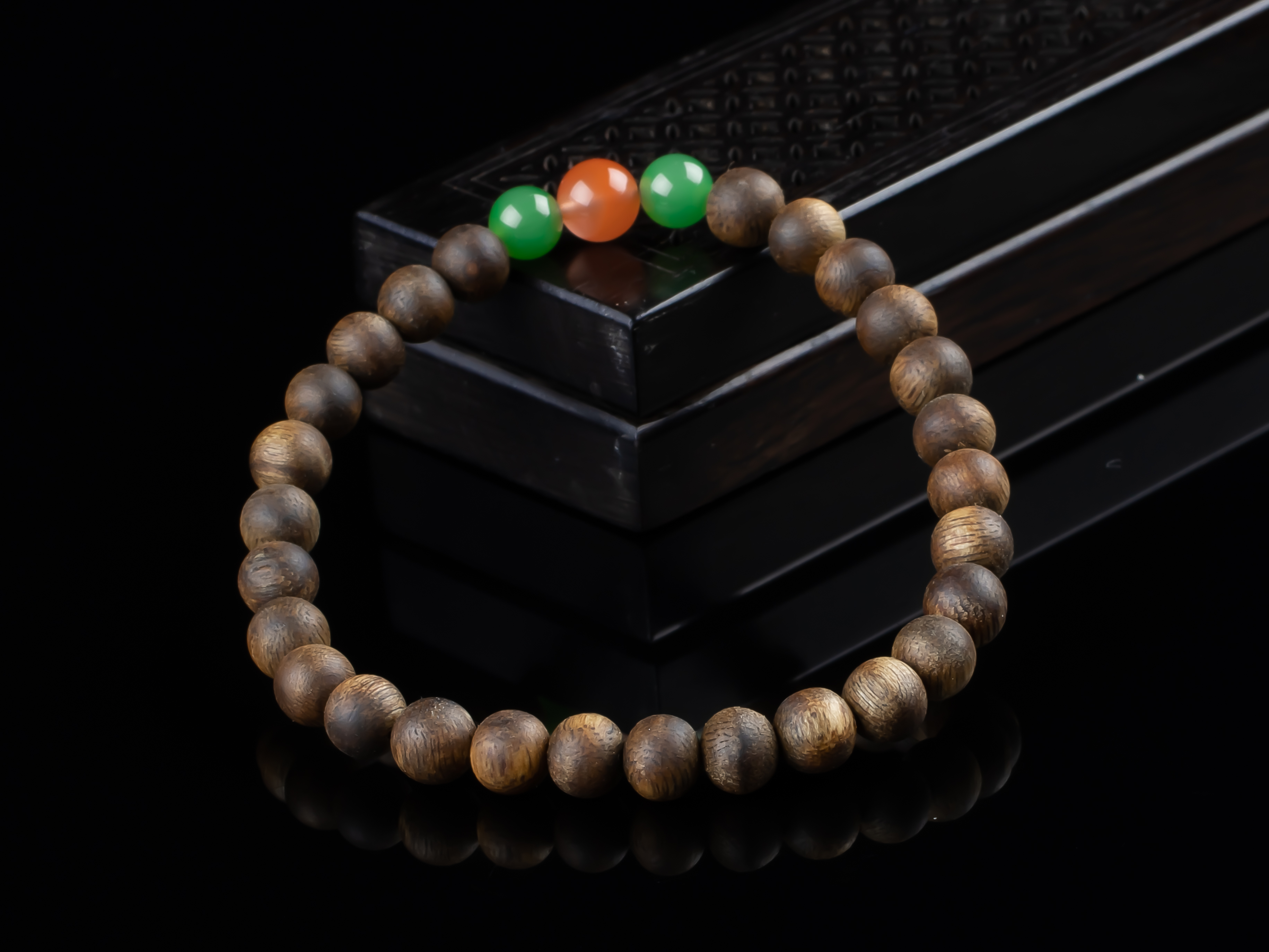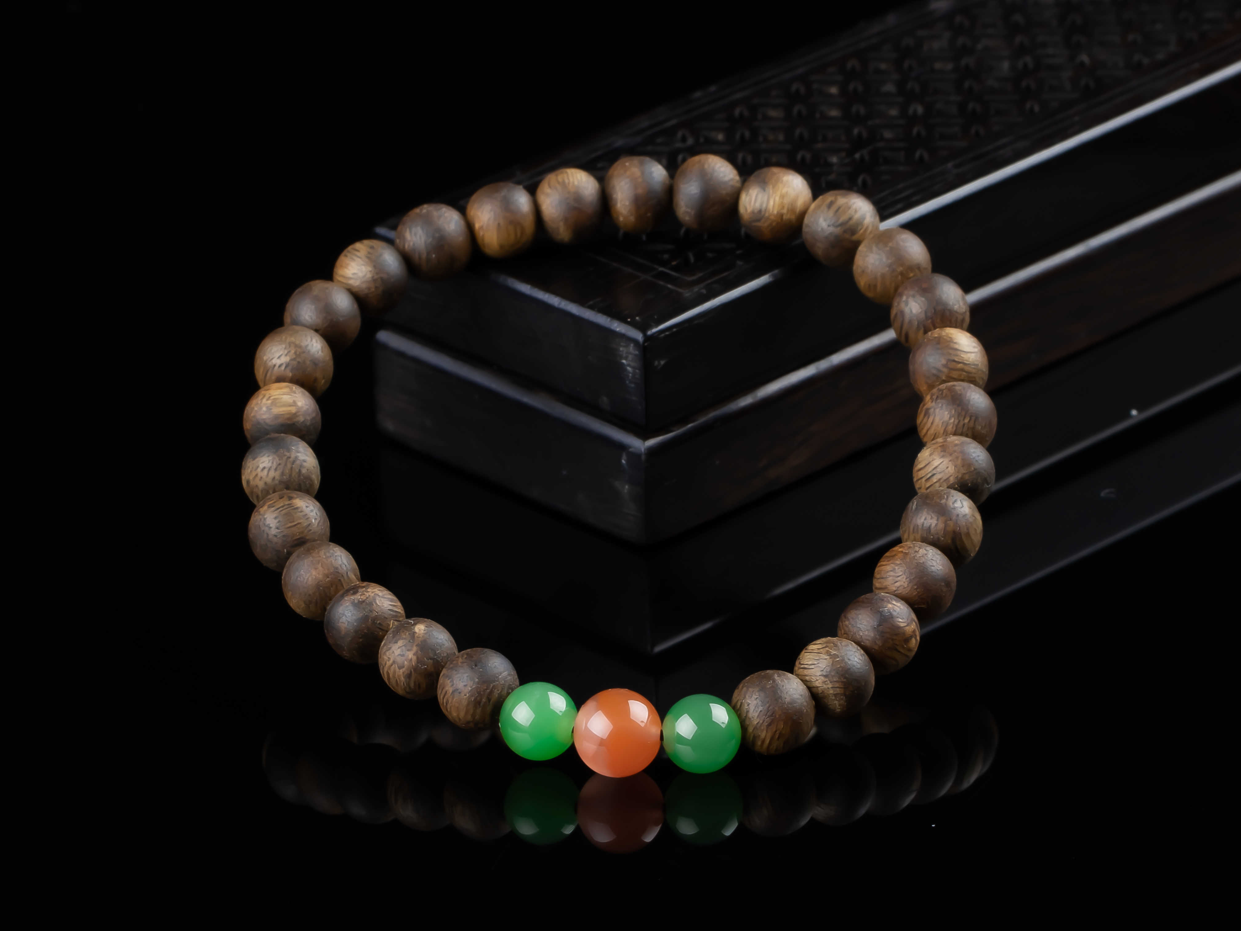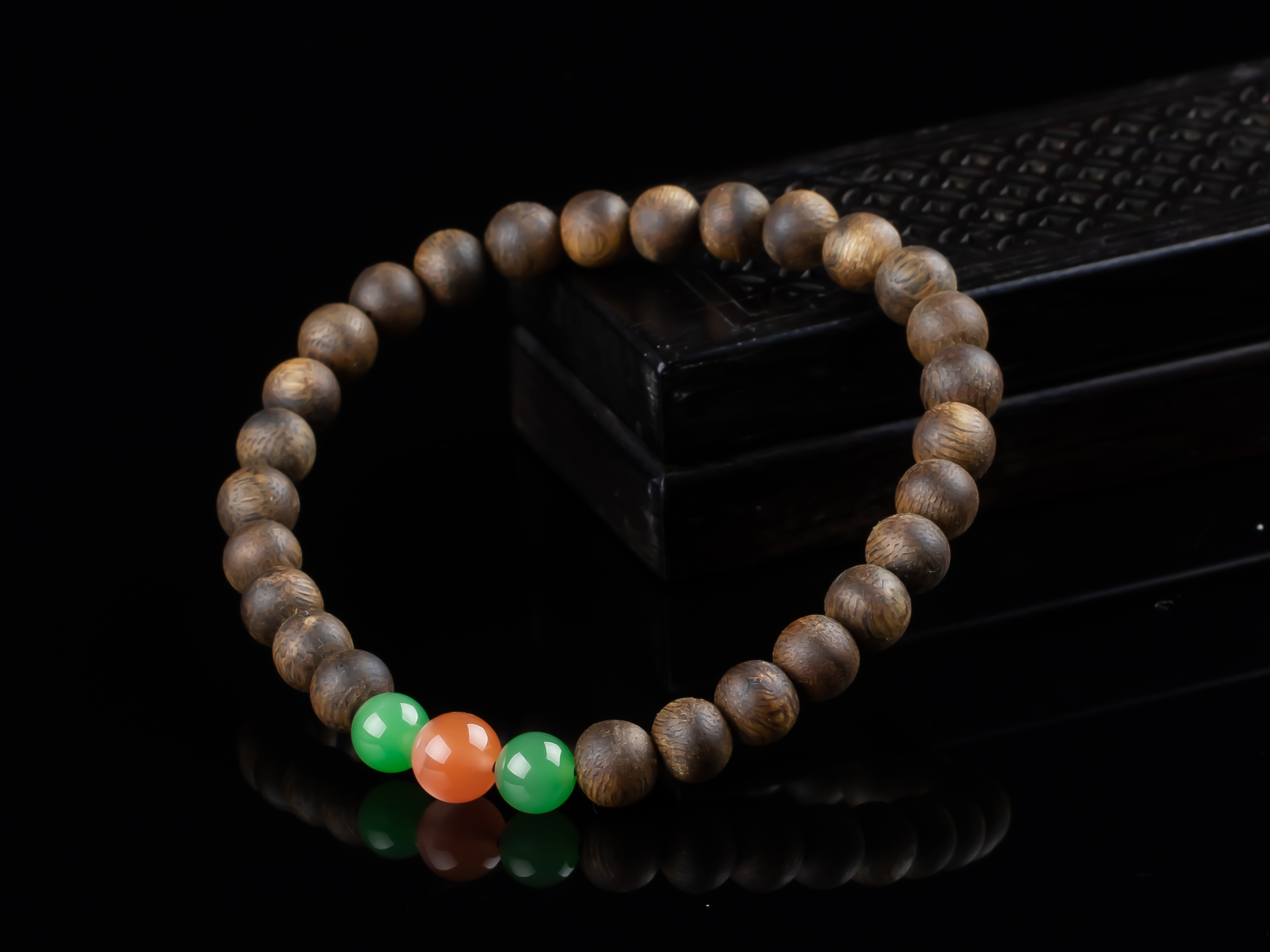 XY0152沉香+南红碧玉手串,天然沉香圆珠6.3mm,原色原味,香味自然清甜,两颗碧玉+一颗冰红南红,红绿相配,三生万物,生生不息,款式简约,古朴之中孕育着勃勃生机。
