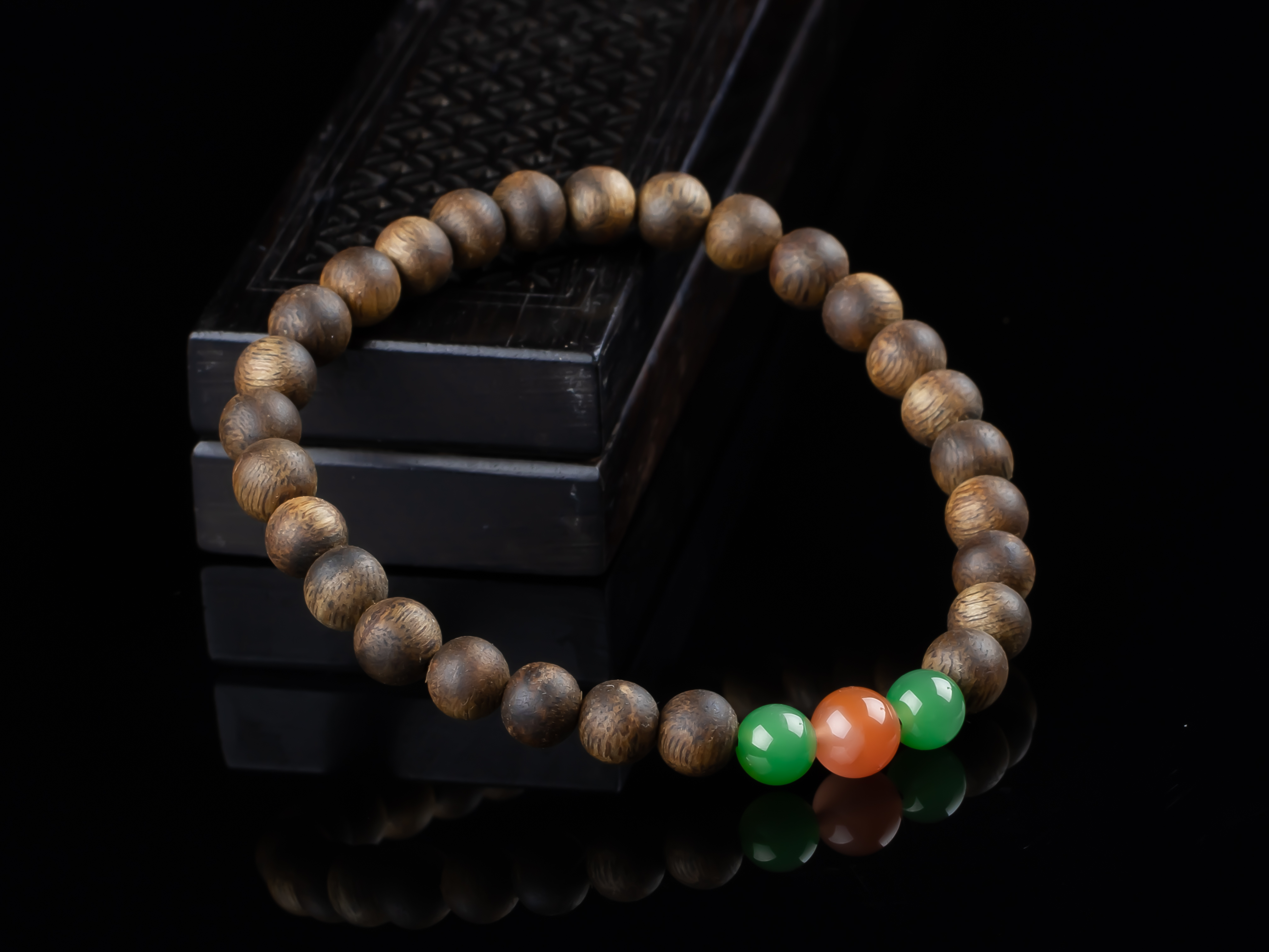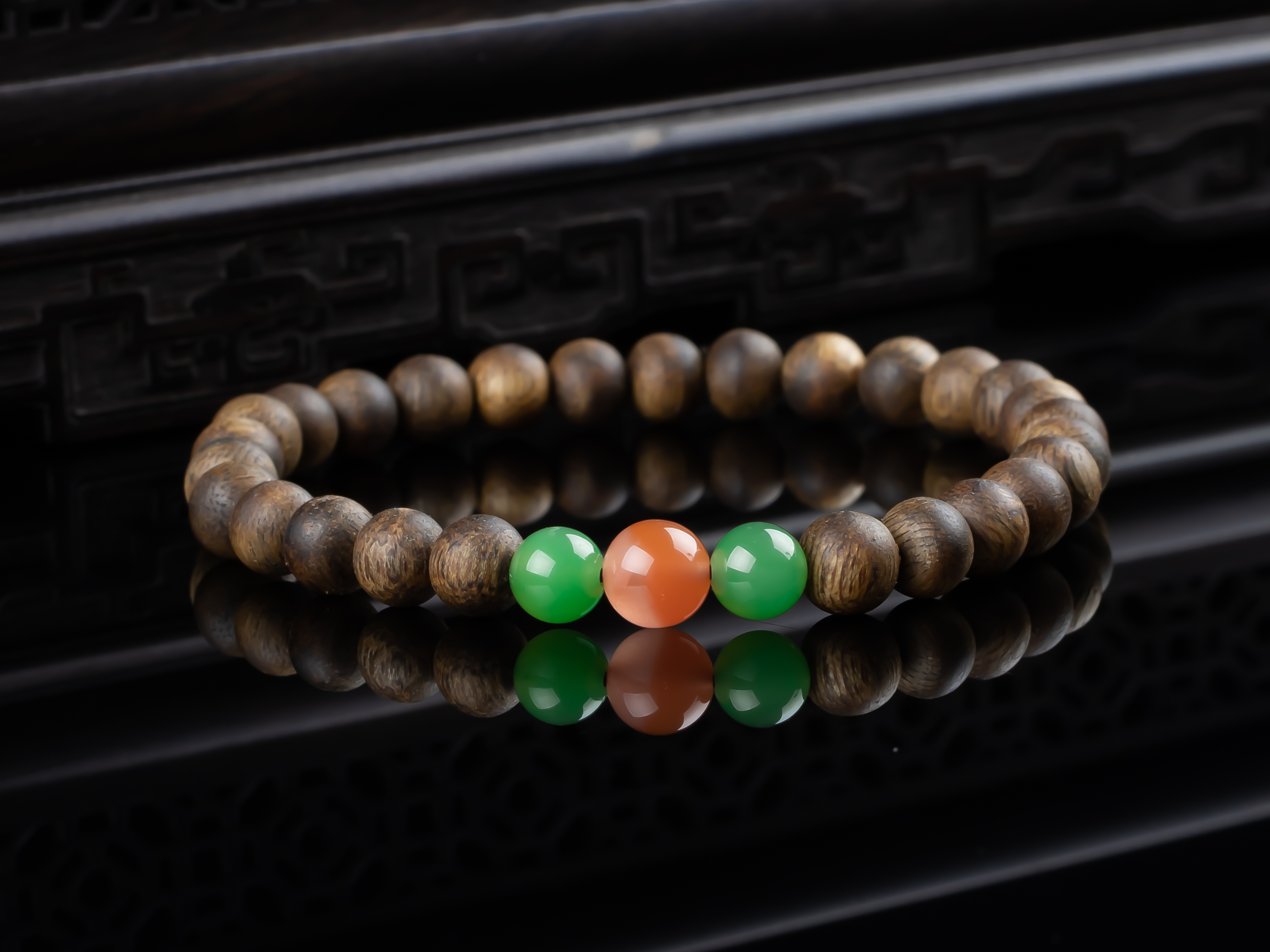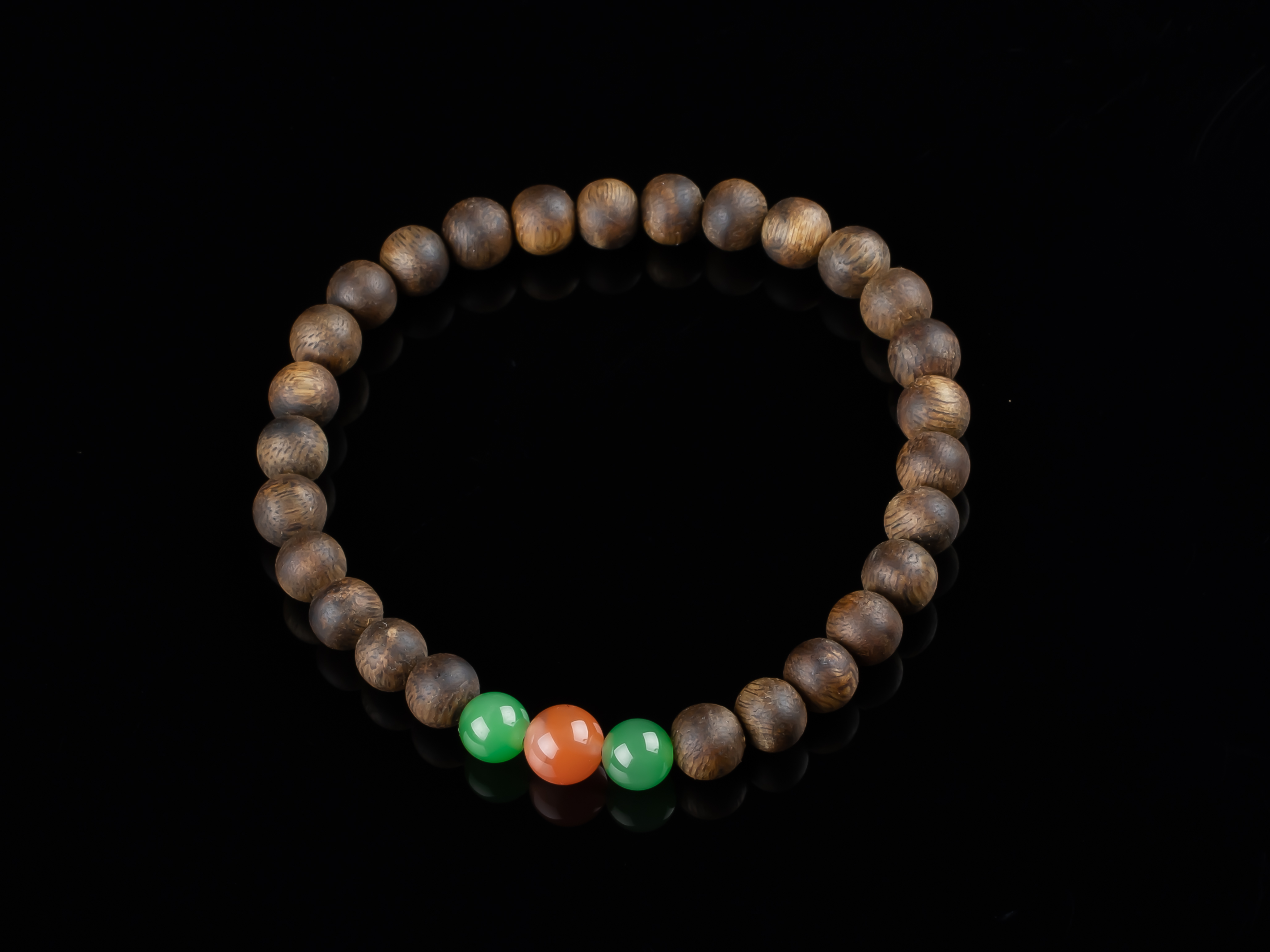 XY0152沉香+南红碧玉手串,天然沉香圆珠6.3mm,原色原味,香味自然清甜,两颗碧玉+一颗冰红南红,红绿相配,三生万物,生生不息,款式简约,古朴之中孕育着勃勃生机。