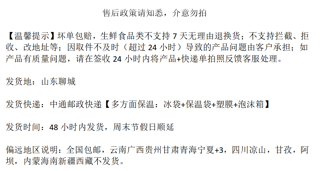 请注意:物流到驿站24小时内必须取货,如24小时内没及时取货导致发臭,由您自己承担,介意请勿拍