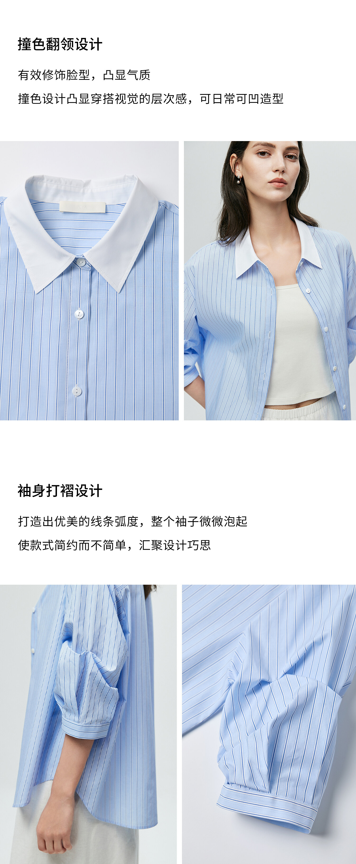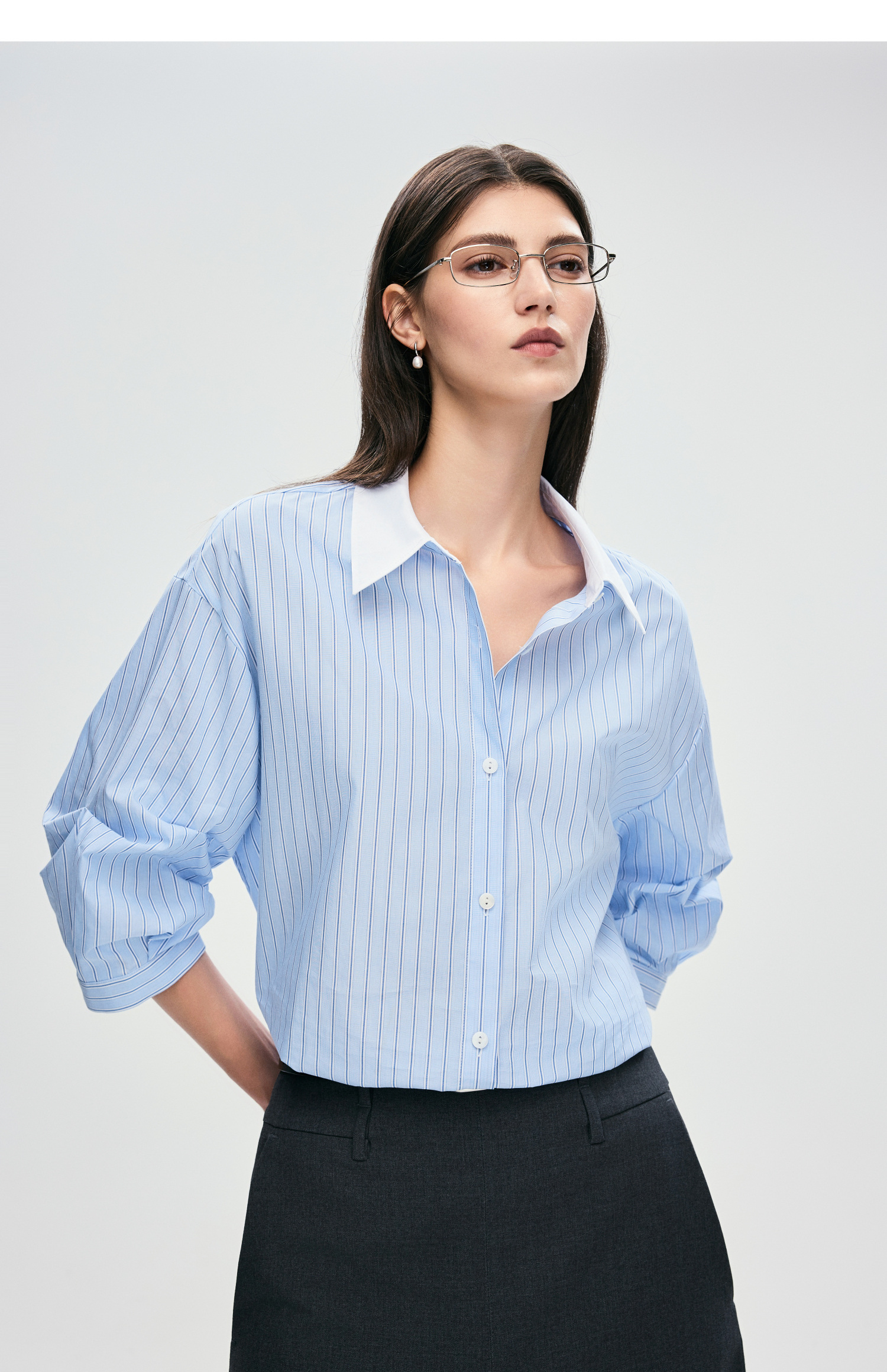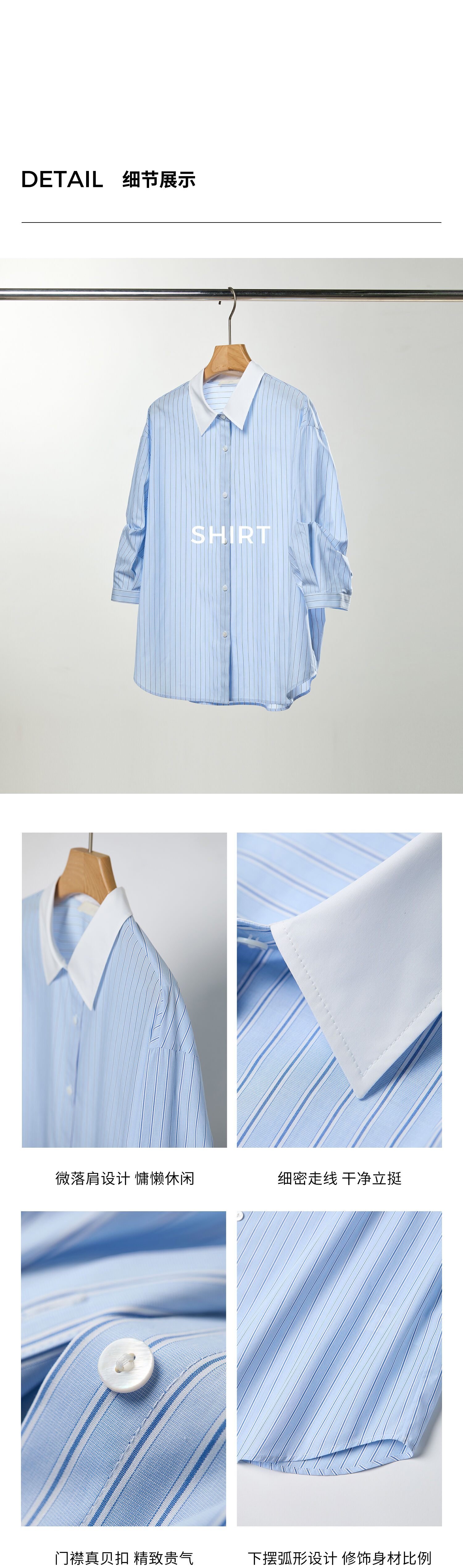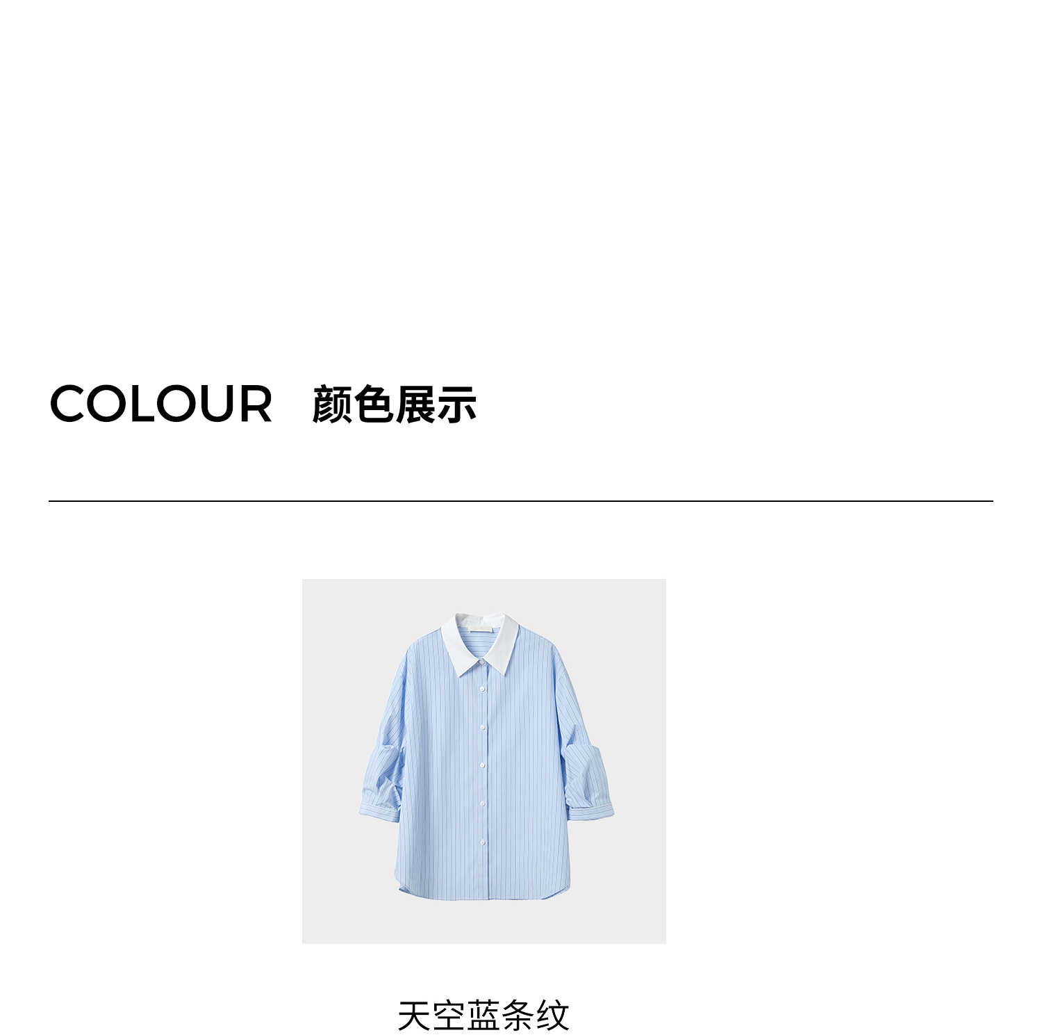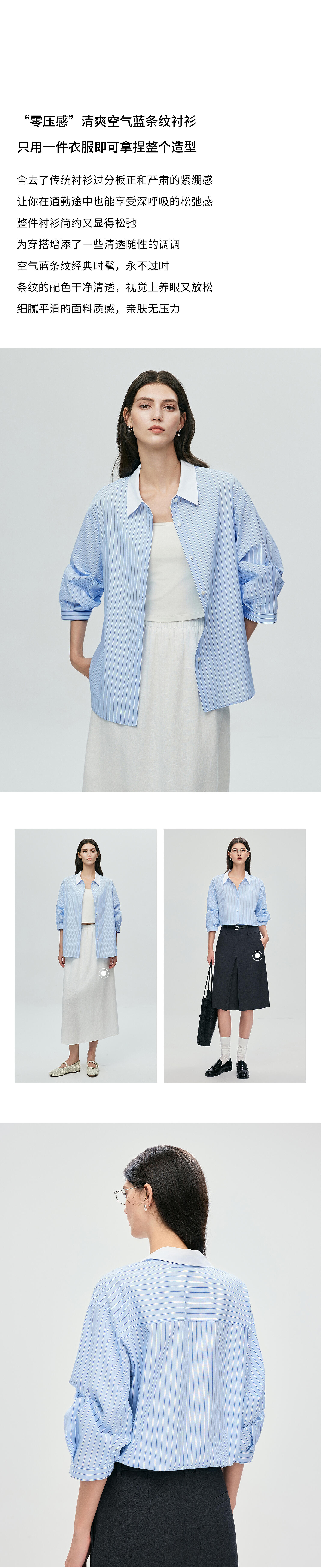 棉仓363604057-初棉25春夏捏褶短袖天空蓝条纹衬衫
