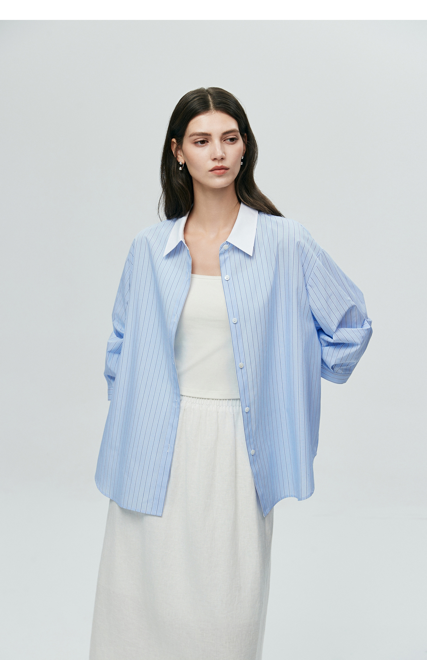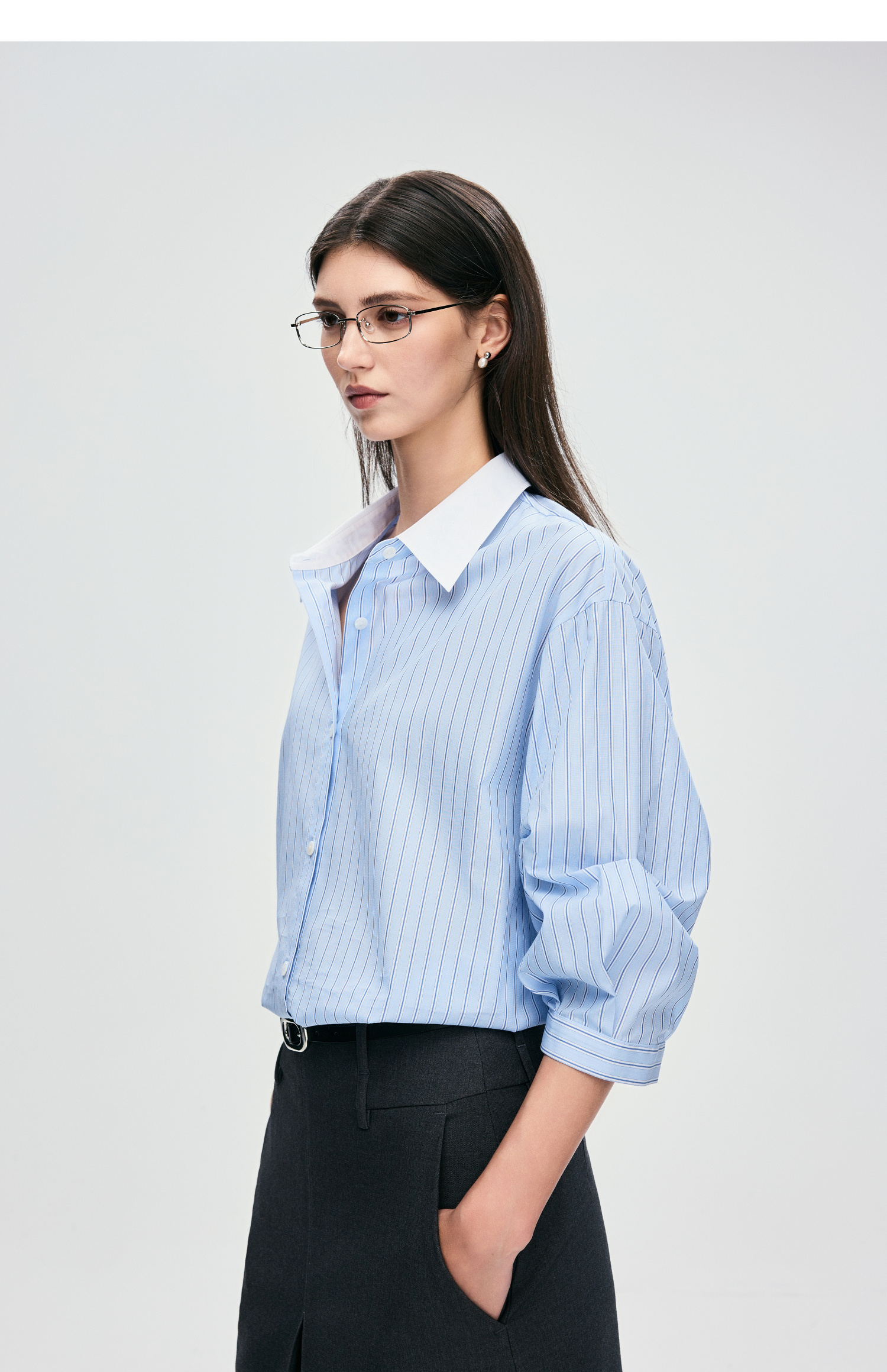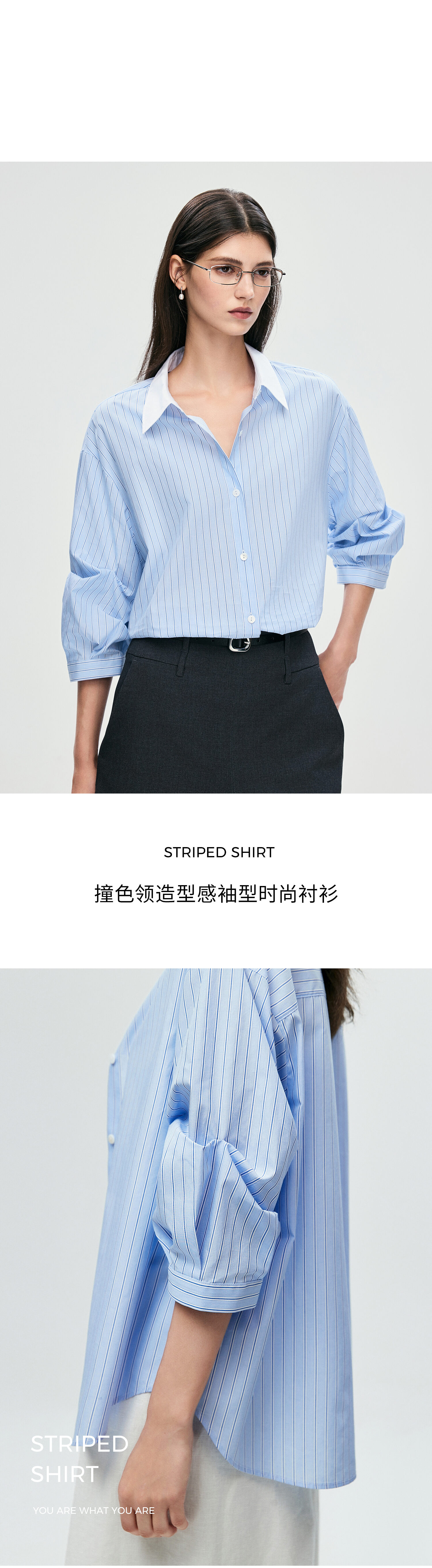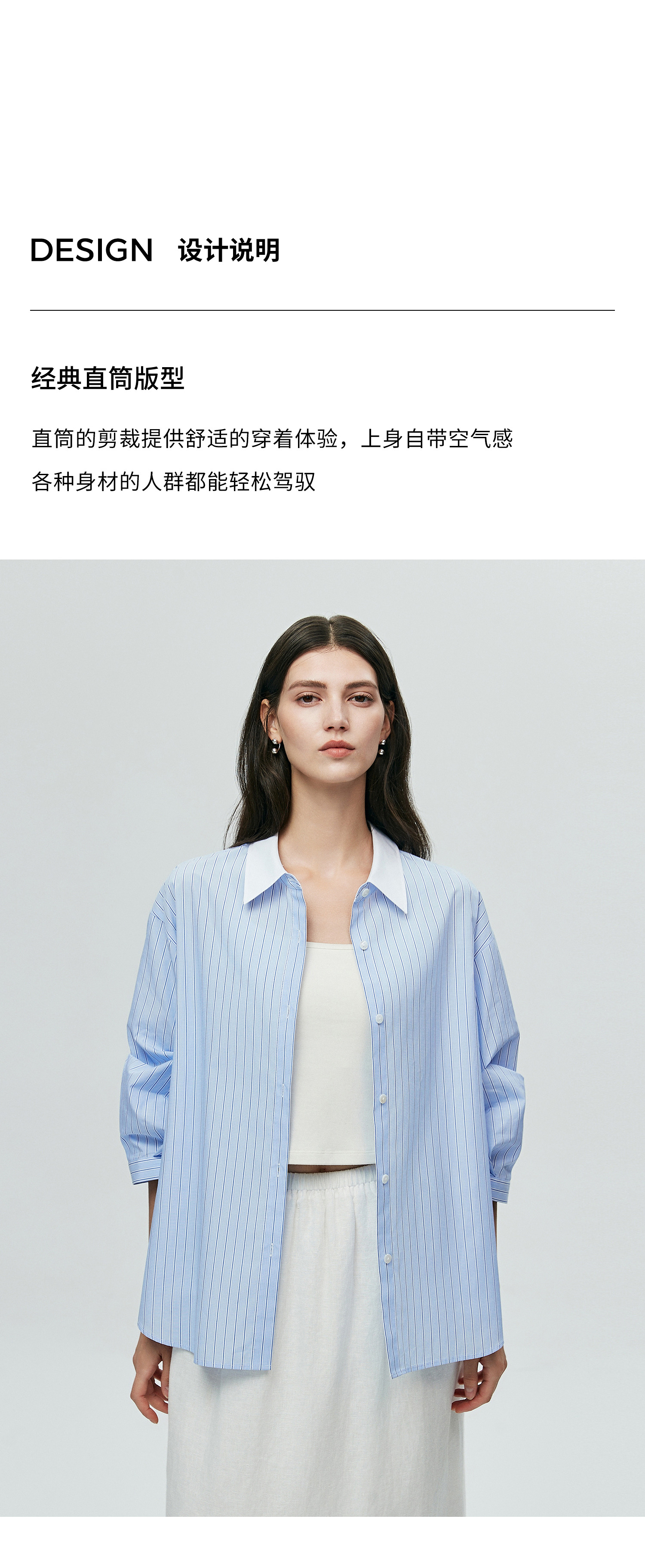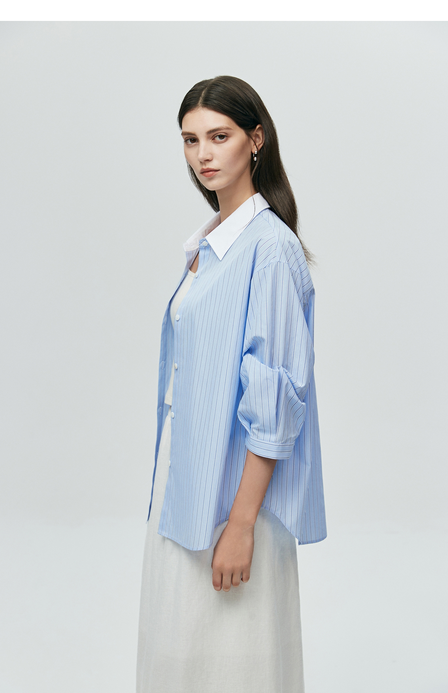 棉仓363604057-初棉25春夏捏褶短袖天空蓝条纹衬衫