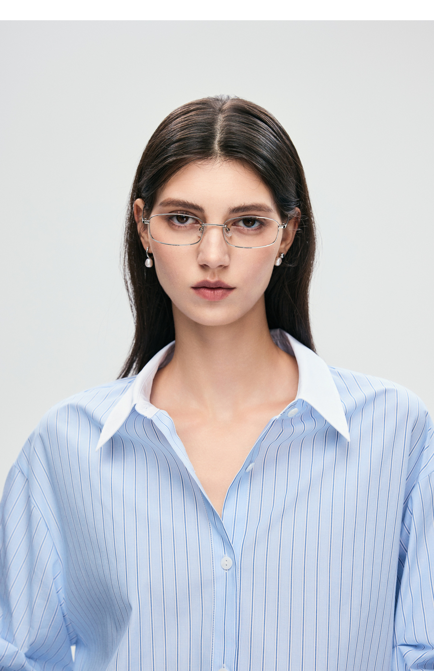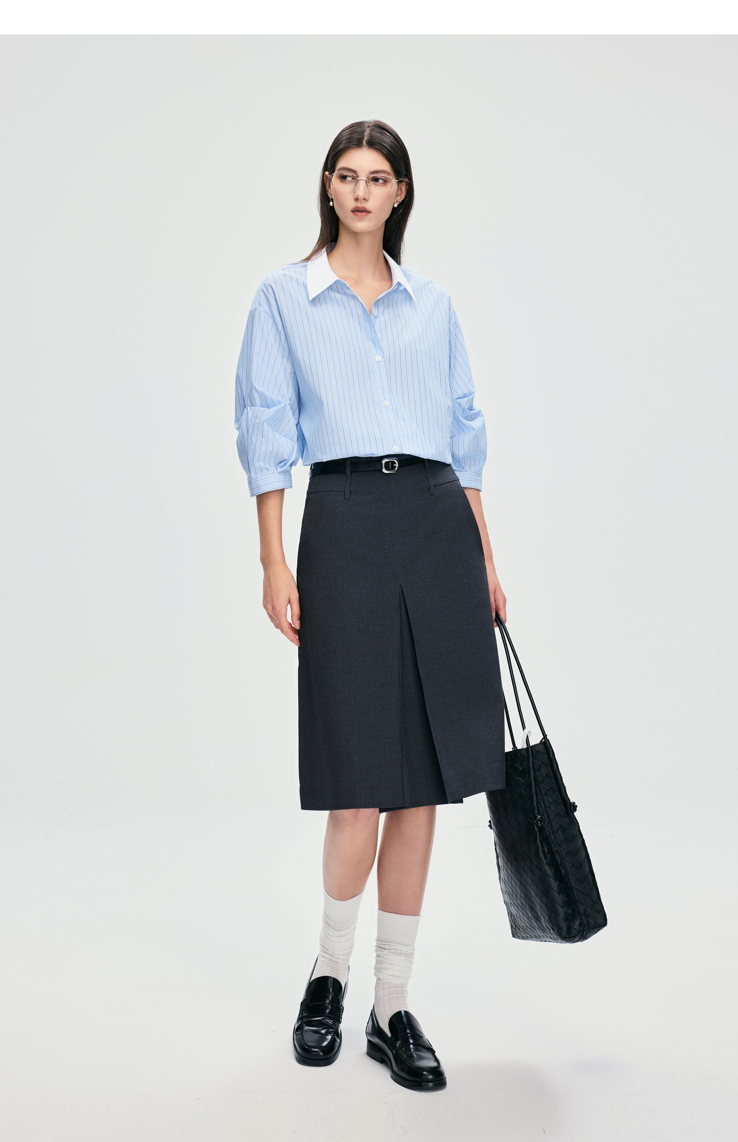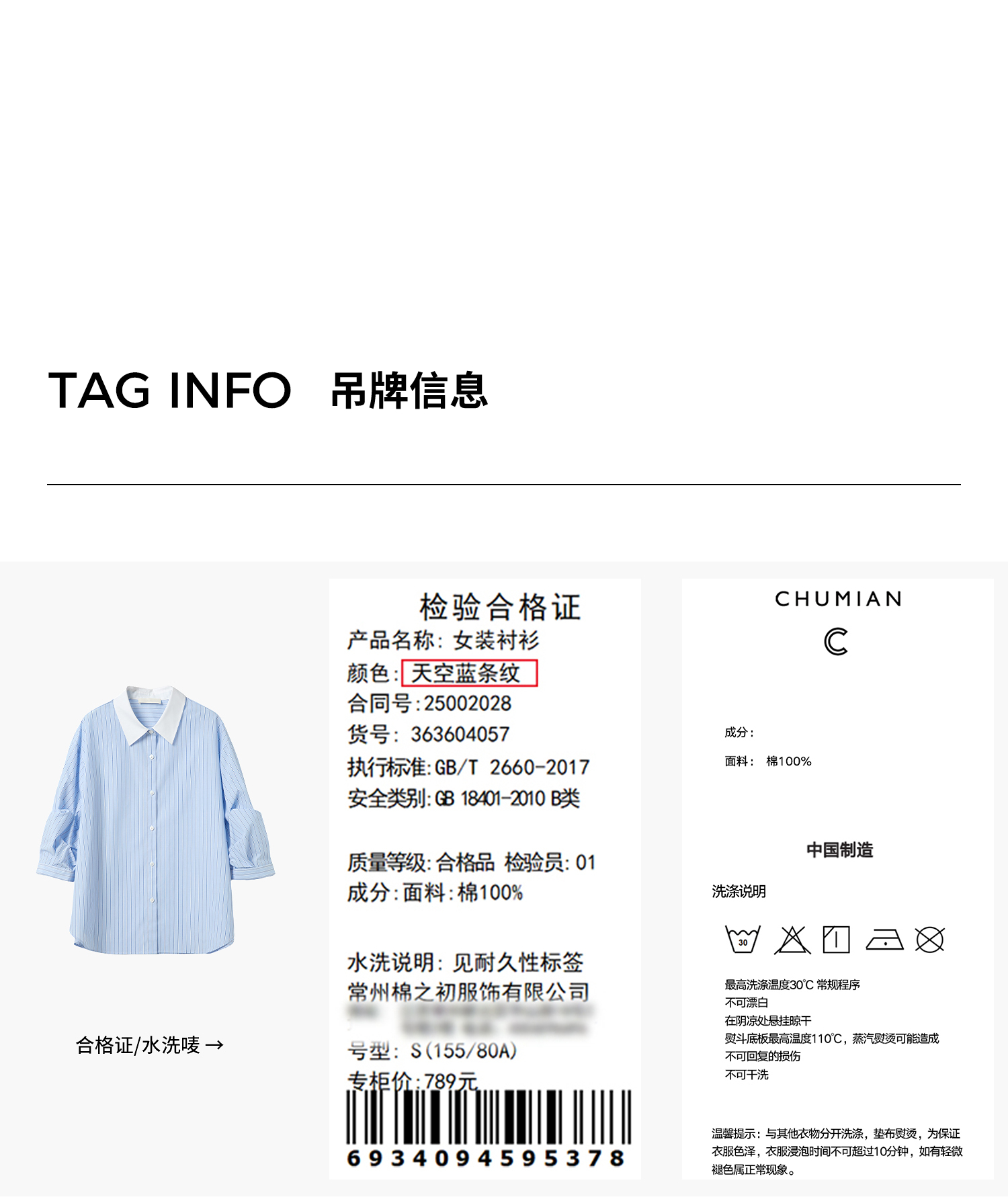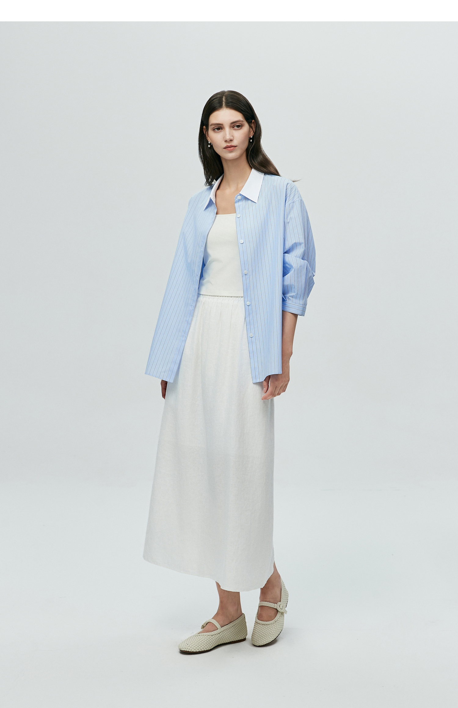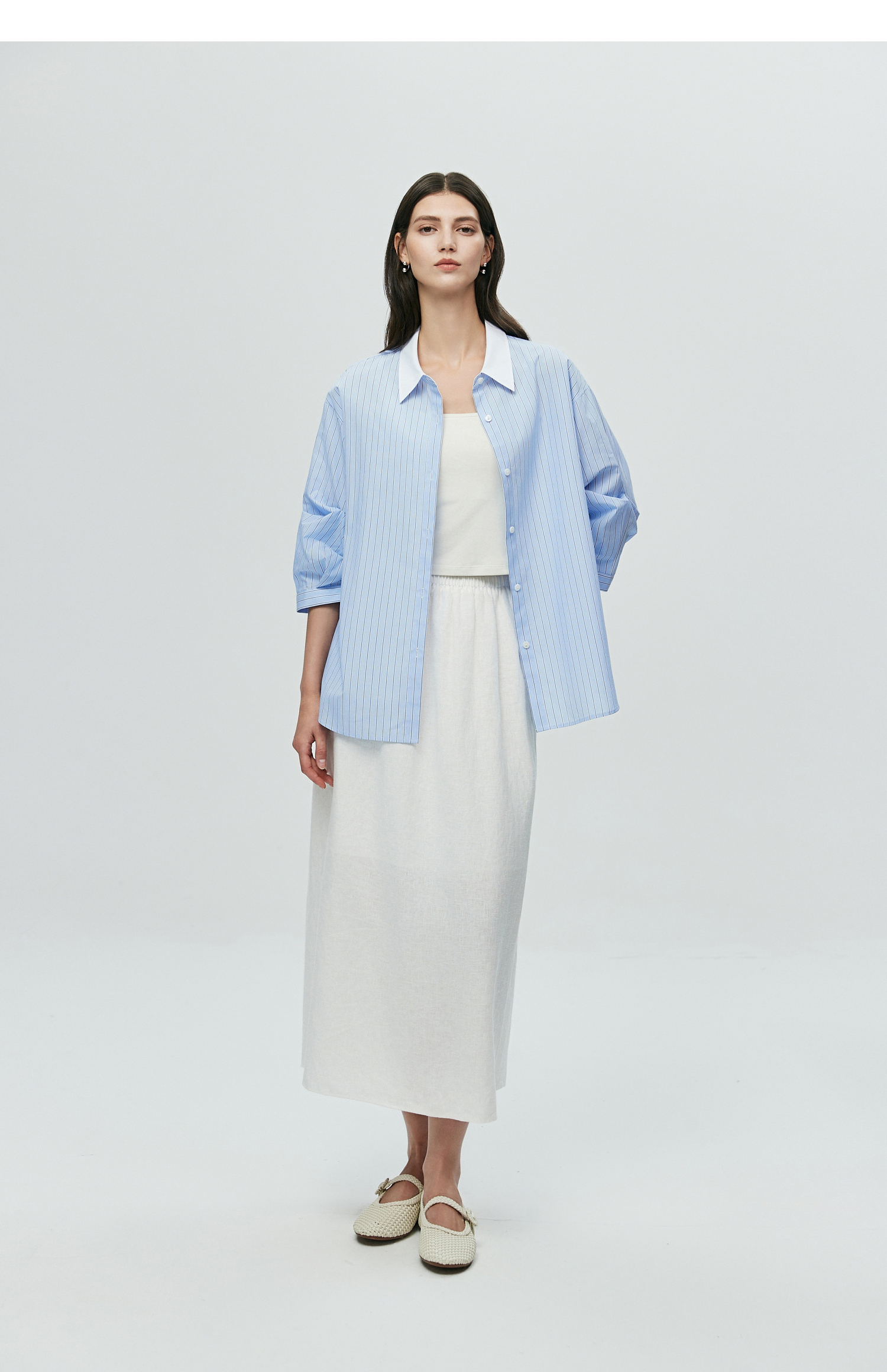 棉仓363604057-初棉25春夏捏褶短袖天空蓝条纹衬衫