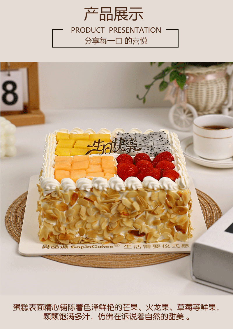 我们坚持当日接单、新鲜现做,拒绝罐头果肉与植物奶油,让每一口都保留食材本真的鲜活清甜。生活需要一点甜,我们的蛋糕不只是一份甜品,更是传递快乐的仪式感,为你带来视觉与味蕾的双重满足~