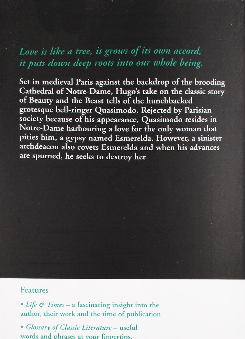 Set in medieval Paris, against the backdrop of the brooding Cathedral of Notre-Dame, Hugo’s take on the classic story of Beauty and the Beast tells of the hunchbacked, grotesque bellringer, Quasimodo. Rejected by Parisian society because of his appearance, Quasimodo resides in Notre-Dame, harbouring a love for the only woman that pities him, a gypsy named Esmerelda. However, a sinister archdeacon also covets Esmerelda, and when his advances are spurned, he seeks to destroy her.