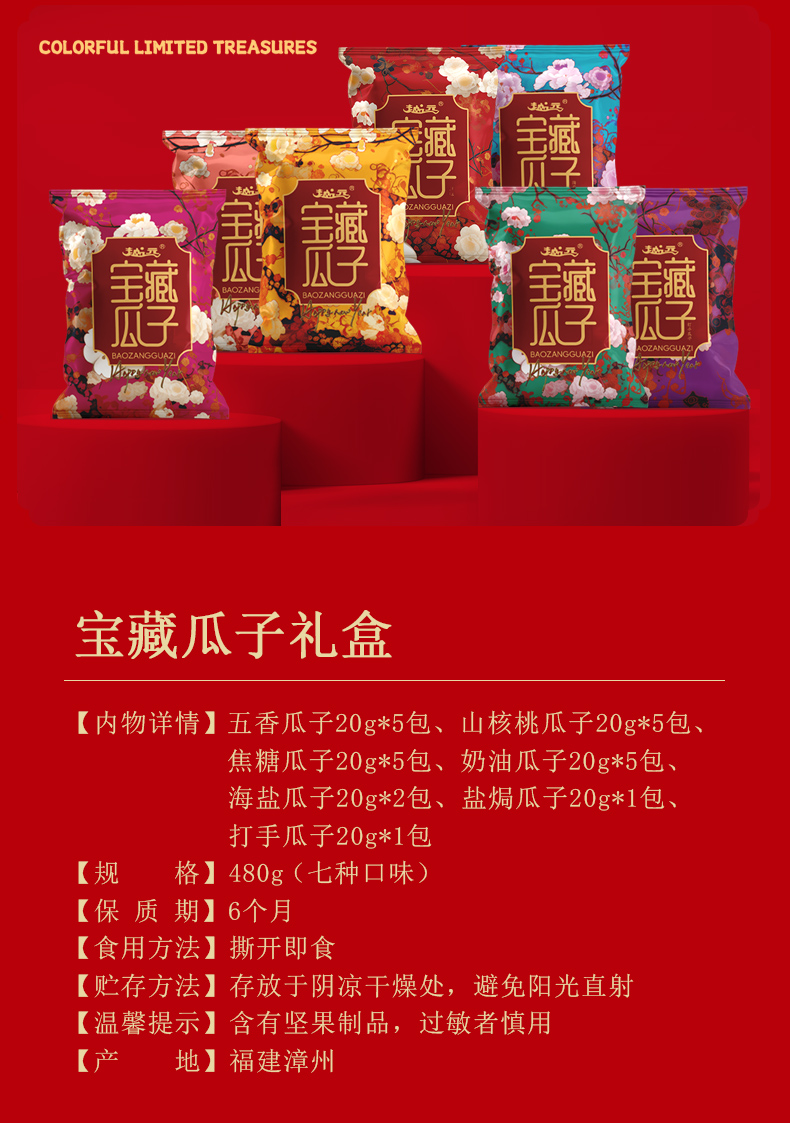【品名】马年越远宝藏瓜子礼盒 【规格】480g/盒 【保质期】6个月 【储存方式】请置于常温阴凉干燥处 【产地】福建漳州 【发货地】福建漳州 【发货快递】韵达 【不发货区域】新疆、西藏、内蒙古、宁夏、甘肃、青海,港澳台不发货。 【补邮费地区】北京、上海+1元 【发货时效】48-72小时,周末节假日顺延 |