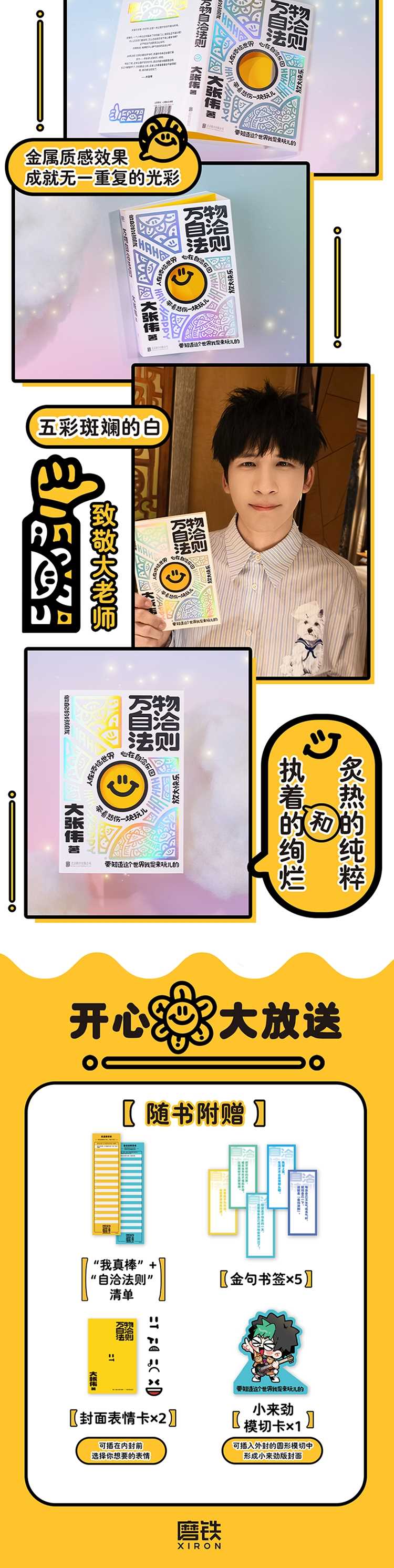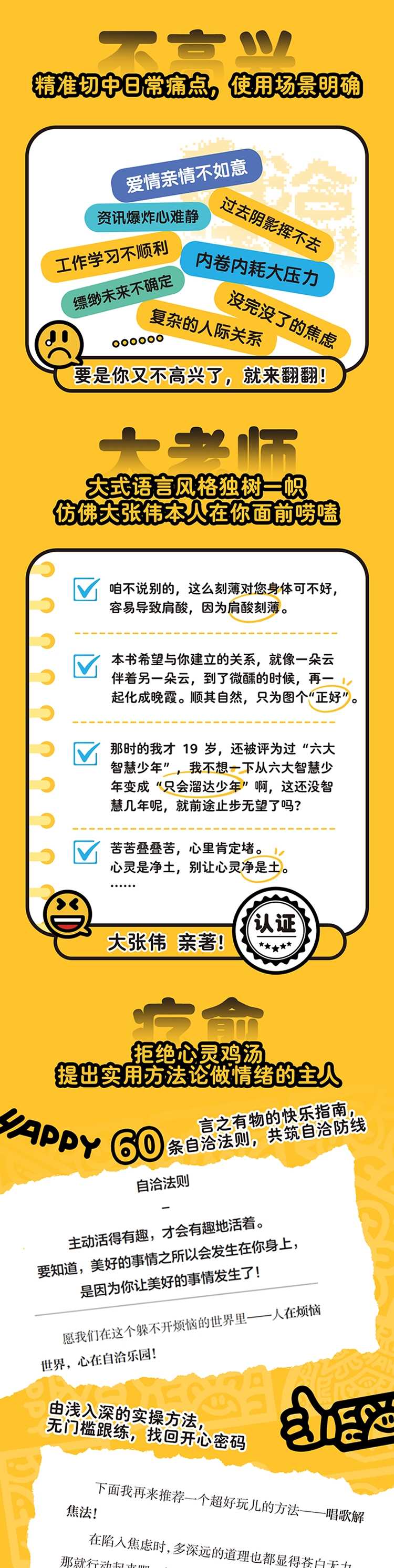 ◎大张伟亲著,一本企图疗愈你的不开心、放大快乐的自洽手册。◎大老师指出:;你很重要!烦恼、压力、内耗、焦虑那些生活里麻木到;见怪不怪的情绪痛点,因为发生在;你身上,所以一切都很重要!◎言之有物的快乐指南,60条自洽法则,共筑自洽防线。◎;读书时不想起大老师的声音大挑战!大式语言风格独树一帜,幽默风趣,仿佛大张伟本人在你面前唠嗑。◎精准切中日常痛点,使用场景明确。◎拒绝心灵鸡汤!提出实用方法论,让我们做情绪的主人!由浅入深的实操方法,无门槛跟练,找回开心密码。◎心理学家陈海贤、知名心理学达人简里里绝赞推荐!读大张伟的文字,像城市里突然拐进的一条小巷,没有悬浮的修辞,也不刻意深奥,却总能恰恰好地戳中现代人心里那些没说出口的褶皱。他的表达里有一种可贵的;人间质地不回避琐碎,不鄙视烟火,把思考落在具体的生活现场:焦虑、疲惫、小小的快乐、突然的脆弱这就是活在每一天的你和我。更难得的是,他明明把荒诞掰开揉碎成了笑点,内里却始终藏着一种严谨的逻辑不是学术意义上的严密,而是对人心精准的共情与推演。你听得进去,因为你知道这些话不是飘在天上的道理,而是能垫在现实脚下、让人站稳的东西。陈海贤(知名心理咨询师、心理学博士)强烈推荐你读这本到处都是谐音梗、充满感叹号、而且全书都在发语音的书,读完了;想不开也得开!简里里(简单心理APP创始人兼CEO)◎精心打磨收藏臻选。定制封面图案,由获奖设计师唐旭操刀设计。金属质感效果,成就无一重复的光彩,用;五彩斑斓的白致敬大老师炙热的纯粹和执着的绚烂!