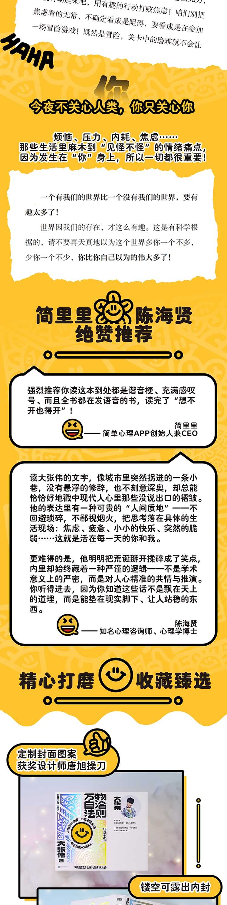 【媒体评论】心理学家陈海贤、知名心理学达人简里里绝赞推荐!读大张伟的文字,像城市里突然拐进的一条小巷,没有悬浮的修辞,也不刻意深奥,却总能恰恰好地戳中现代人心里那些没说出口的褶皱。他的表达里有一种可贵的;人间质地不回避琐碎,不鄙视烟火,把思考落在具体的生活现场:焦虑、疲惫、小小的快乐、突然的脆弱这就是活在每一天的你和我。更难得的是,他明明把荒诞掰开揉碎成了笑点,内里却始终藏着一种严谨的逻辑不是学术意义上的严密,而是对人心精准的共情与推演。你听得进去,因为你知道这些话不是飘在天上的道理,而是能垫在现实脚下、让人站稳的东西。陈海贤(知名心理咨询师、心理学博士)强烈推荐你读这本到处都是谐音梗、充满感叹号、而且全书都在发语音的书,读完了;想不开也得开!简里里(简单心理APP创始人兼CEO)