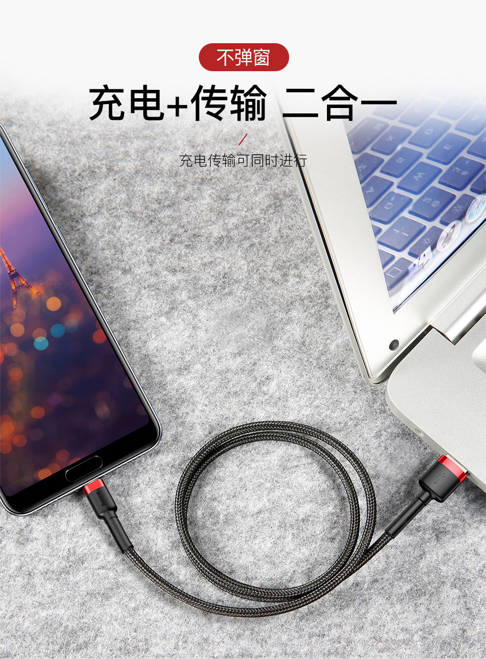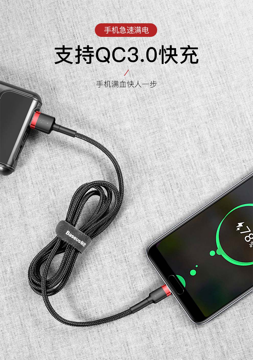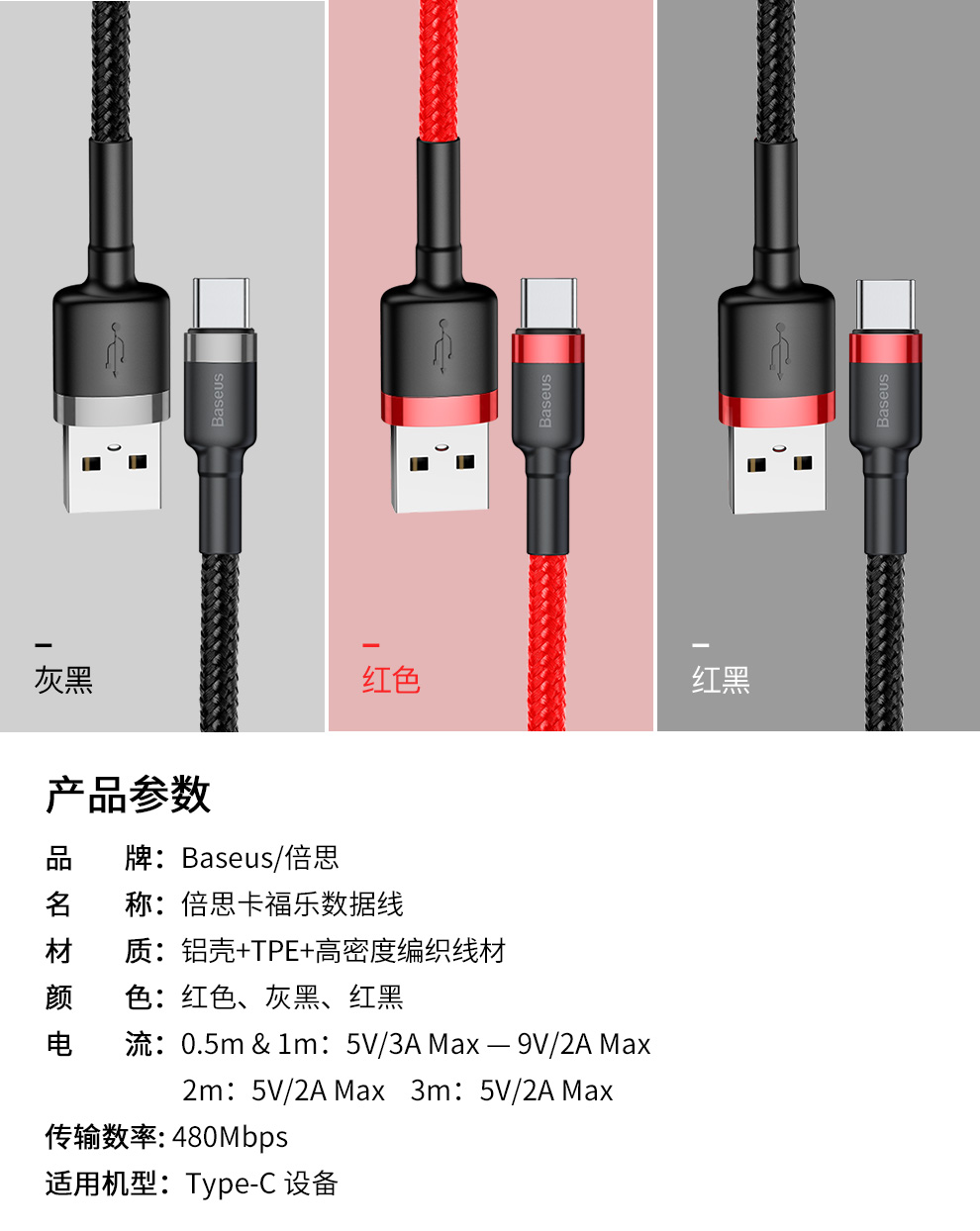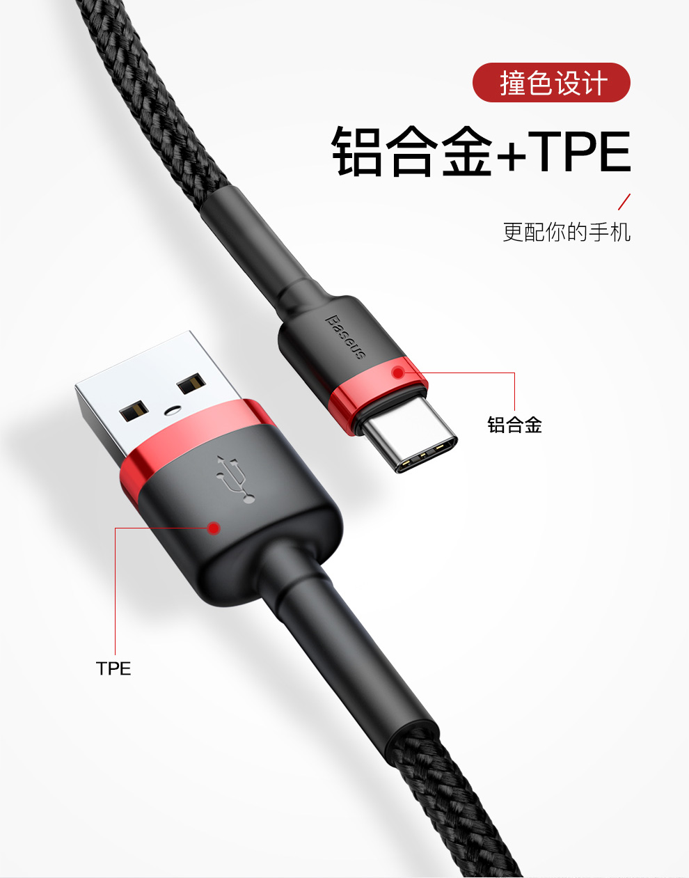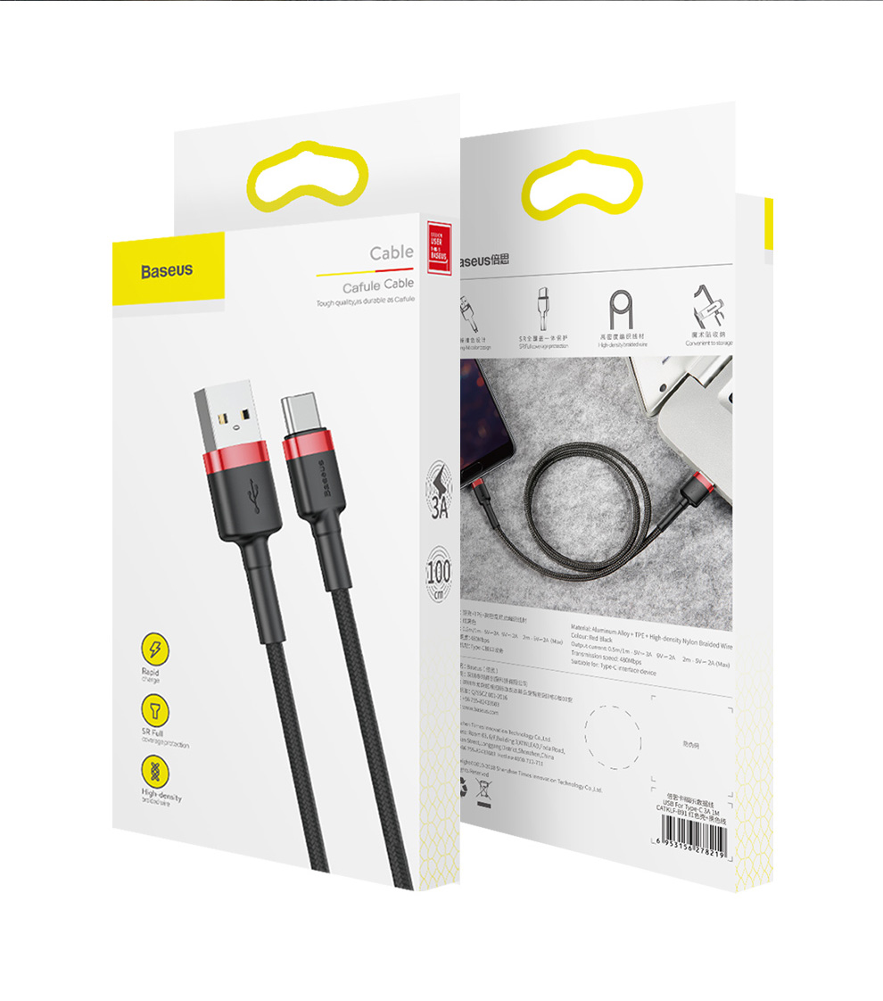 倍思 卡福乐数据线 USB For Type-C 3A 适用华为/荣耀/小米/oppo/vivo安卓充电线