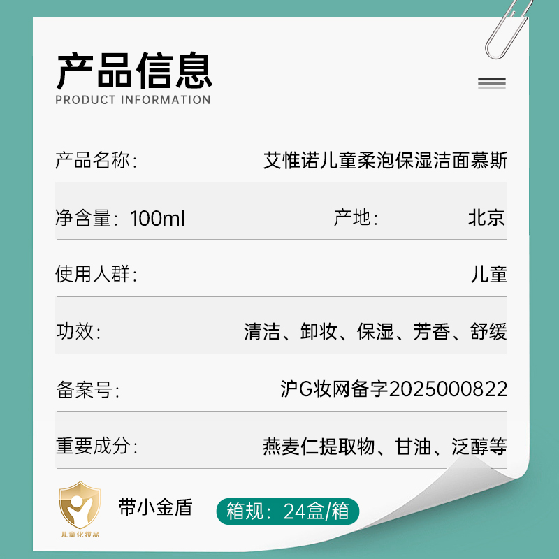 【1:1送水凝保湿霜10g】Aveeno艾惟诺儿童柔泡保湿洁面慕斯 100ml