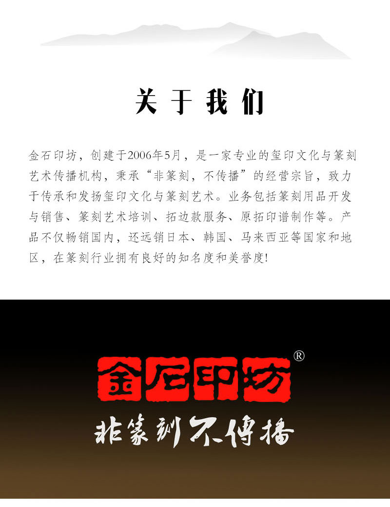 - 金石印坊旗下微商城。“非篆刻,不传播”是金石印坊一直秉承的经营宗旨。