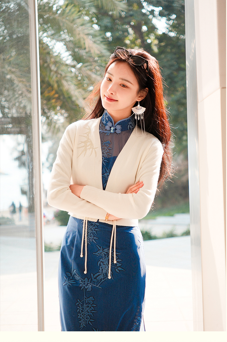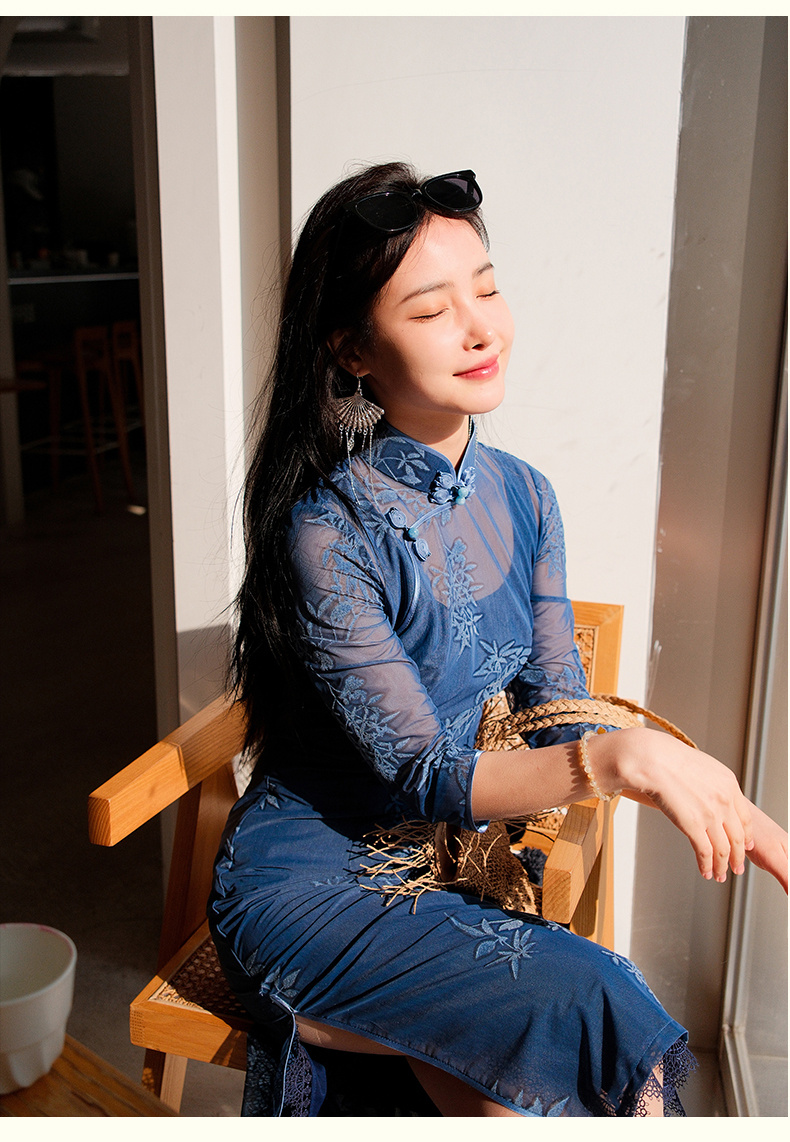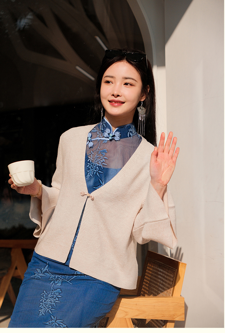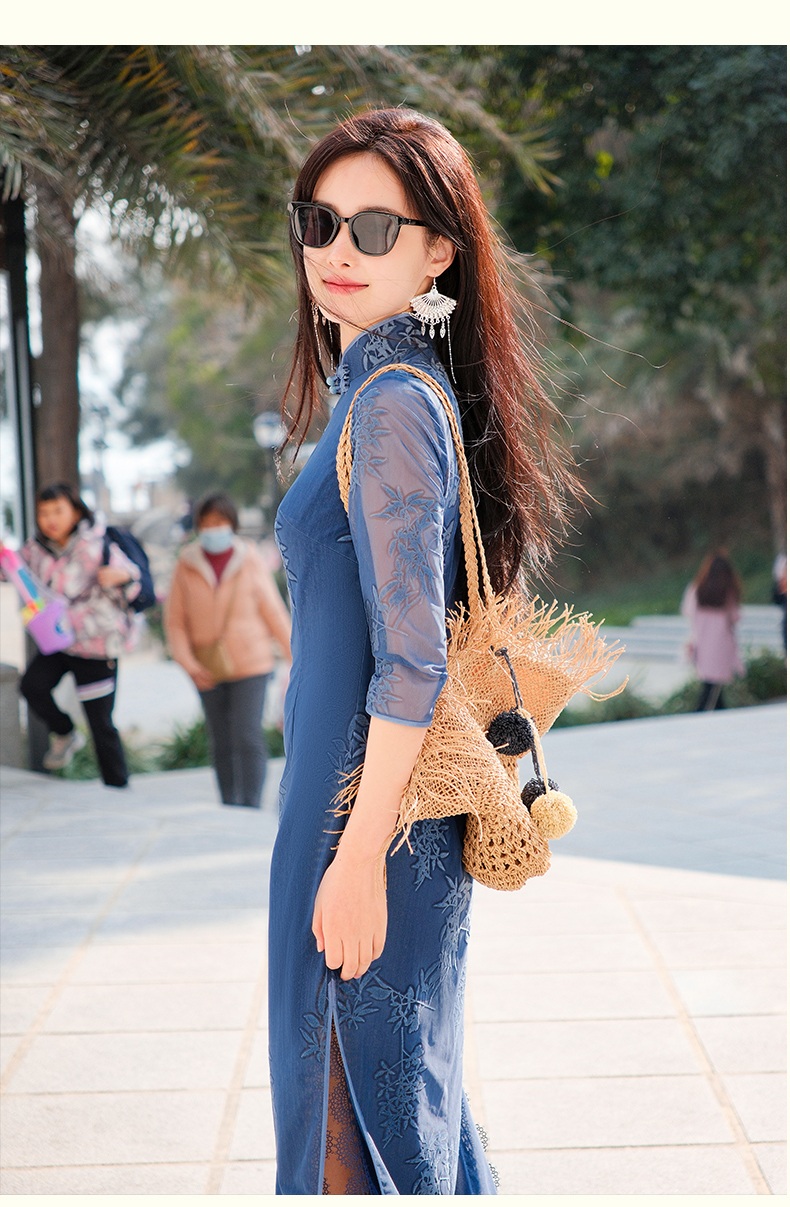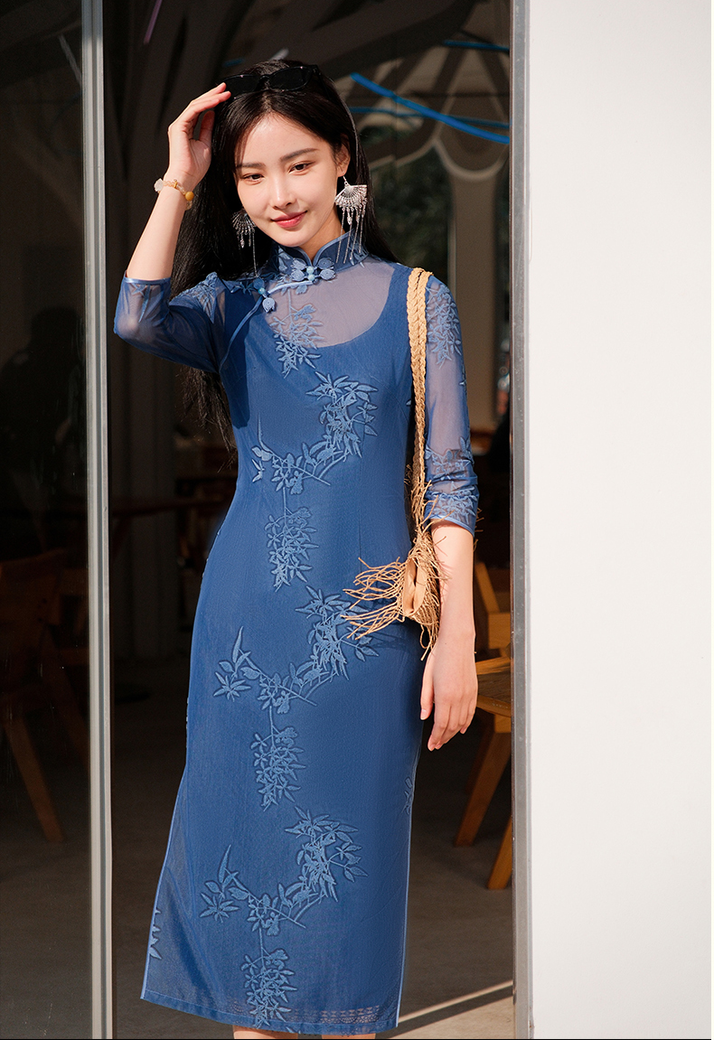上海逸红颜轩竹2025春新微弹松弛感网布植绒文艺中式七分袖旗袍女