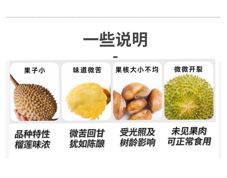 3.因榴莲属于自然生长的农产品,非标准品,所以每一房果肉的大小无法保证,只能保证最低果肉房数。
