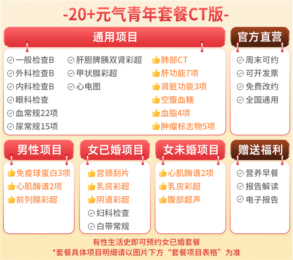 | 套餐名称:20+元气青年体检套餐CT版 | |||||