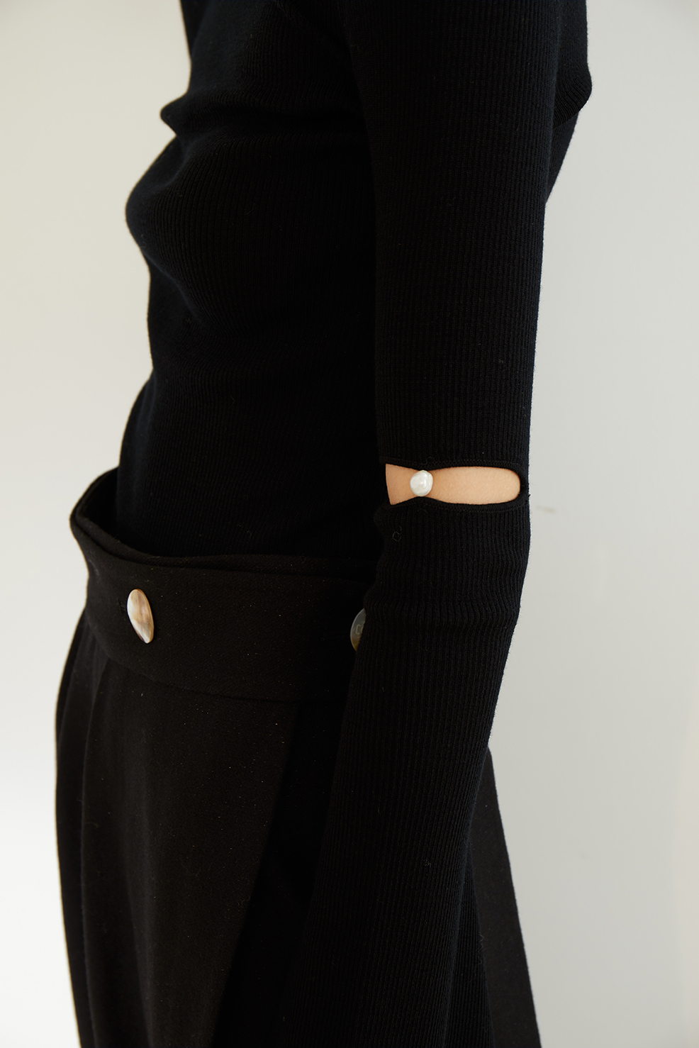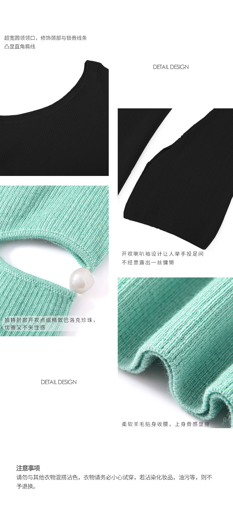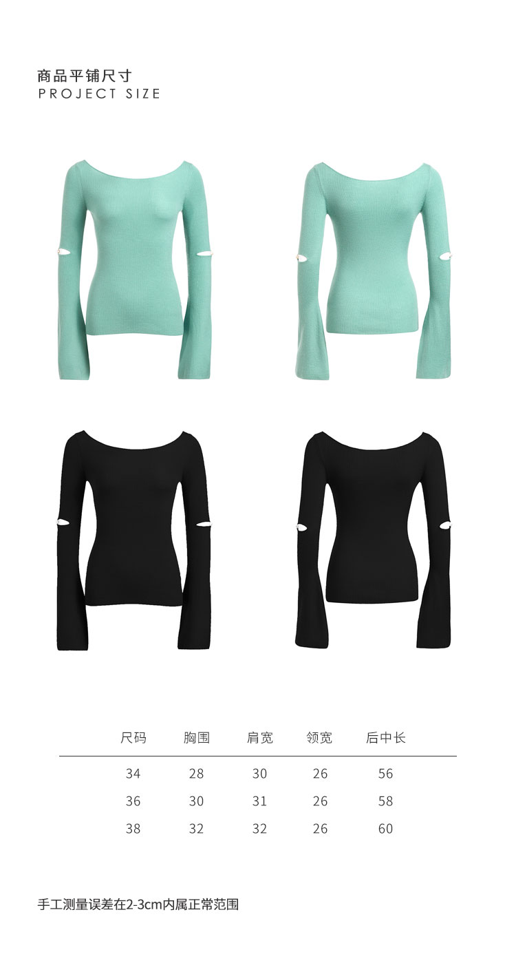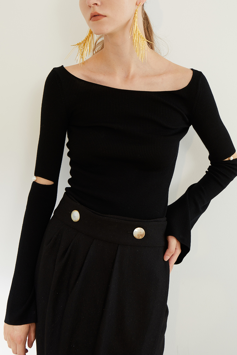 CINNAMON | 74910270 一字领喇叭袖珍珠毛衫 [黑色长袖针织]