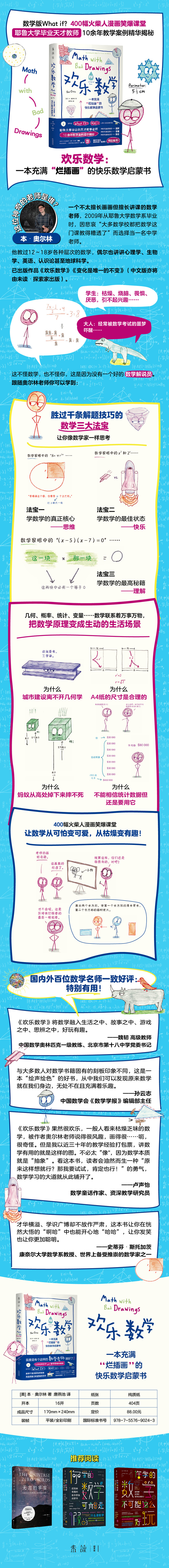 这本书就是奥尔林老师课堂的延续,书中融入了400多幅他标志性的“烂插画”、火柴人形象、幽默的笑话,书里没有几个方程式(有也是装饰),也不讲解题细节。这本书告诉所有人,数学在生活中无处不在:城市建设要用到几何学,A4纸的尺寸为什么是合理的,蚂蚁从高处掉下来为什么摔不死……从烤蛋糕、看球赛、玩桌游到买彩票、考试、遗传基因,你会发现一切问题都是数学问题。