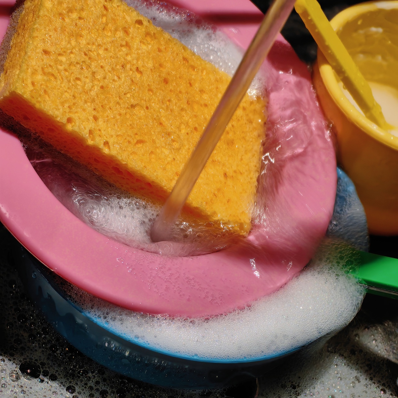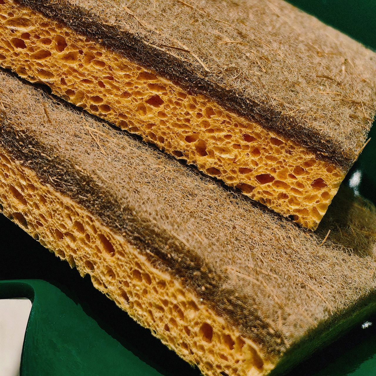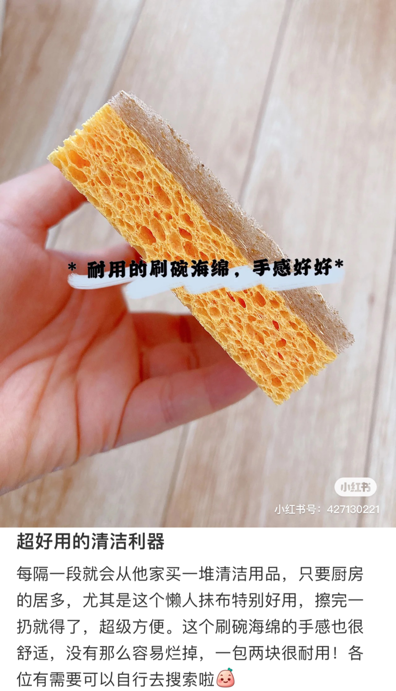 刚收到的百洁布是硬硬扁扁的,椰棕色面是椰丝,黄色则是木浆棉。小硬块一扔水里就像海棉吸水一样迅速蓬起变得柔软,加入清洁剂后起泡能力很强。一般的污渍用黄色面就可以了,顽固些的污渍或者锅具,就可以用椰丝来刷,清洁能力更强,但不会伤锅。洗完后只要拿水冲冲,附在上面的油基本就能冲干净啦,放在旁边还会自己变干变小,保证厨房的干爽,非常方便!