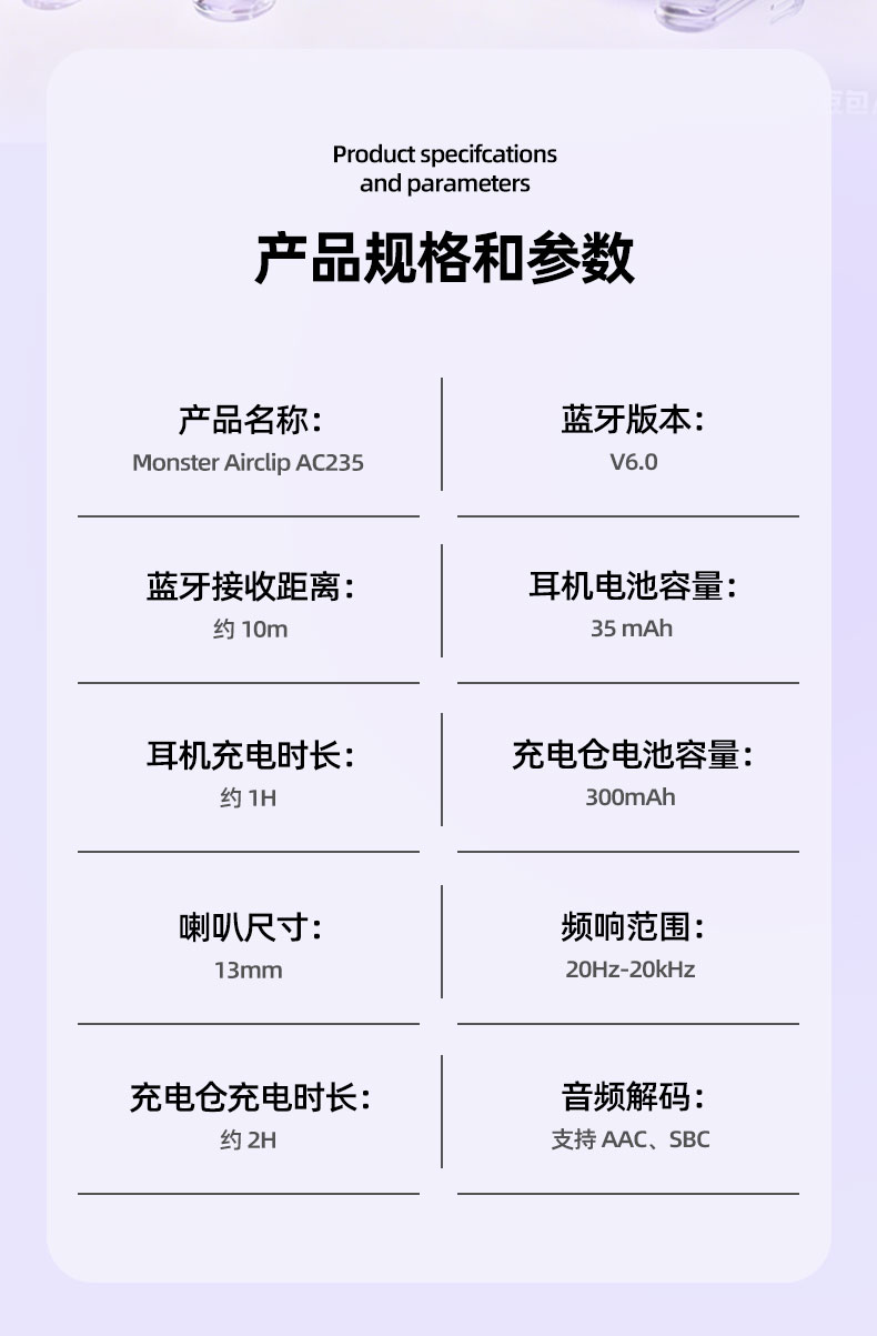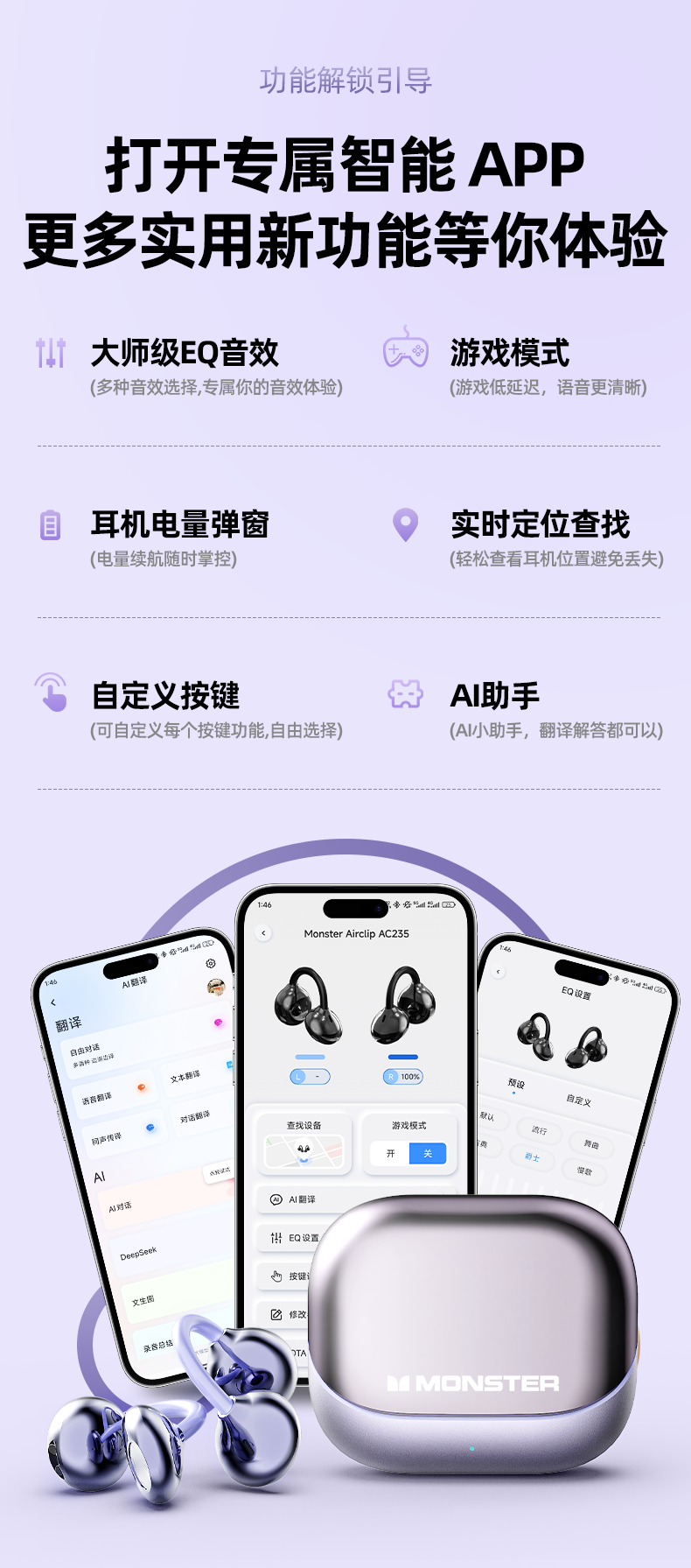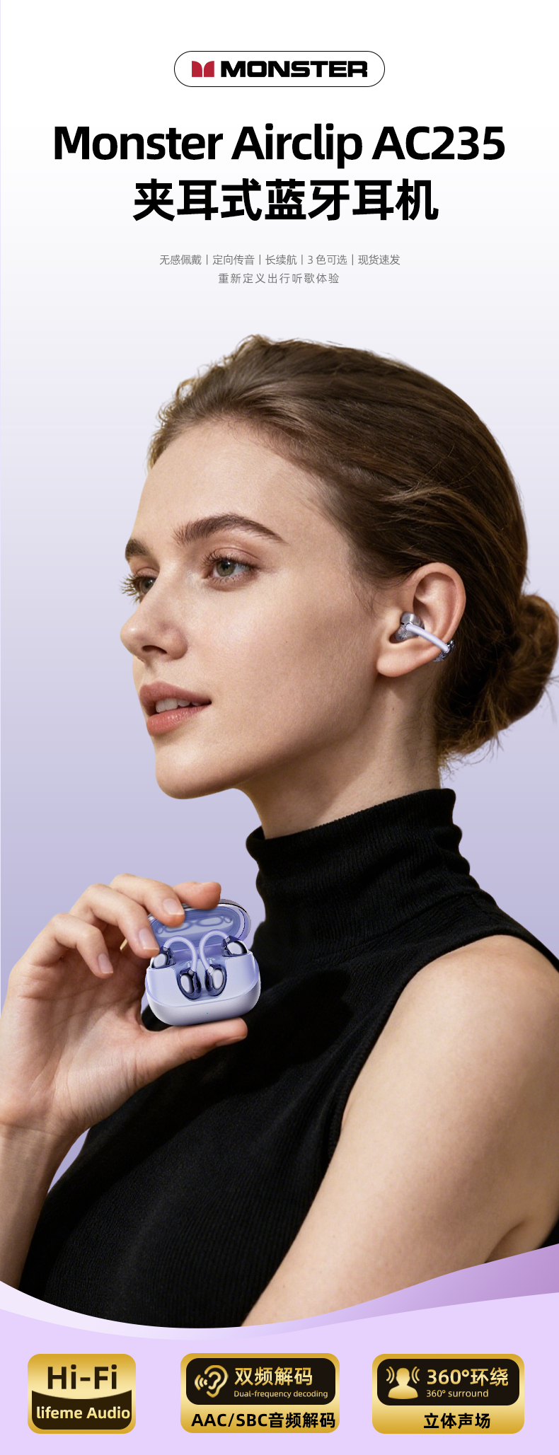 【品名】Monster魔声 新款夹耳式蓝牙耳机 基础款/AI款 AC235 【规格】 基础款/AI款:璀璨黑、月光白、极光紫 【产地】国内 【发货包装】独立包装 【发货地】广东 【发货快递】申通 【补邮费地区】新疆、西藏+6元/单 【发货时效】48-72小时,周末节假日顺延 |