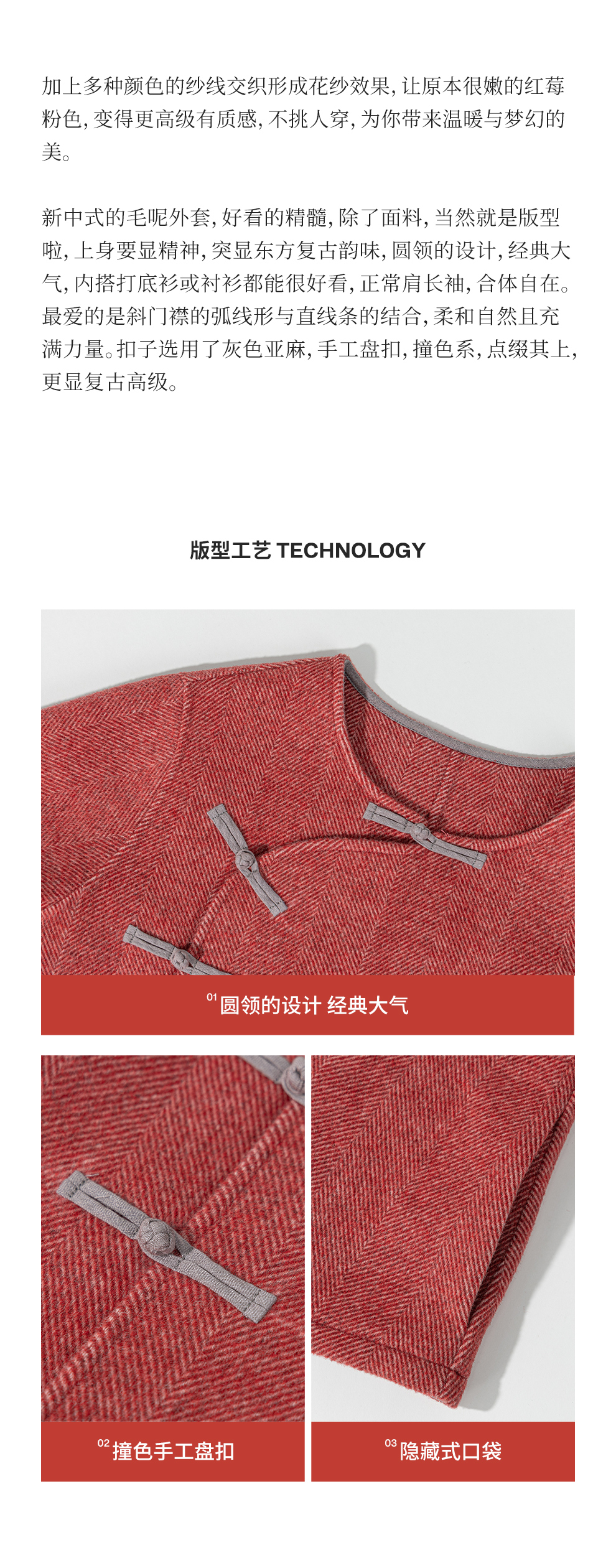 绽放058朵/羊毛花纱人字纹双面呢新中式斜门襟撞色手工盘扣外套