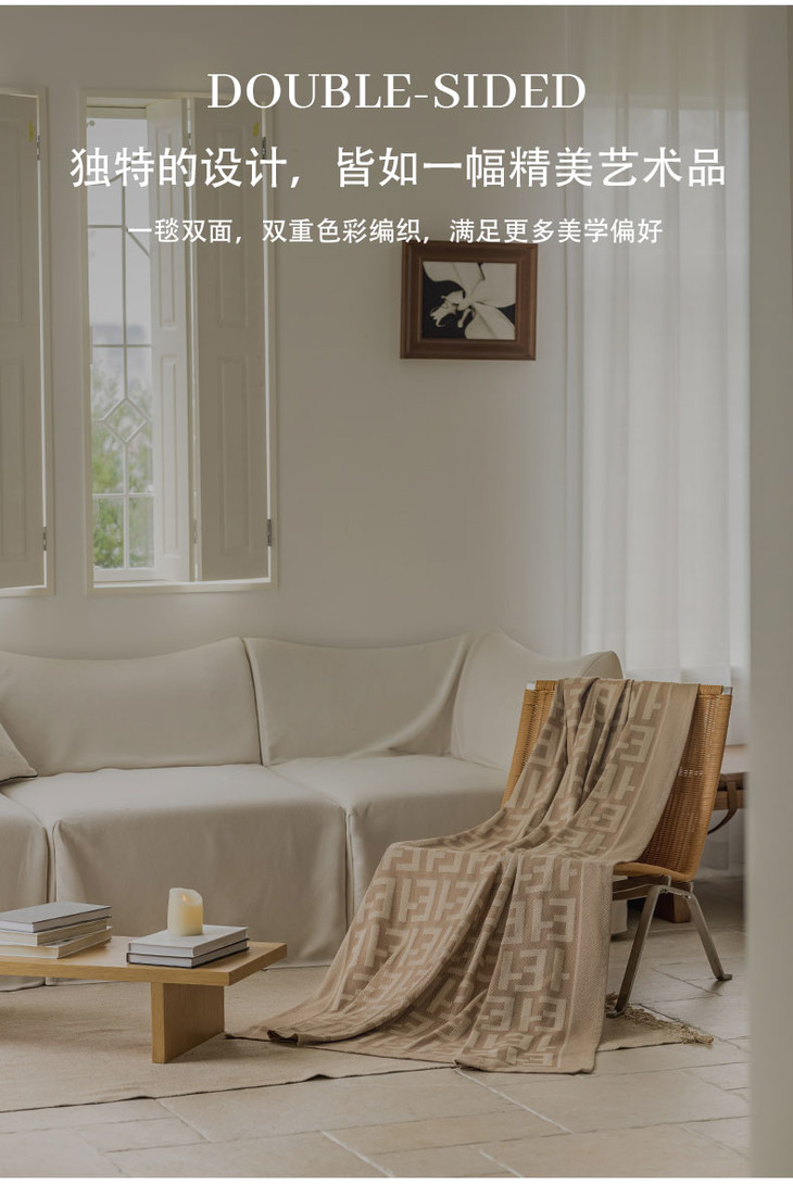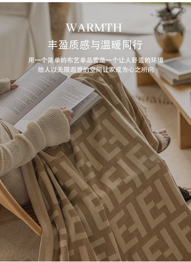 毯子用的是双面提花工艺,双重色彩编织,高贵典雅,细密工整,质感堪比大牌,波士顿榛果色也超级百搭,什么家居风格,都能完美融合,还能增添点点艺术气息!190*130cm的大尺寸,能从头盖到脚,而且是A类面料,贴肤披盖都完全没问题!