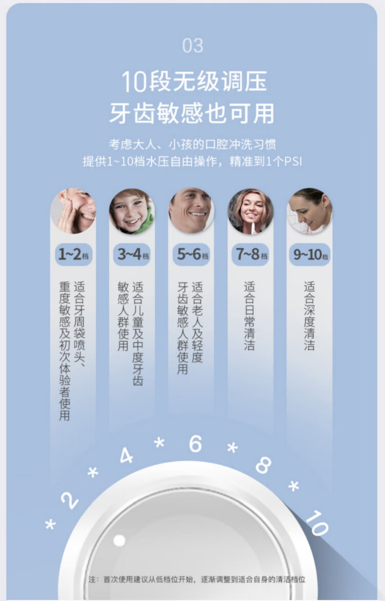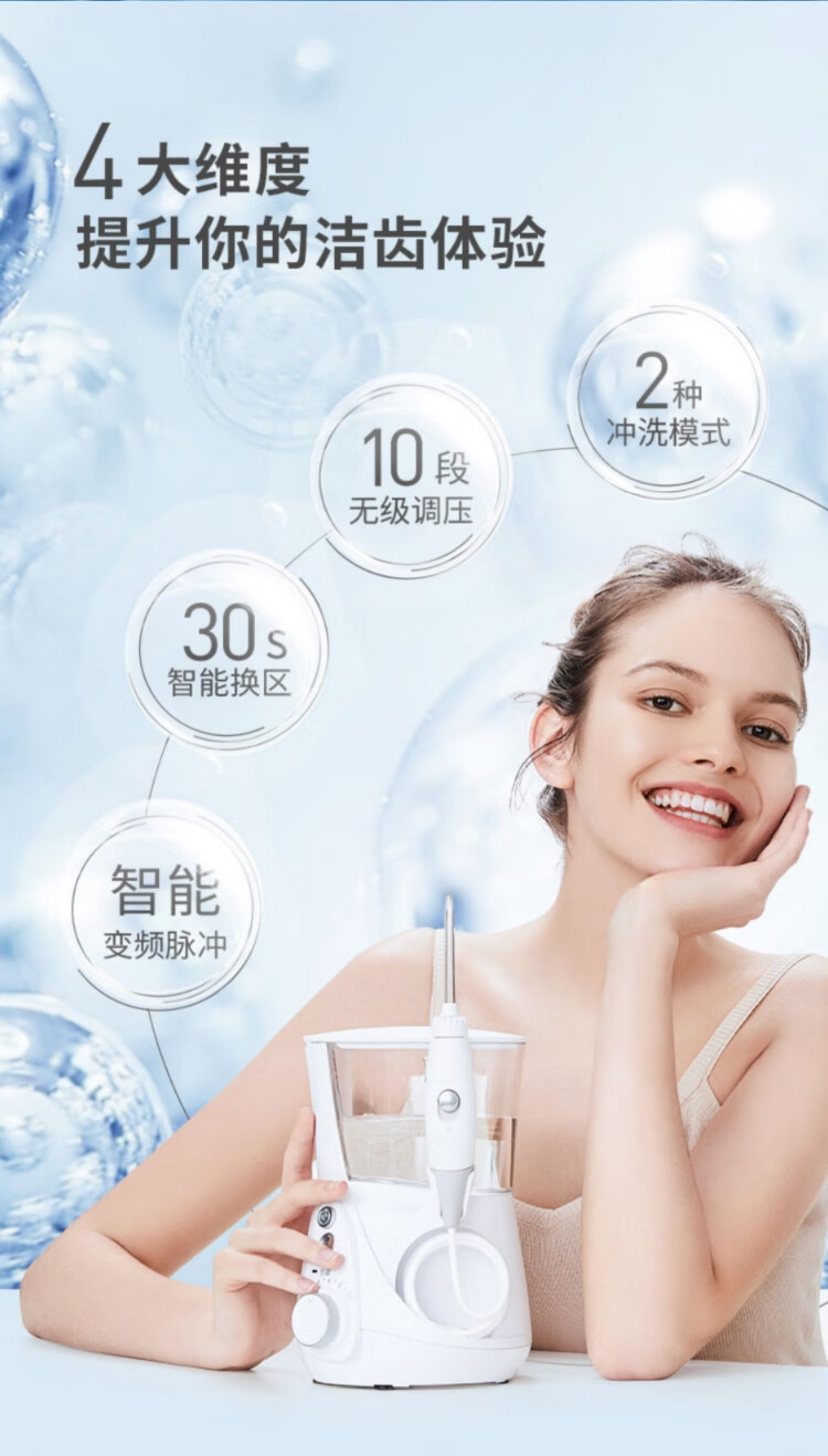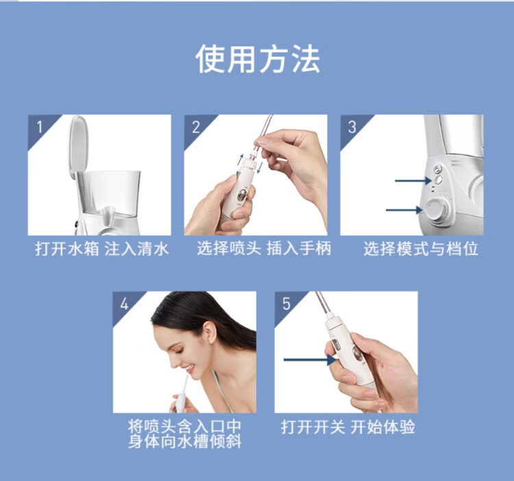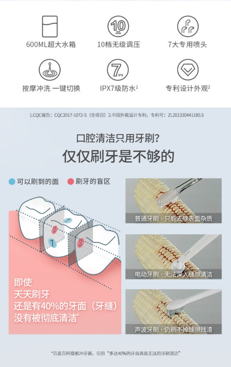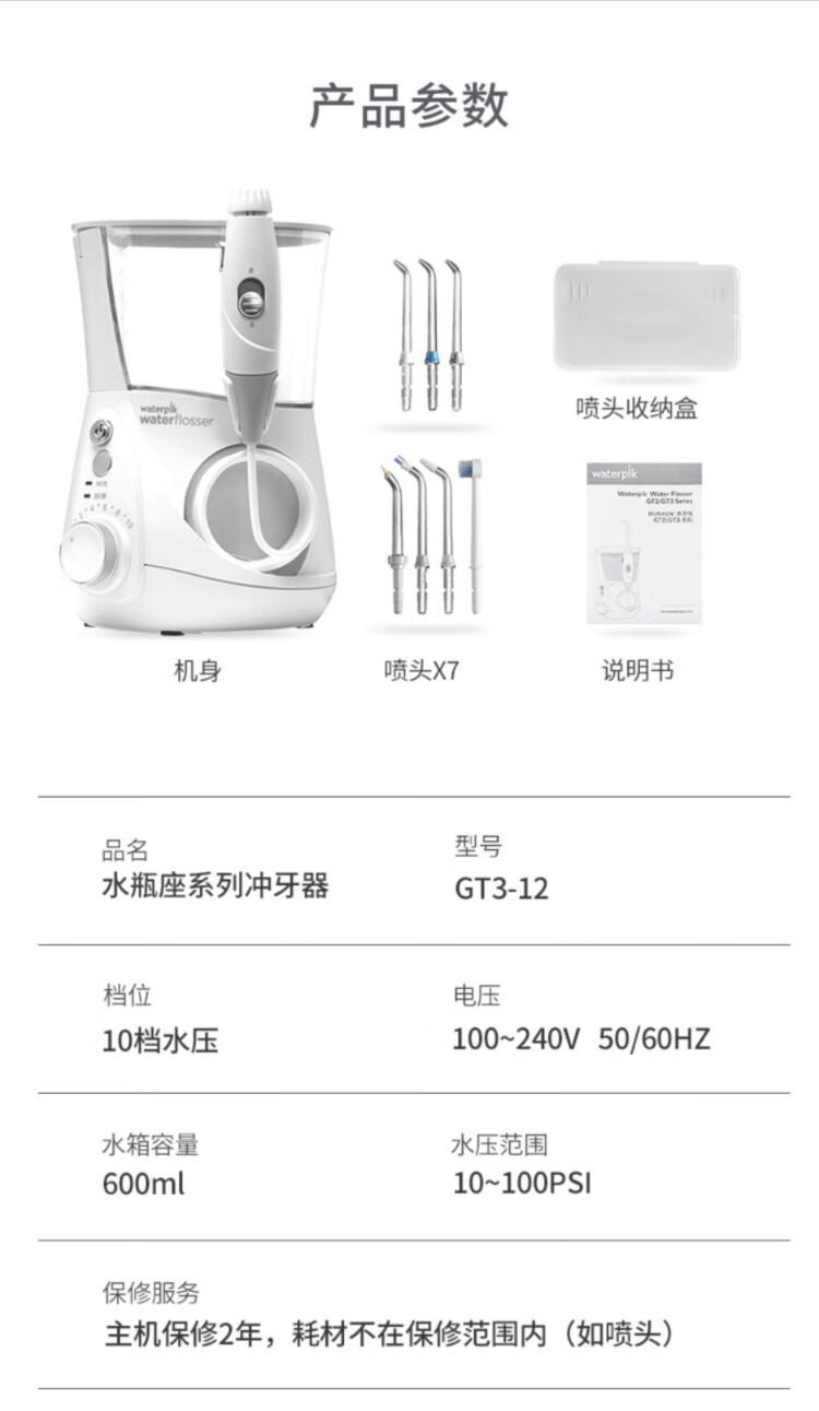 喷头:喷头*7(标准喷头*3+、正畸喷头*1、牙菌斑喷头*1、牙周袋喷头*1、牙刷喷头*1)