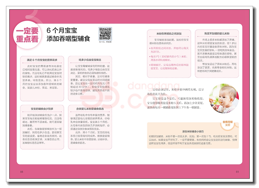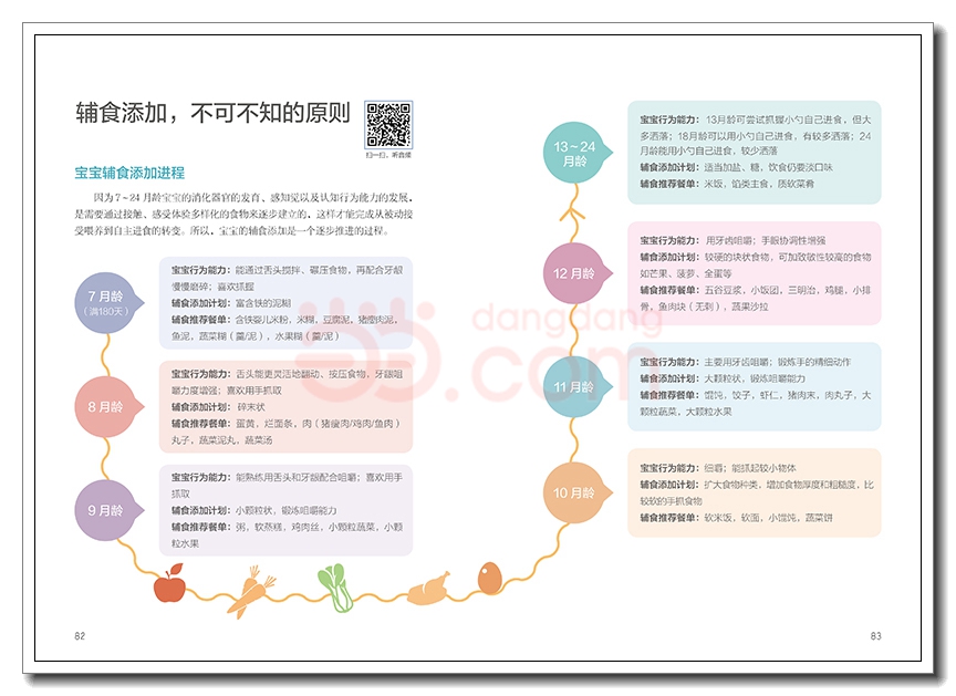 PART4 辅食添加 按月龄和发育吃对每一口辅食辅食添加,不可不知的原则添加辅食后如何应对宝宝不爱吃奶一定要重点看:6 个月宝宝添加吞咽型辅食宝宝辅食推荐婴儿米粉 / 胡萝卜米粉 / 南瓜米糊双米糊 / 红薯米糊 / 圆白菜米糊土豆米糊 / 雪梨藕粉糊 / 苋菜泥红薯泥 / 番茄泥 / 苹果蓉一定要重点看:7 ~ 8 个月宝宝添加蠕嚼型辅食宝宝辅食推荐西蓝花土豆泥 / 红薯小米粥 / 红枣核桃米糊黑芝麻大米粥 / 油菜蛋黄蒸豆腐 / 荠菜粥菠菜鸭肝泥 / 鸡肉青菜粥 / 菠菜蛋黄粥猪肝蛋黄粥 / 苹果金团 / 香蕉粥一定要重点看:9 ~ 10 个月宝宝添加细嚼型辅食宝宝辅食推荐三角面片 / 芹菜二米粥 / 小白菜洋葱粥二米山药粥 / 玉米胡萝卜粥 / 栗子蔬菜粥牛肉末粥 / 鸡丝粥 / 紫菜鸡蛋粥蛋黄豌豆糊 / 鱼肉泥 / 苹果胡萝卜小米粥五彩饭团 / 红薯酸奶 / 黑芝麻花生糊番茄肝末汤 / 黄花菜瘦肉粥 / 牡蛎南瓜羹一定要重点看:11 ~ 12 个月宝宝添加咀嚼型辅食宝宝辅食推荐豆腐菠菜软饭 / 南瓜白菜粥 / 花豆腐肉末胡萝卜黄瓜丁 / 鲜汤小饺子 / 冬瓜球肉丸什锦烩饭 / 肉末油菜粥 / 双菇烩蛋黄鸭肝粥 / 苹果桂花粥 / 水果蛋奶羹土豆沙拉 / 三彩虾球 / 三彩菠菜素炒三鲜 / 山药木耳炒莴笋 / 蛋黄豆腐羹一定要重点看:13 ~ 18 个月宝宝添加软烂型辅食宝宝辅食推荐枣花卷 / 蔬菜饼 / 爱心饭卷香菇胡萝卜面 / 黑芝麻南瓜饭 / 胡萝卜炒饭三明治 / 白萝卜紫菜汤 / 虾仁菜花油菜?羹 / 红薯蛋挞 / 干贝蒸蛋蛋皮肝卷 / 清蒸基围虾 / 鲜虾烧卖水晶虾仁 / 鲜虾蛋羹 / 鲜果酸奶捞一定要重点看:19 ~ 24 个月宝宝独立用勺吃饭宝宝辅食推荐玉米面发糕 / 小猫红薯山药泥 / 核桃南瓜玉米浆奶油菠菜 / 三鲜小馄饨 / 猪肉葱香饼肉末豇豆手擀面 / 五彩煎蛋 / 香菇蒸蛋水果豆腐 / 水果沙拉 / 蛋皮鱼卷黄瓜镶肉 / 萝卜丝拌鸡肉 / 三色肉丁香干肉丝 / 牛肉蔬菜粥 / 清蒸狮子头专题 辅食喂养咨询室