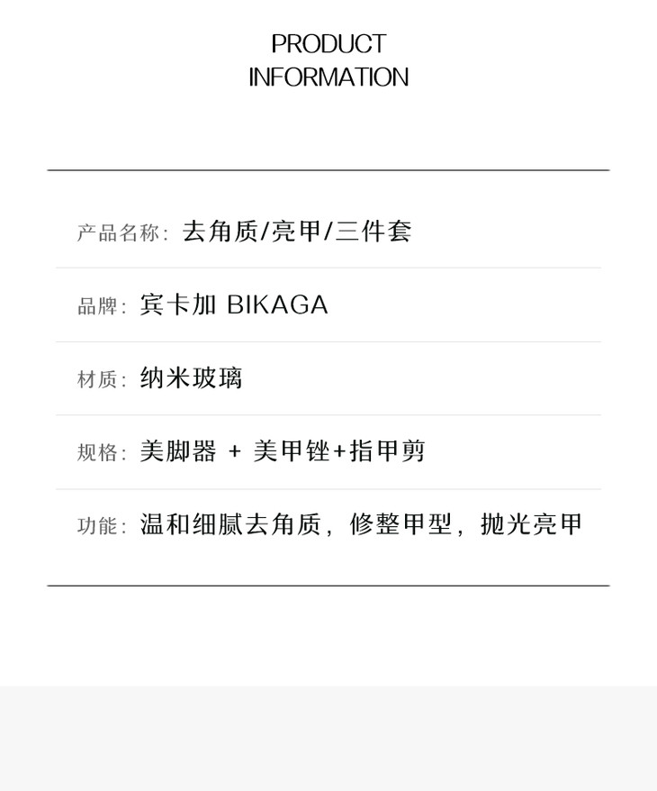 【美甲三件套 3分钟快速美甲】宾卡加BIKAGA美甲去角质三件套 纳米去角质挫、纳米美甲挫、不飞溅指甲剪