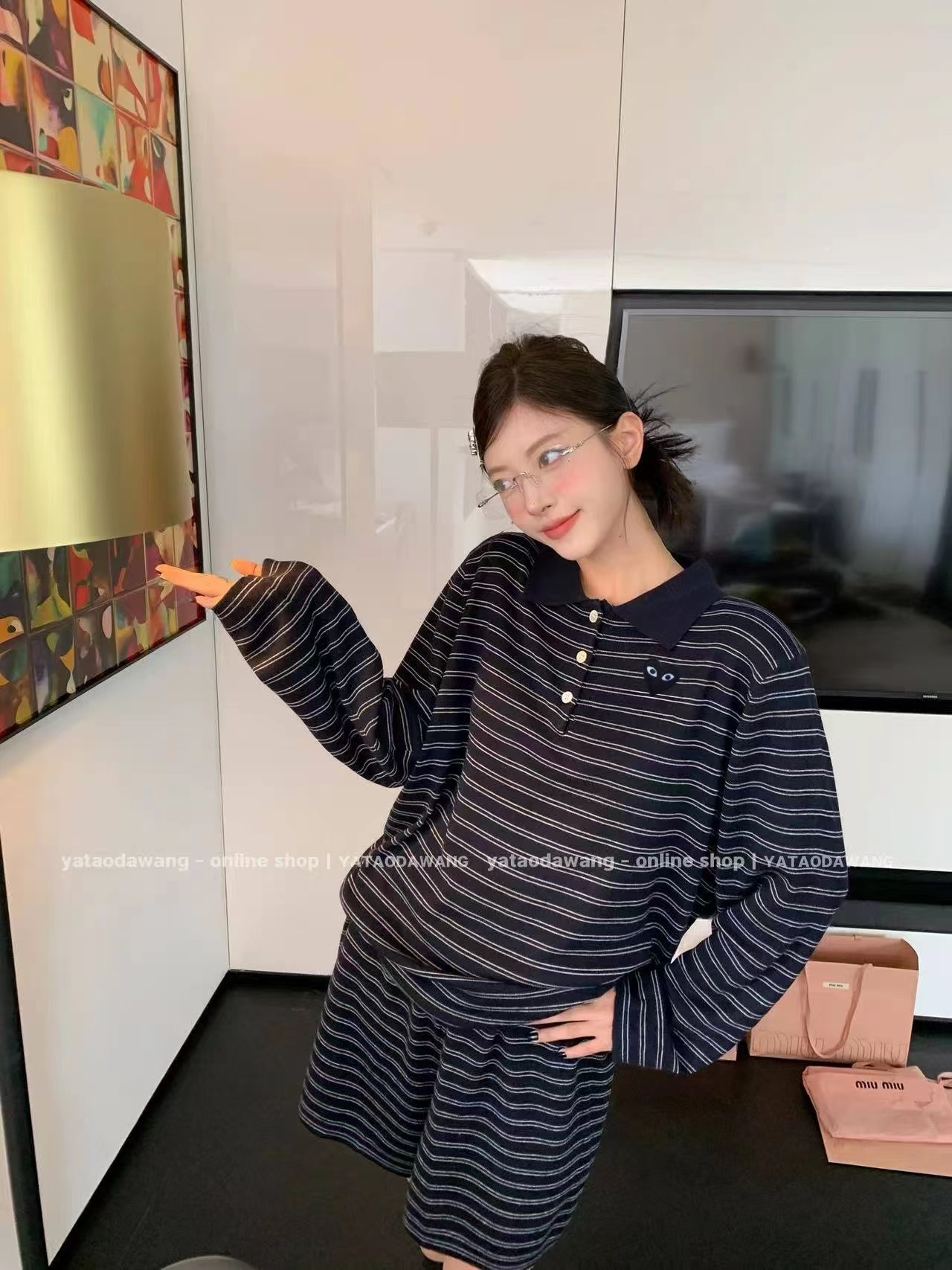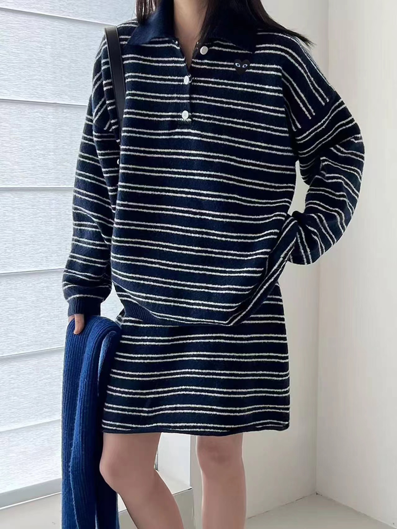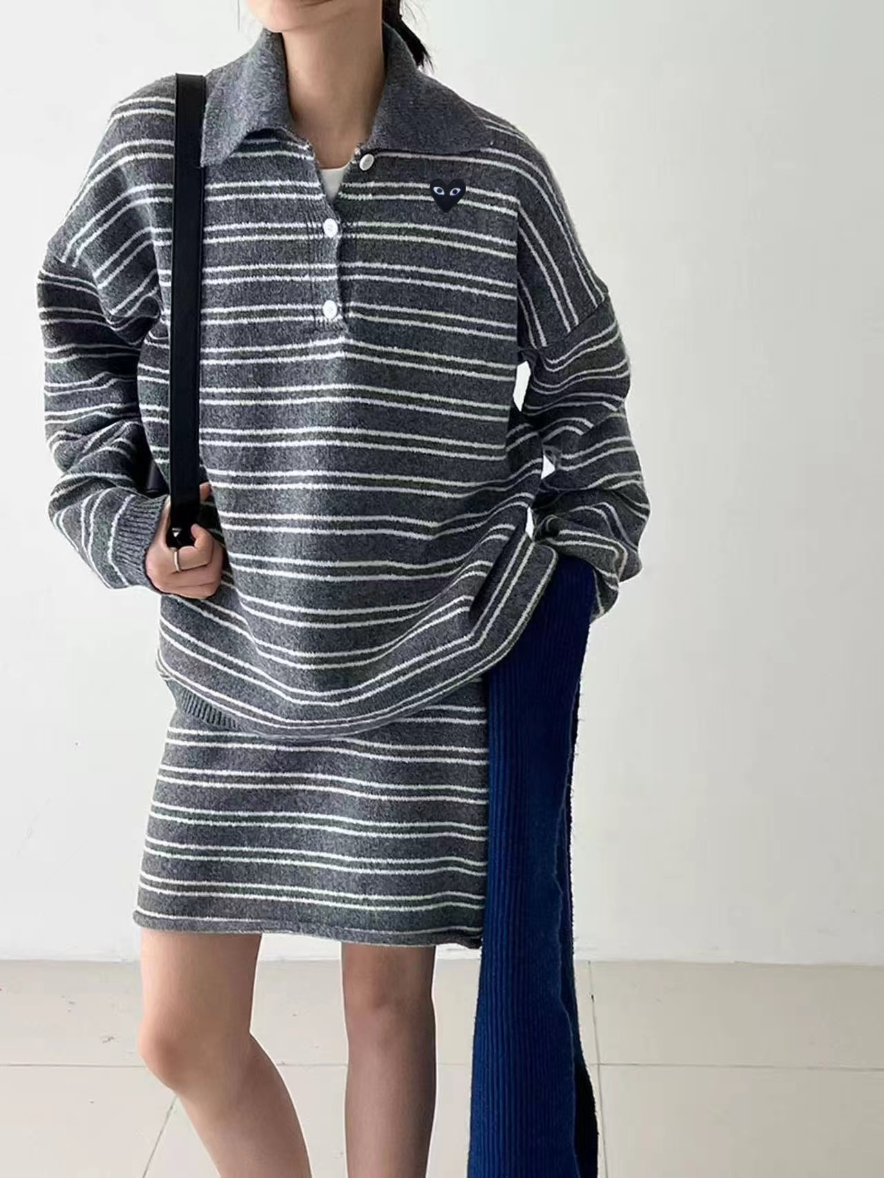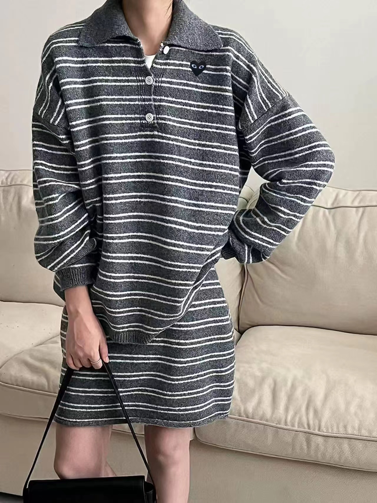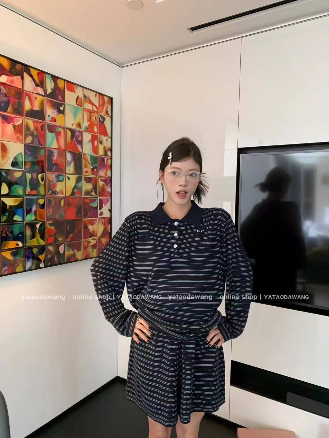 条纹针织套装休闲慵懒的韩系通勤风,宽松版型兼顾舒适与时髦感,一套穿搭省心又显气质。细密白色横条纹,视觉上显瘦又有层次感 翻领+半开襟纽扣设计,带点复古Polo感,领口露出内搭白边更显jing致 落肩+灯笼袖版型,弱化肩线、修饰手臂线条,对各种肩型都很友好。左胸位置点缀黑色爱心刺绣小标,增添辨识度与可爱感。 同面料同条纹的直筒短裙,长度在大腿中部,利落显腿长。与上衣无缝衔接,整体感强,不用费心搭配下装。针织面料柔软厚实,自带软糯肌理感,秋冬穿着保暖又有垂坠感。配色低调耐看,适配日常通勤、约会、居家等多种场景。