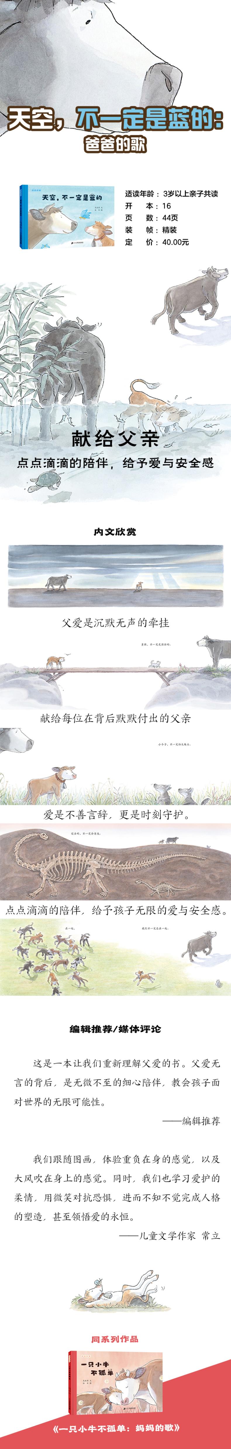 《天空,不一定是蓝的》是一首优美的绘本散文诗,通过朗朗上口的诗歌语言,展现出小牛与父亲的舐犊情深。天空,不一定是蓝的;云朵,不一定是白的;花儿,不一定是红的;叶子,不一定是绿的……文字与图画有趣的互补关系,为小读者打开一个无限可能的世界。巧妙变化的文字,更便于3岁以上小读者阅读和理解。作者用细腻入微的文字、画家用超强的叙事画面,用两条既平行、又相辅相成的创作手法,为读者展现出父亲与孩子之间浓厚的情感,让读者感同身受。