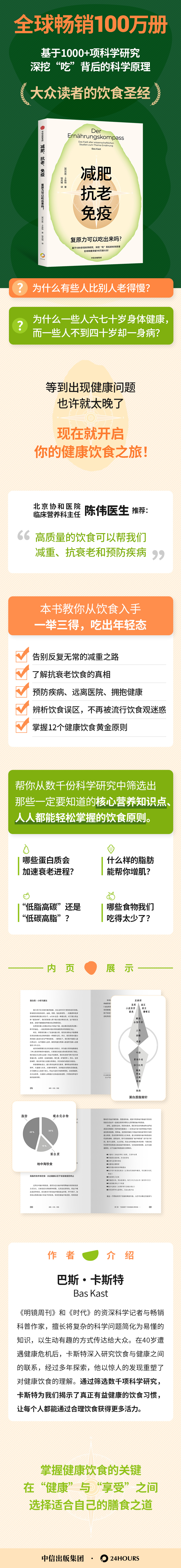 巴斯·卡斯特,著,《明镜》周刊和《时代》的资深科学记者与畅销科普作家,擅长将复杂的科学问题简化为易懂的知识,以生动有趣的方式传达给大众。在40岁遭遇健康危机后,卡斯特深入研究饮食与健康之间的联系,经过多年探索,他以惊人的发现重塑了对健康饮食的理解。通过筛选数千项科学研究,卡斯特为我们揭示了真正有益健康的饮食习惯,让每个人都能通过合理饮食获得更多活力。钱凤楠,译,同济大学德语笔译硕士研究生,德语专业八级,曾获中华笔译大赛、全国多语种口译大赛、省级德语演讲比赛等竞赛奖项。受DAAD(德意志学术交流中心)奖学金资助,赴德国美因茨大学翻译学院进修,期间专注于医学翻译领域,尤其是营养学相关课程。