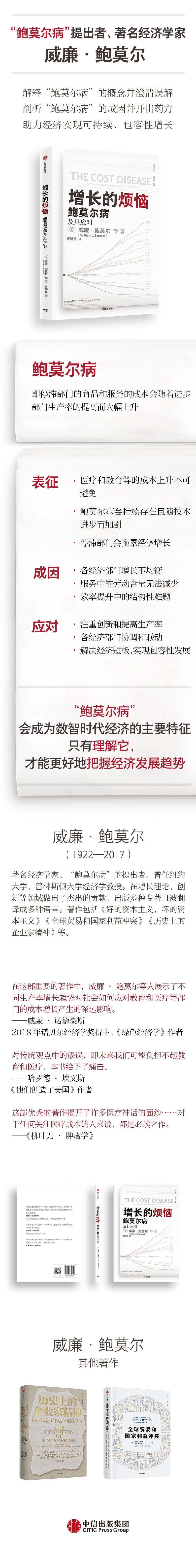 这是一本典的经济学科普读物。“鲍莫尔病”是经济增长的产物,指 “停滞部门”的商品和服务的成本然会随着“进步部门”生产率的提高而大幅上升。该书从这一概念入手,着重分析了医疗和教育这两个成本不断攀升的经济部门。作者认为,这些部门之所以存在严重的“鲍莫尔病”,是因为其商品和服务包含的劳动成分很难在不降低数量和质量的情况下减少。