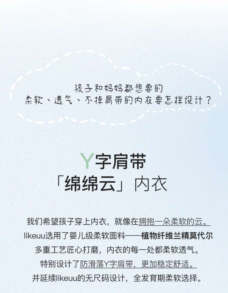 - likeuu是专注于为6~15岁的青少年创造柔软、无束缚的成长体验,以好奇心为灵感的成长发育期贴身衣物品牌。likeuu的产品覆盖内衣、内裤、保暖衣、家居服、运动等品类。
