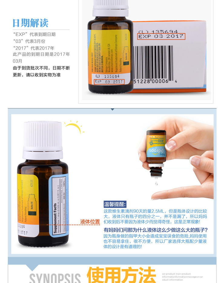 美国Ddrops婴幼儿补钙VD维生素D3滴剂 2.5ml