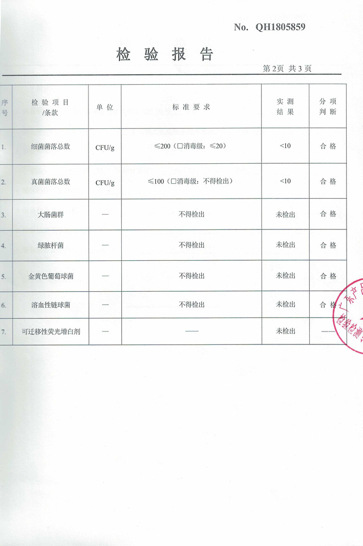 四项微生物、游离甲醛、可迁移性荧光增白剂均未检出;
