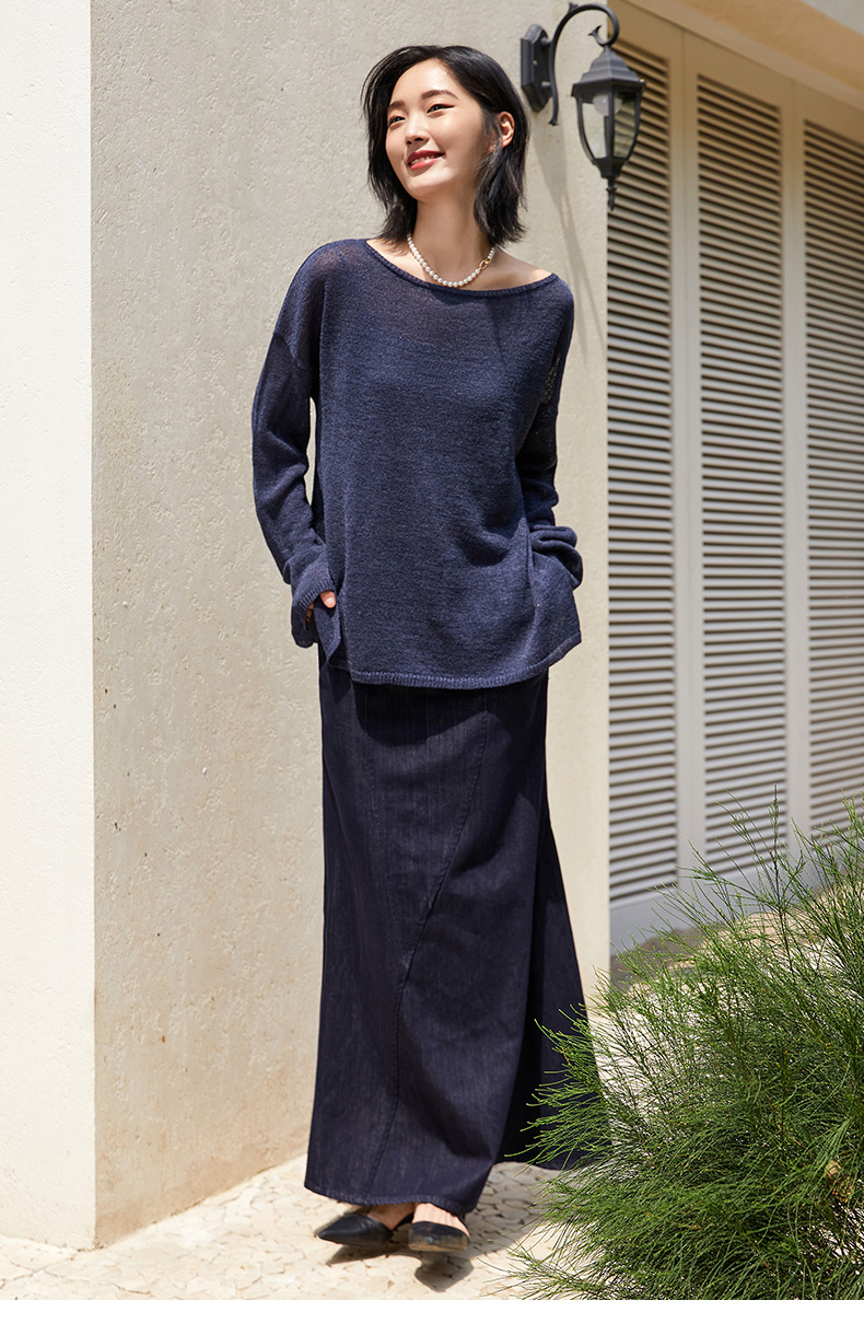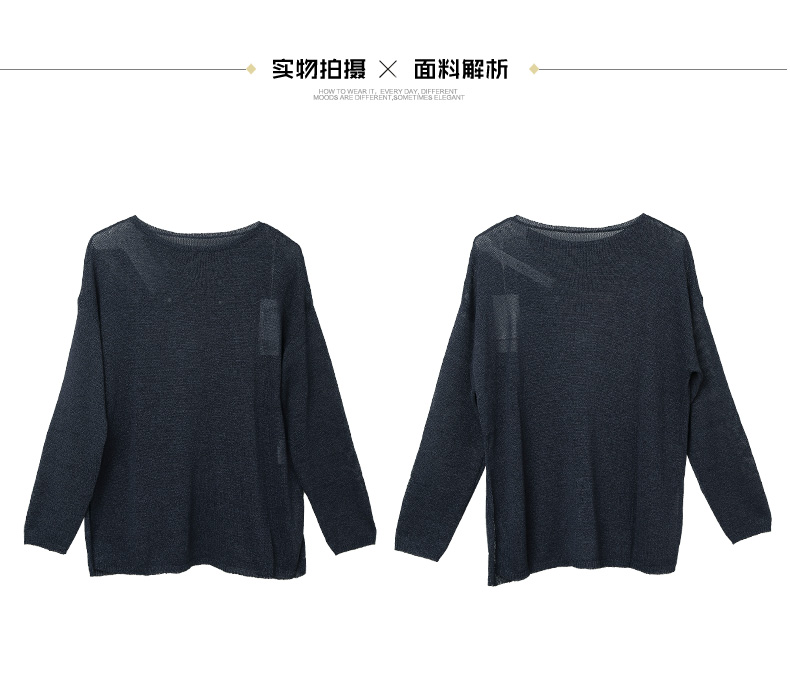 气质慵懒风藏蓝色露肩毛衫女 宽松长袖百搭针织上衣