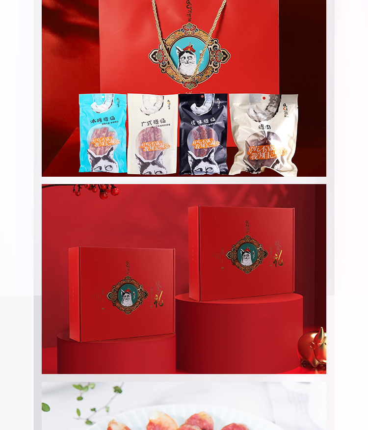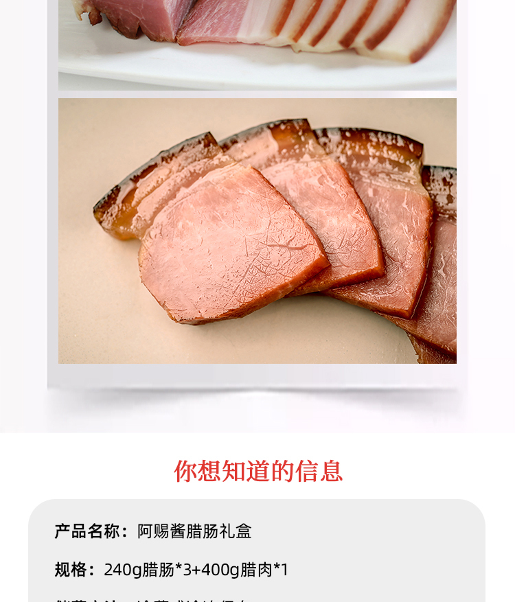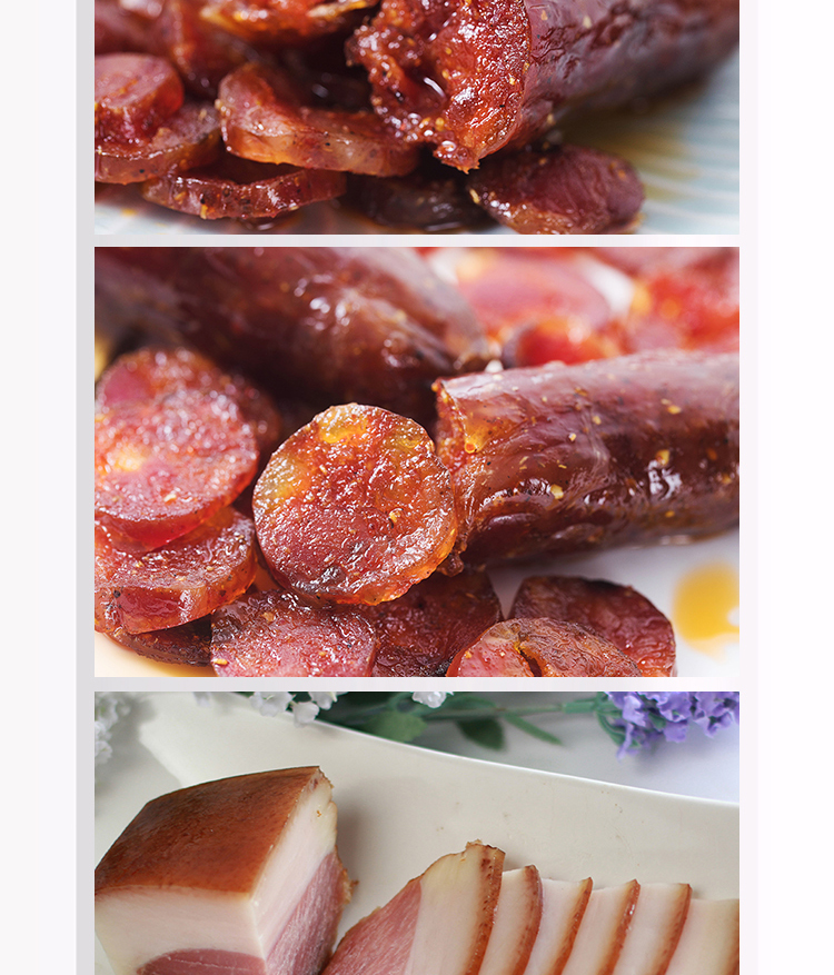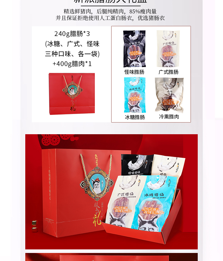 【礼盒内容】大礼盒:腊肠240g*3袋(广式240g、冰糖240g、怪味240g)+腊肉400g/袋