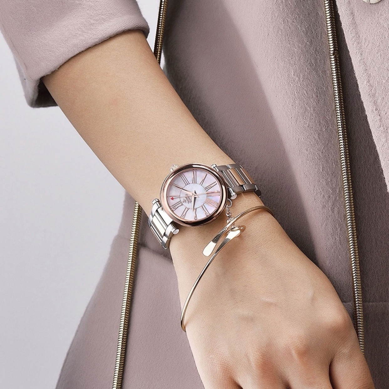 贝母色表盘在光线照射下呈现独特光泽与纹理,高贵典雅。表盘上12点位的浮雕土星标志,搭配罗马数字时标,指针上还做了爱心图案,简约又个性。