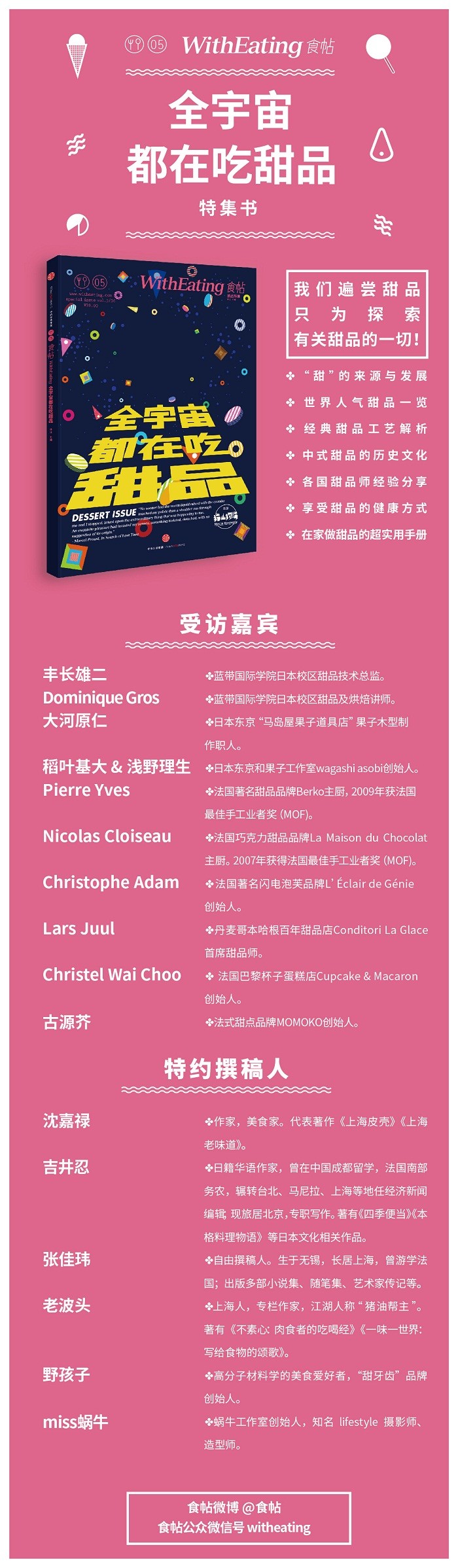 《食帖05:全宇宙都在吃甜品》是食帖品牌第5本纸质出版物,以“甜品”为主题,探寻甜味的来源,解读“糖”的文化,通览世界各地代表性甜品,专访世界知名甜品匠人,详细介绍多款经典甜品的正宗制作方法,以及关于如何在“甜”与“健康”中获得平衡,健康享受甜品的特别企划。