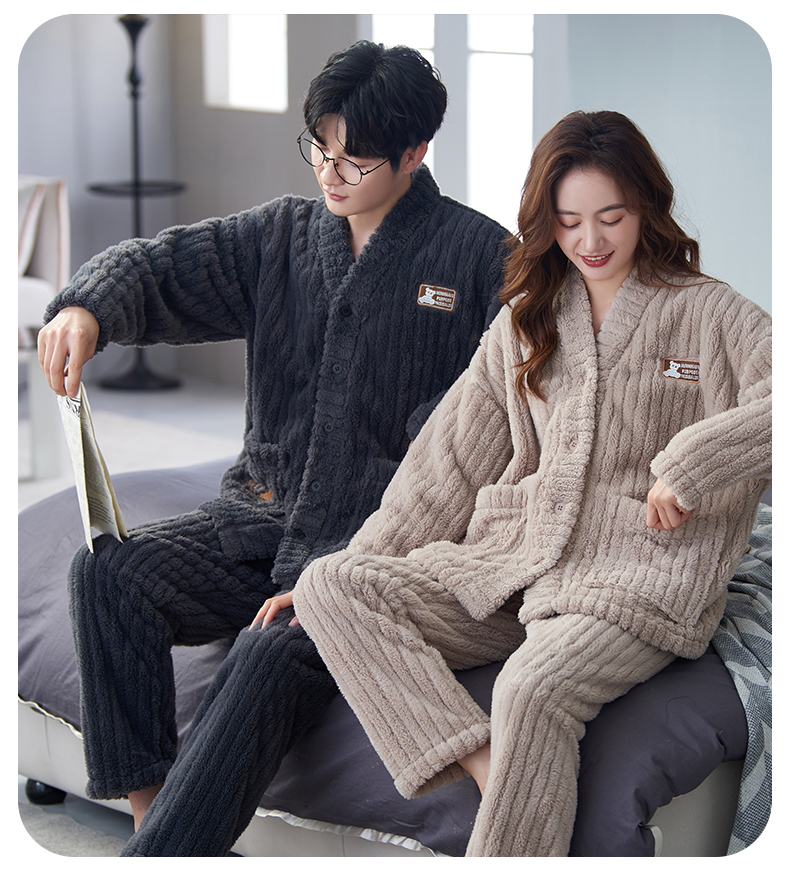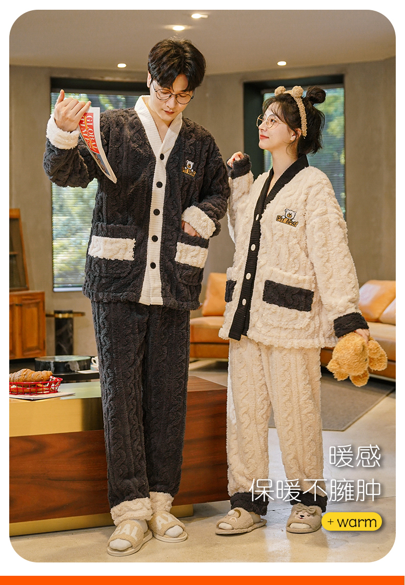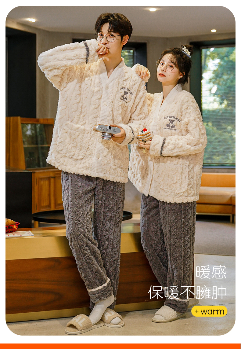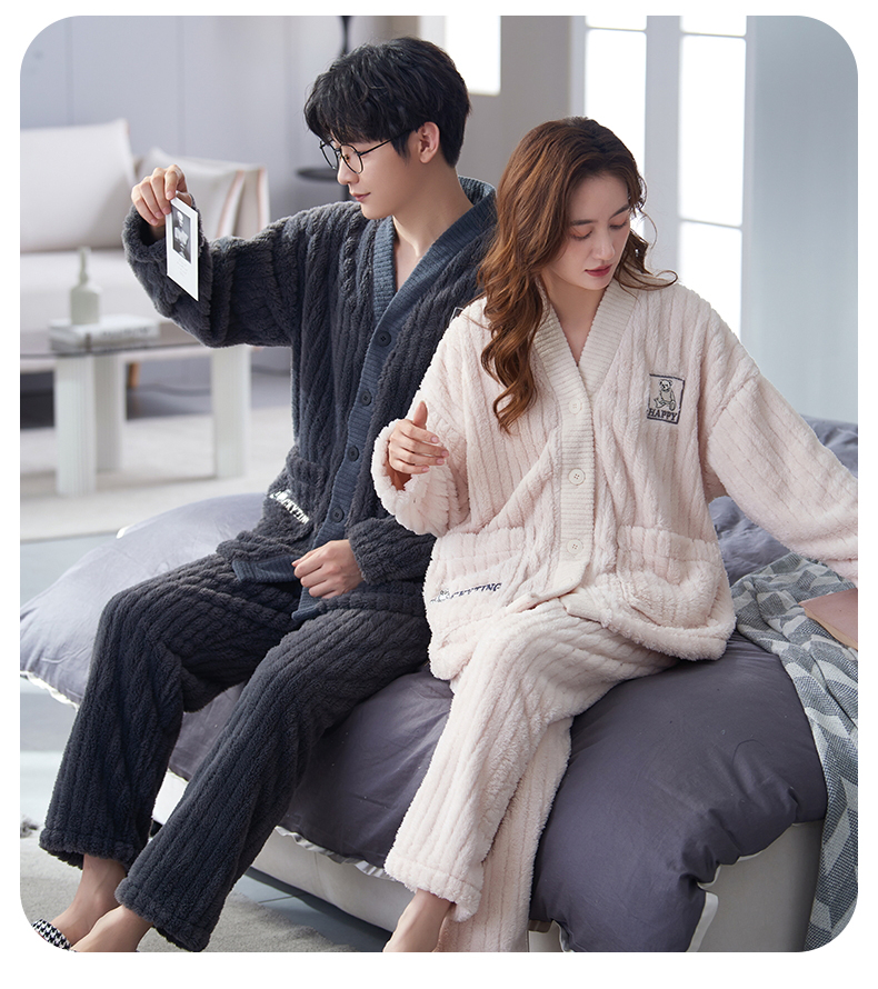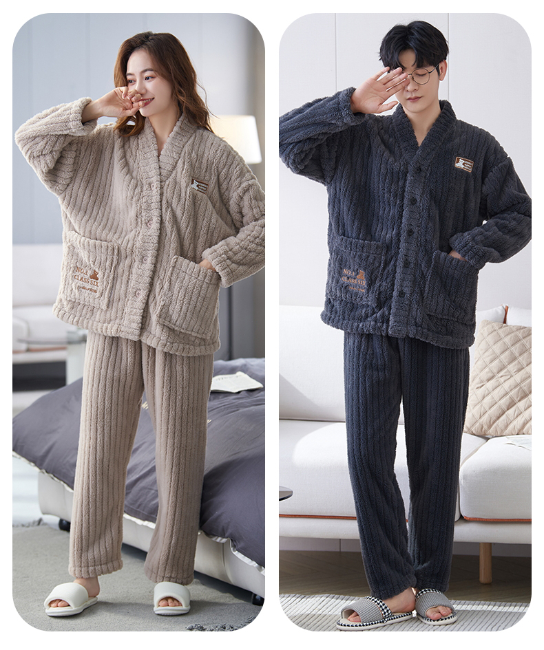 【9个款式任选情侣家居服】简约大方休闲保暖V领开衫情侣睡衣套装可外穿加厚珊瑚绒男女同款