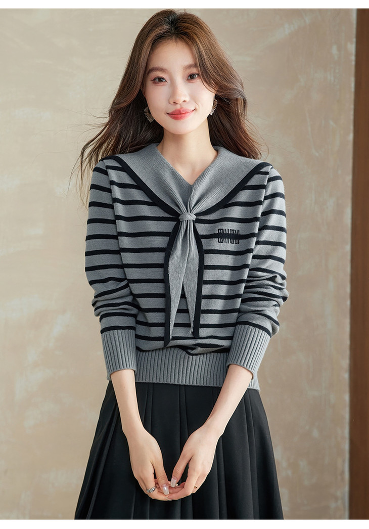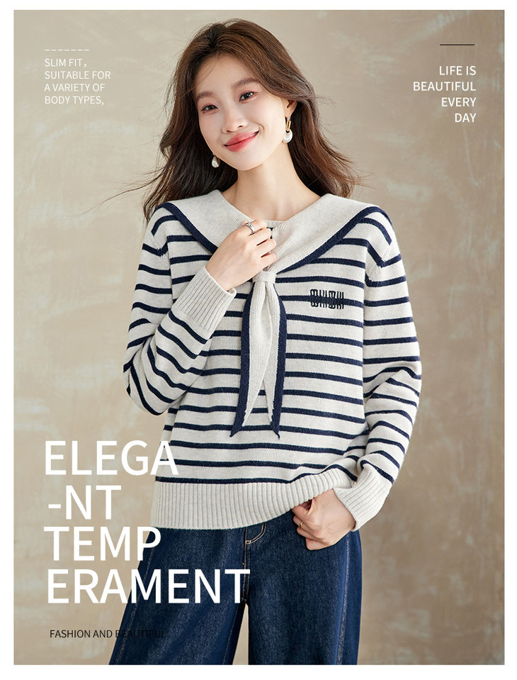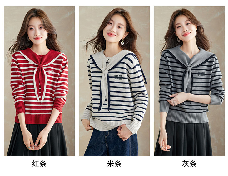 海军领条纹针织衫,慵懒风蝴蝶结长袖上衣显瘦毛衣打底衫CC-XFY-3201