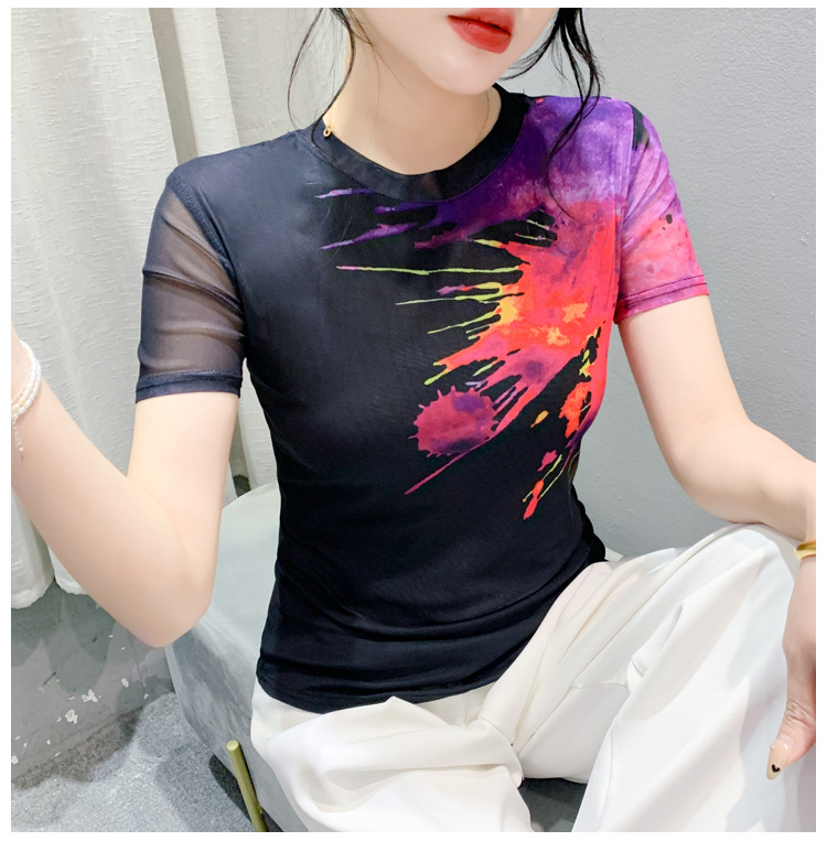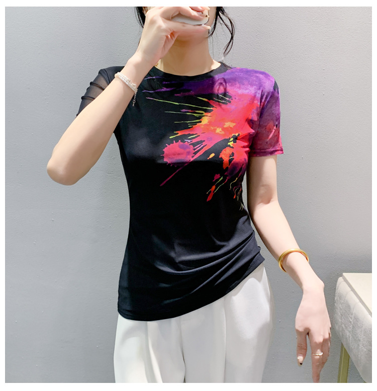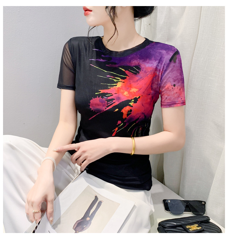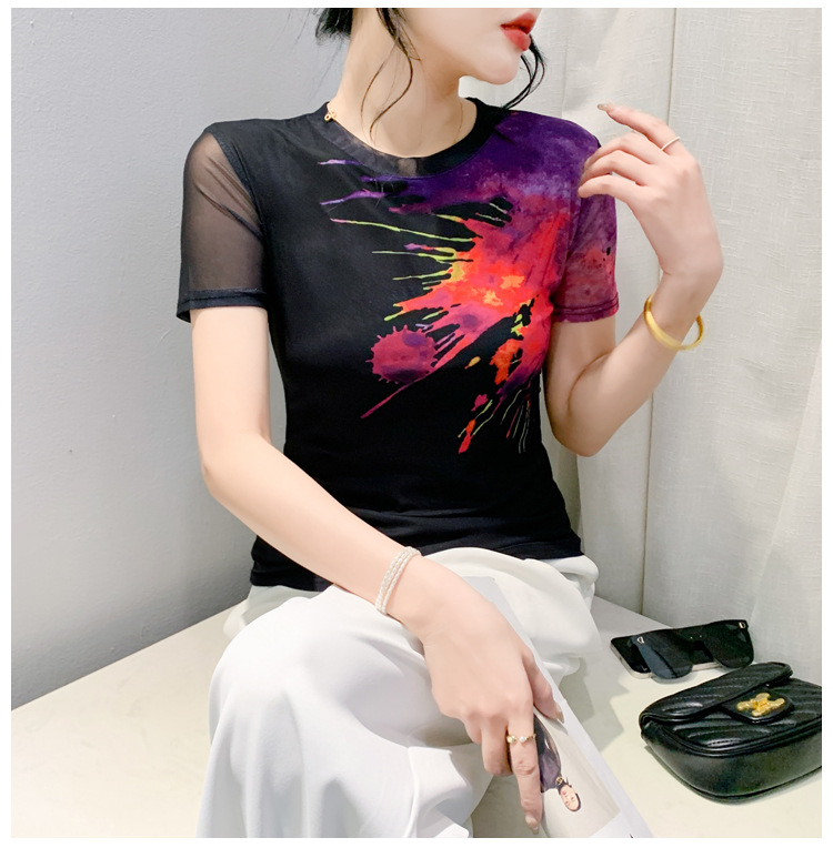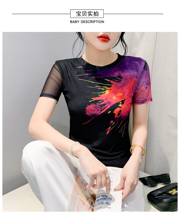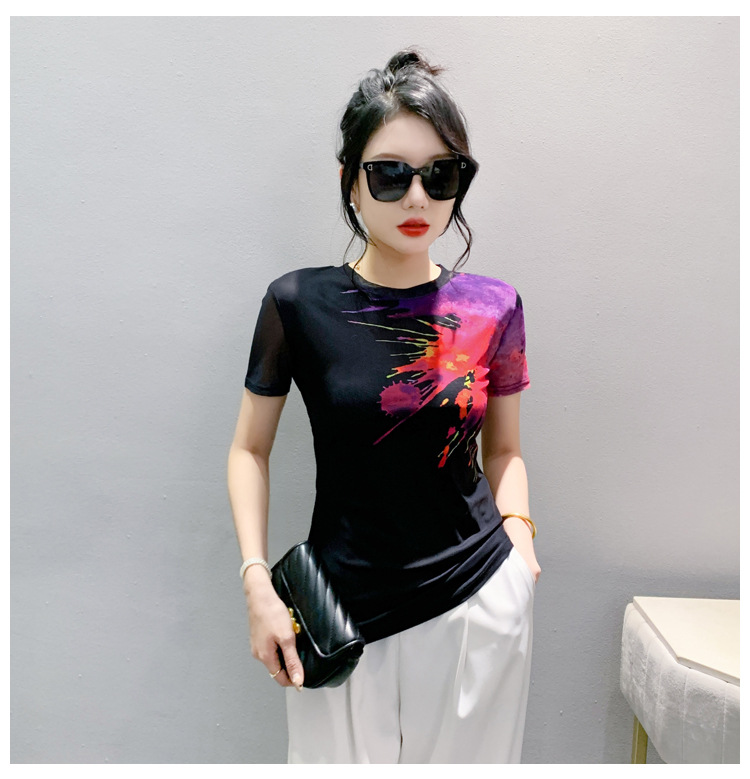 时尚纱网印花定位花,短袖圆领修身显瘦洋气上衣KQL-a55f8153
